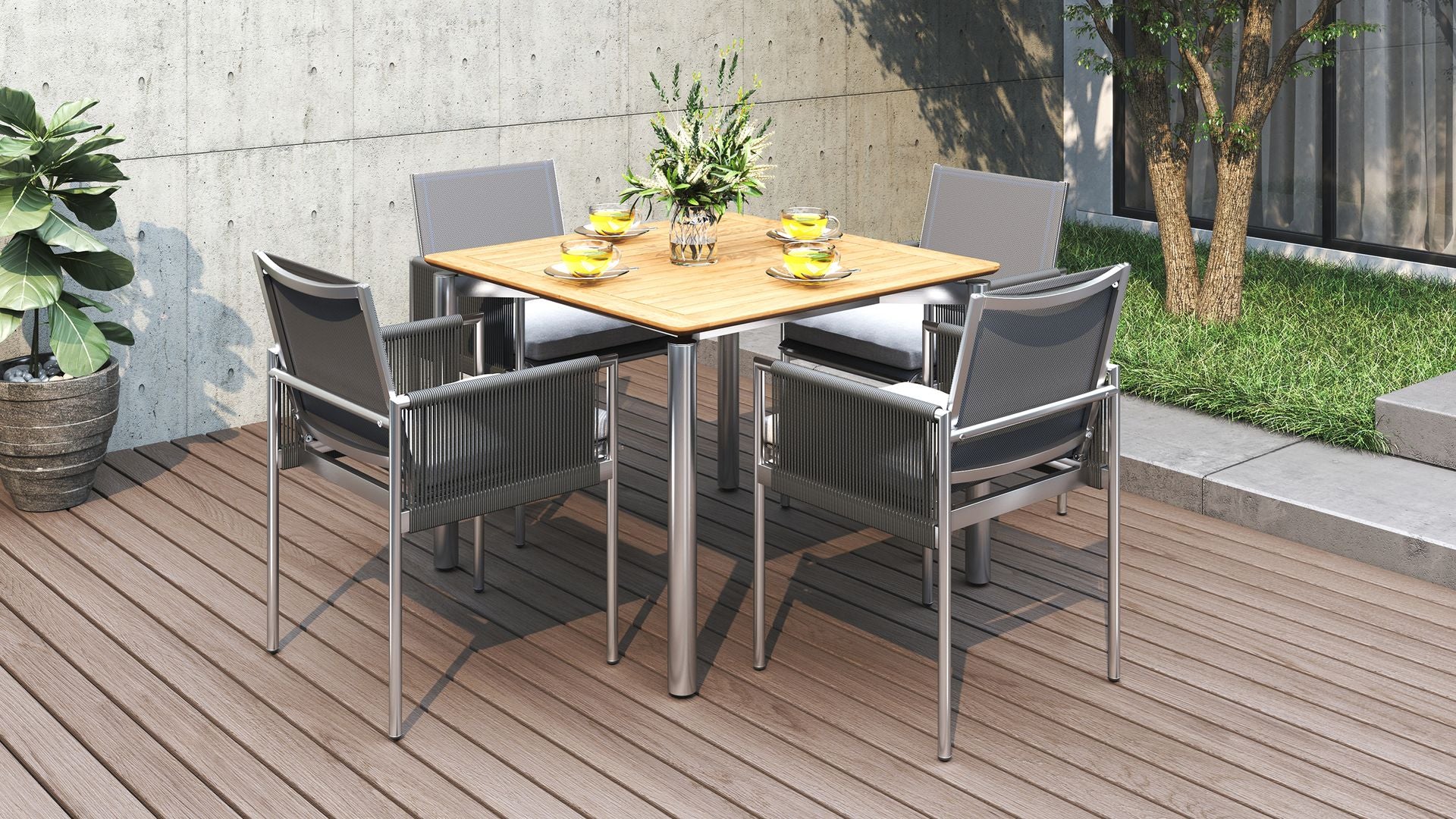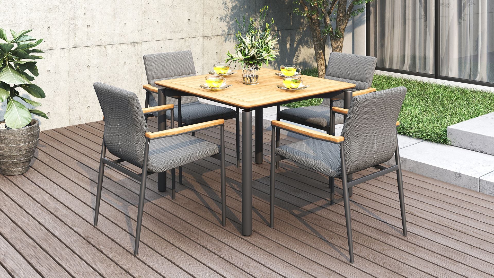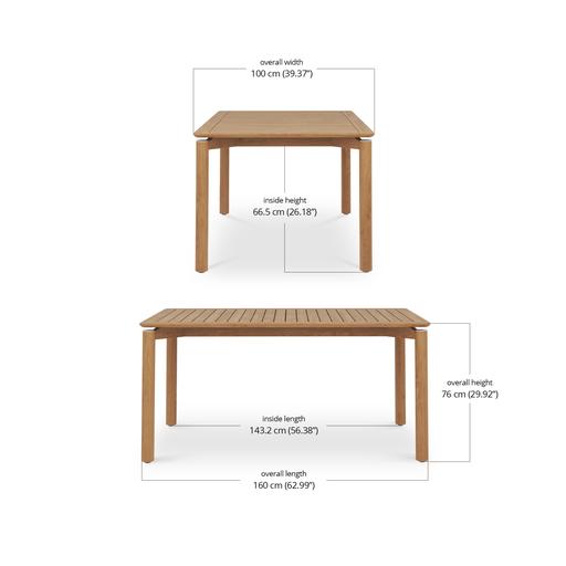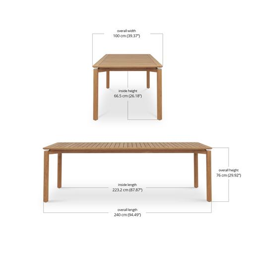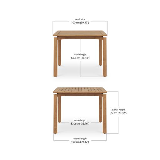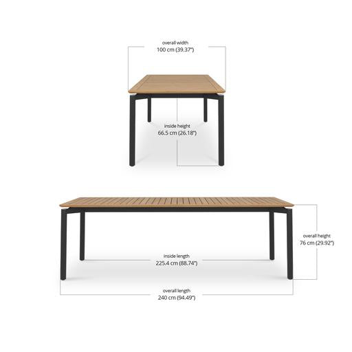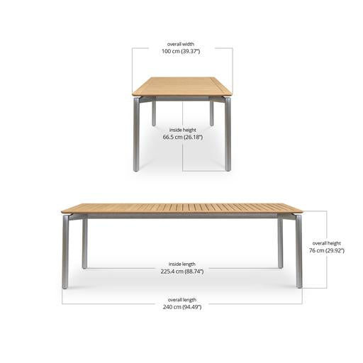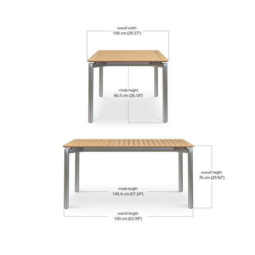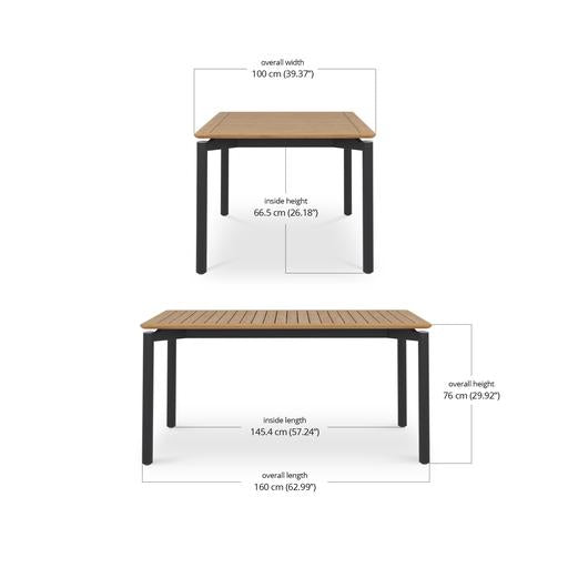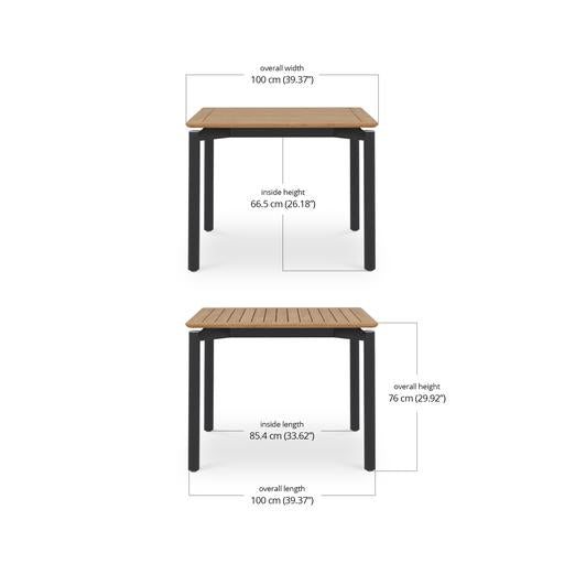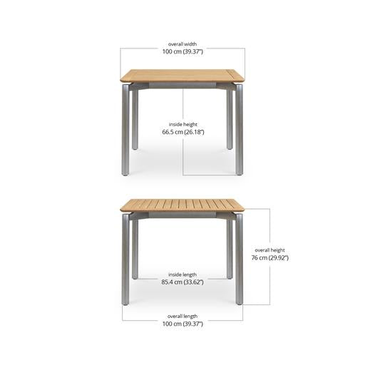 It comes in three sizes to suit your setup: a square 1 metre option, a 1.6 metre rectangle and a generous 2.4 metre length for when the guest list keeps growing. Each version is 1 metre wide, giving everyone a bit of breathing room. Choose from three leg options, including powder-coated aluminium, powder-coated stainless steel or solid teak.