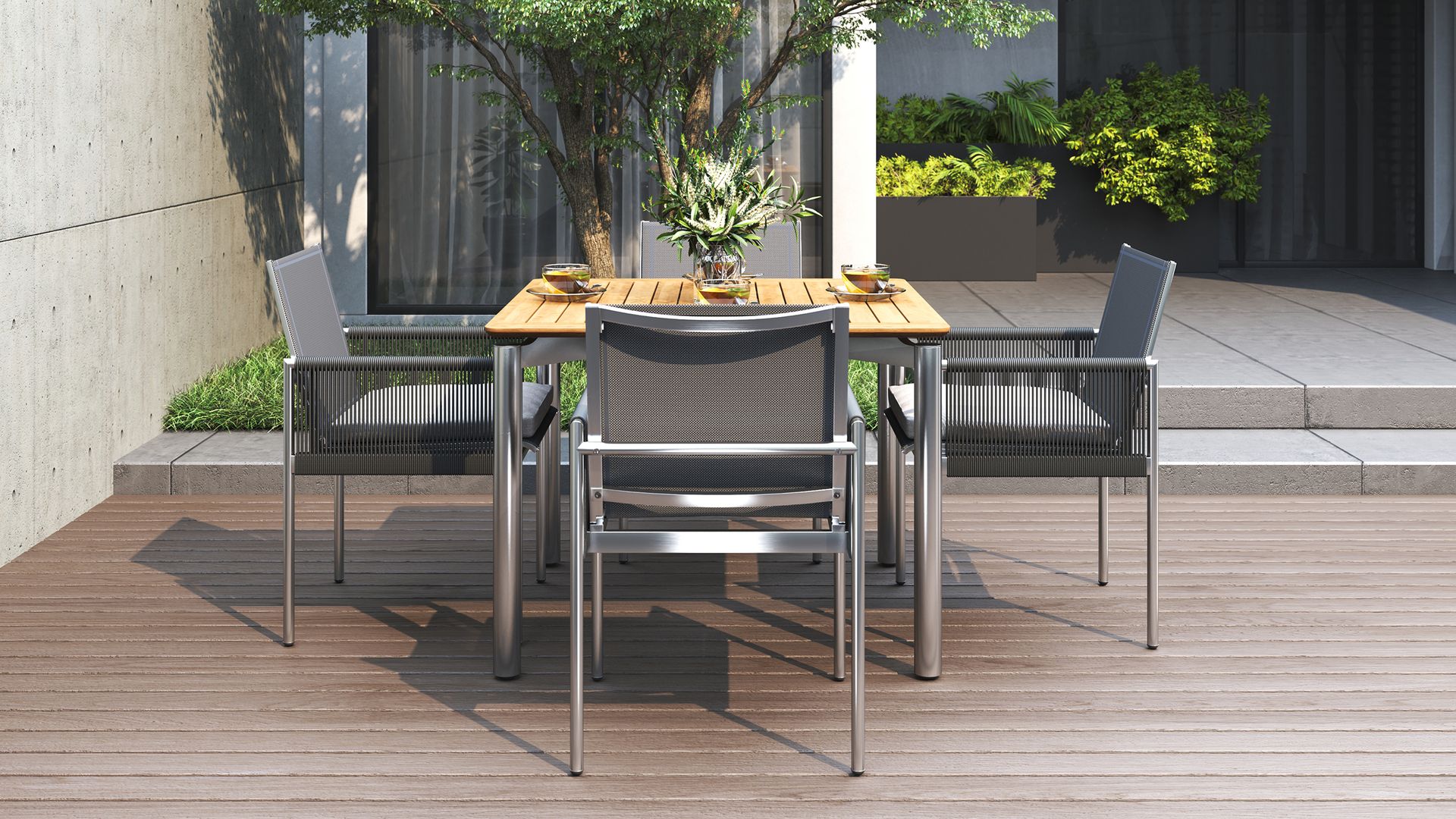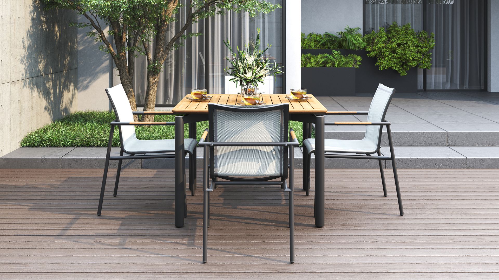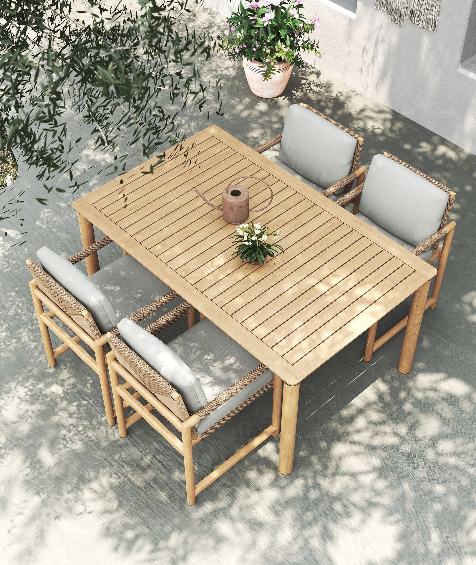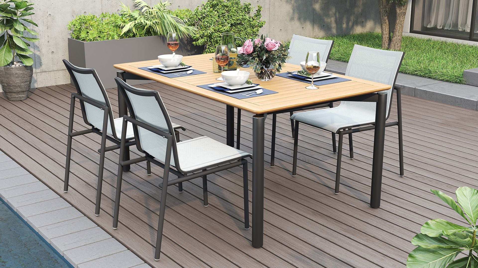 It comes in three sizes to suit your setup: a square 1 metre option, a 1.6 metre rectangle and a generous 2.4 metre length for when the guest list keeps growing. Each version is 1 metre wide, giving everyone a bit of breathing room. Choose from three leg options, including powder-coated aluminium, powder-coated stainless steel or solid teak.