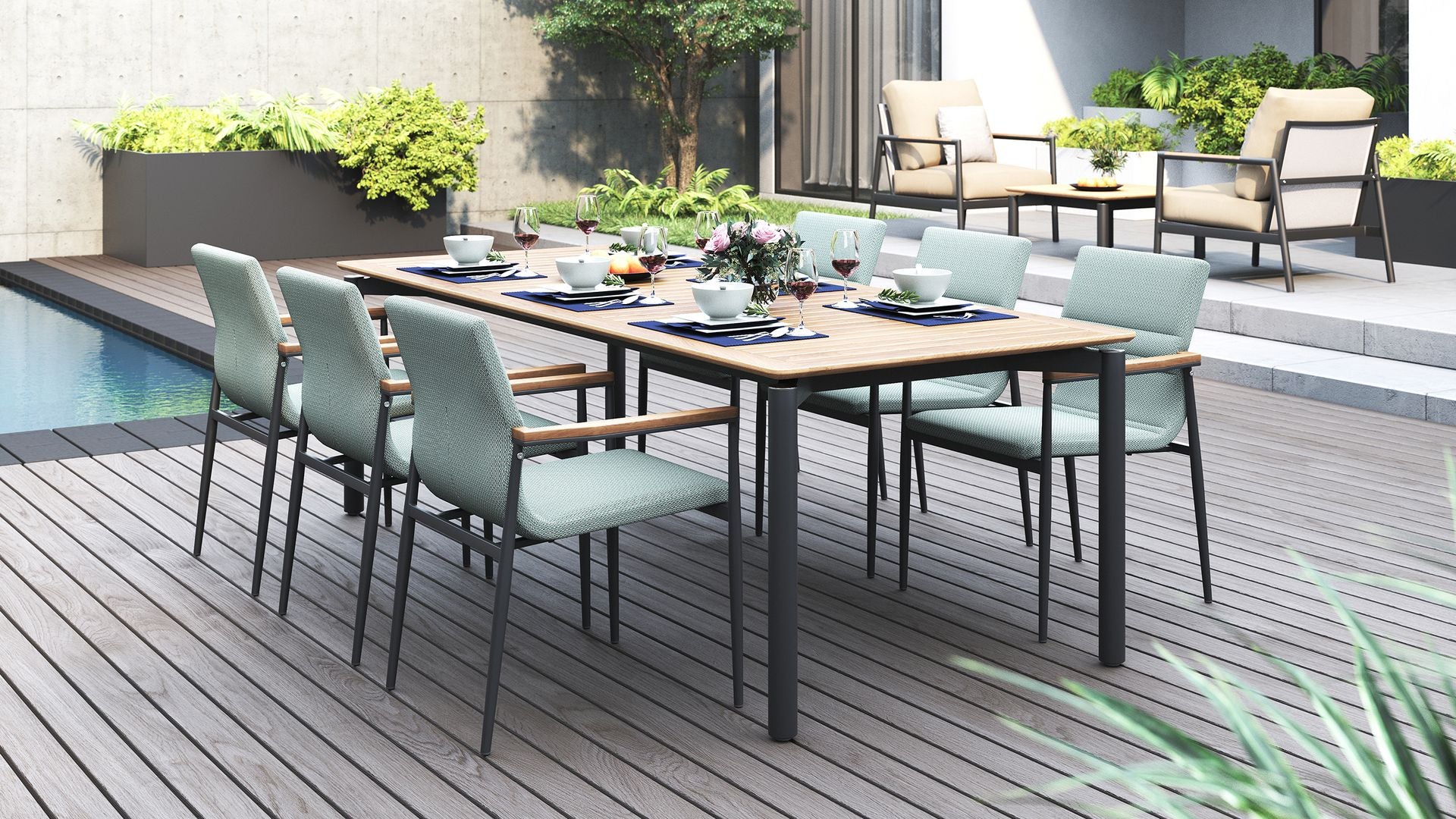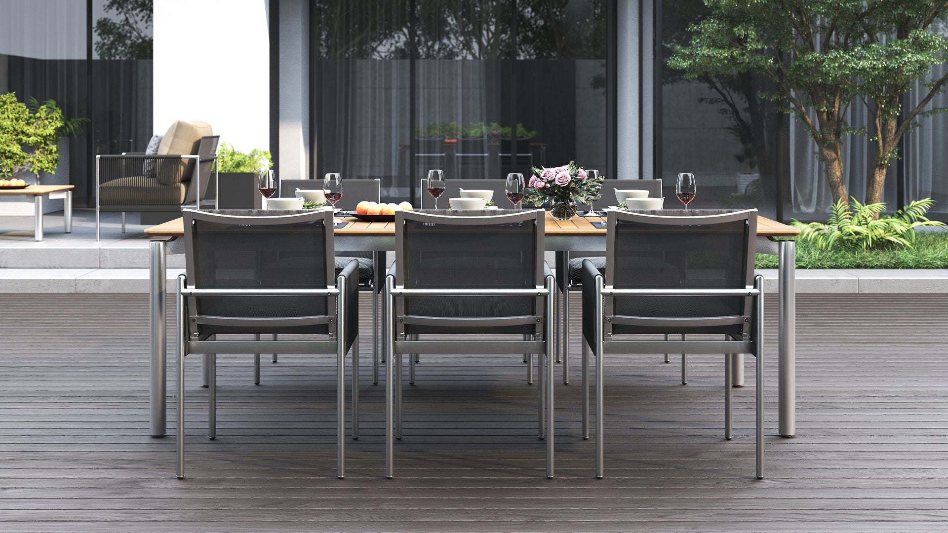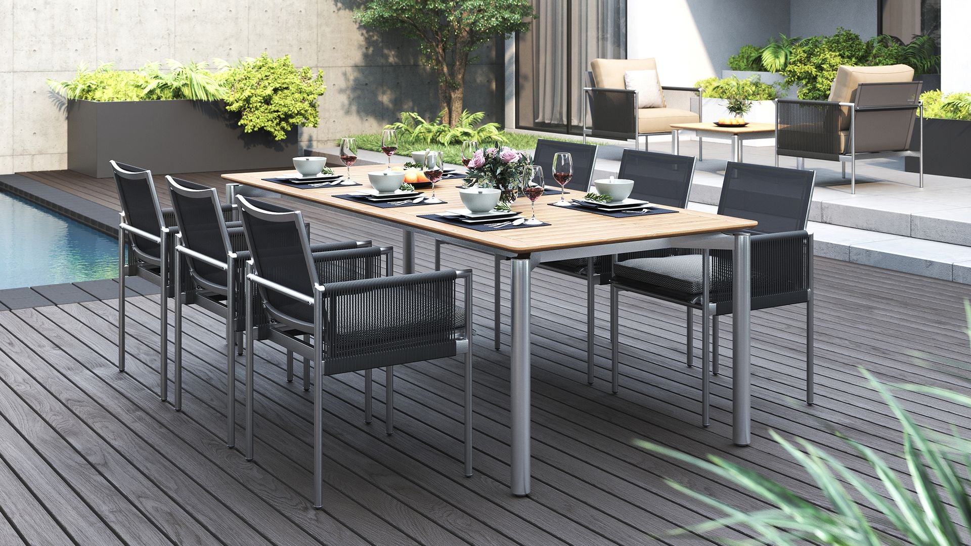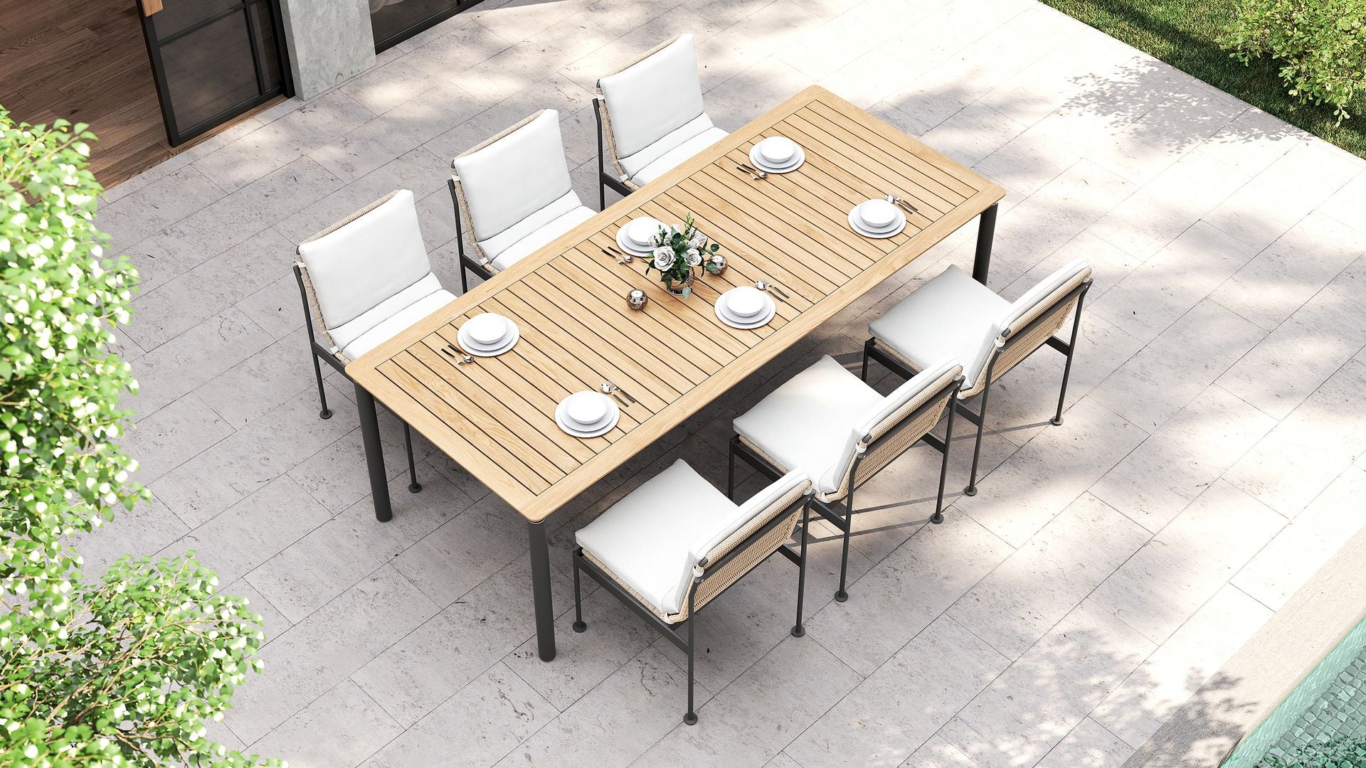 It comes in three sizes to suit your setup: a square 1 metre option, a 1.6 metre rectangle and a generous 2.4 metre length for when the guest list keeps growing. Each version is 1 metre wide, giving everyone a bit of breathing room. Choose from three leg options, including powder-coated aluminium, powder-coated stainless steel or solid teak.