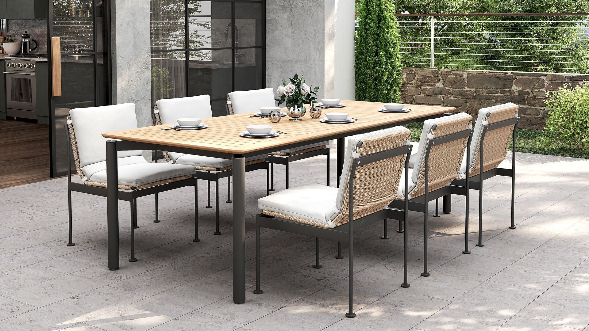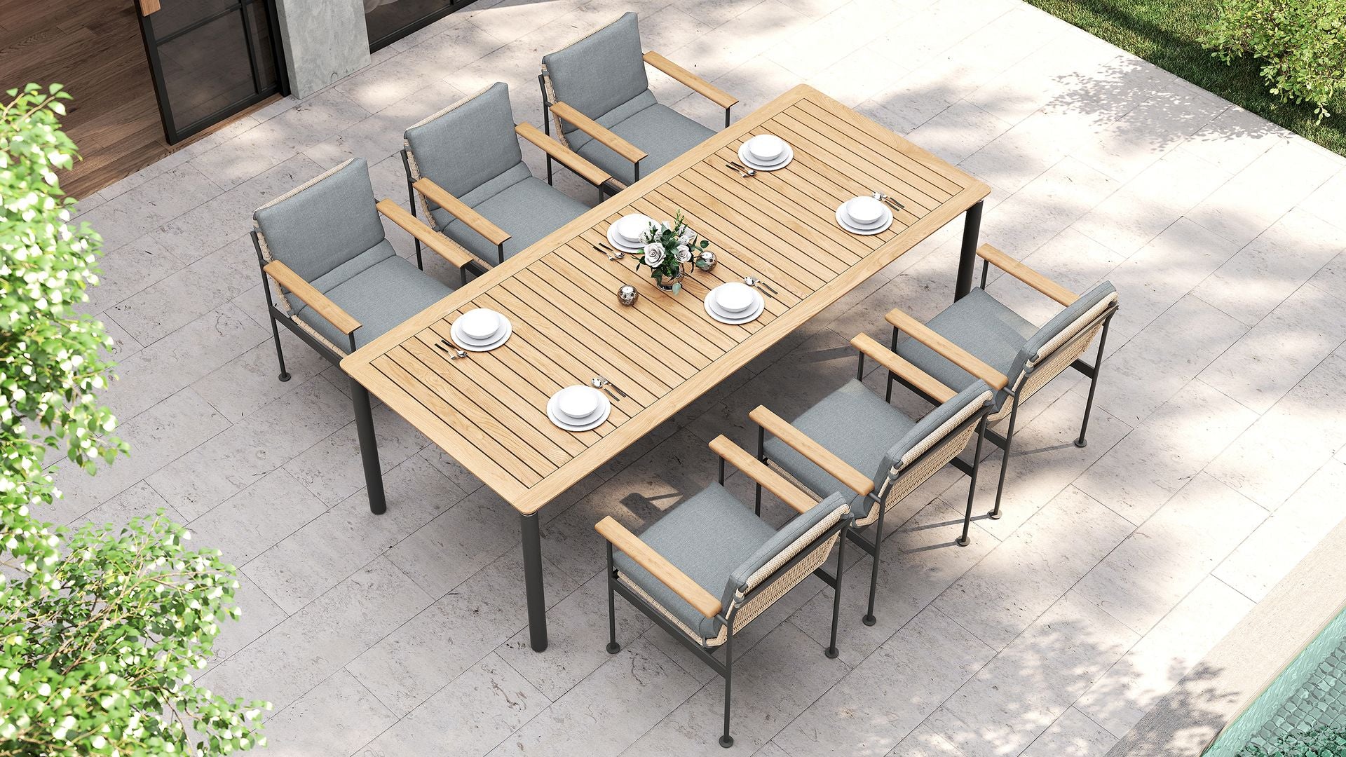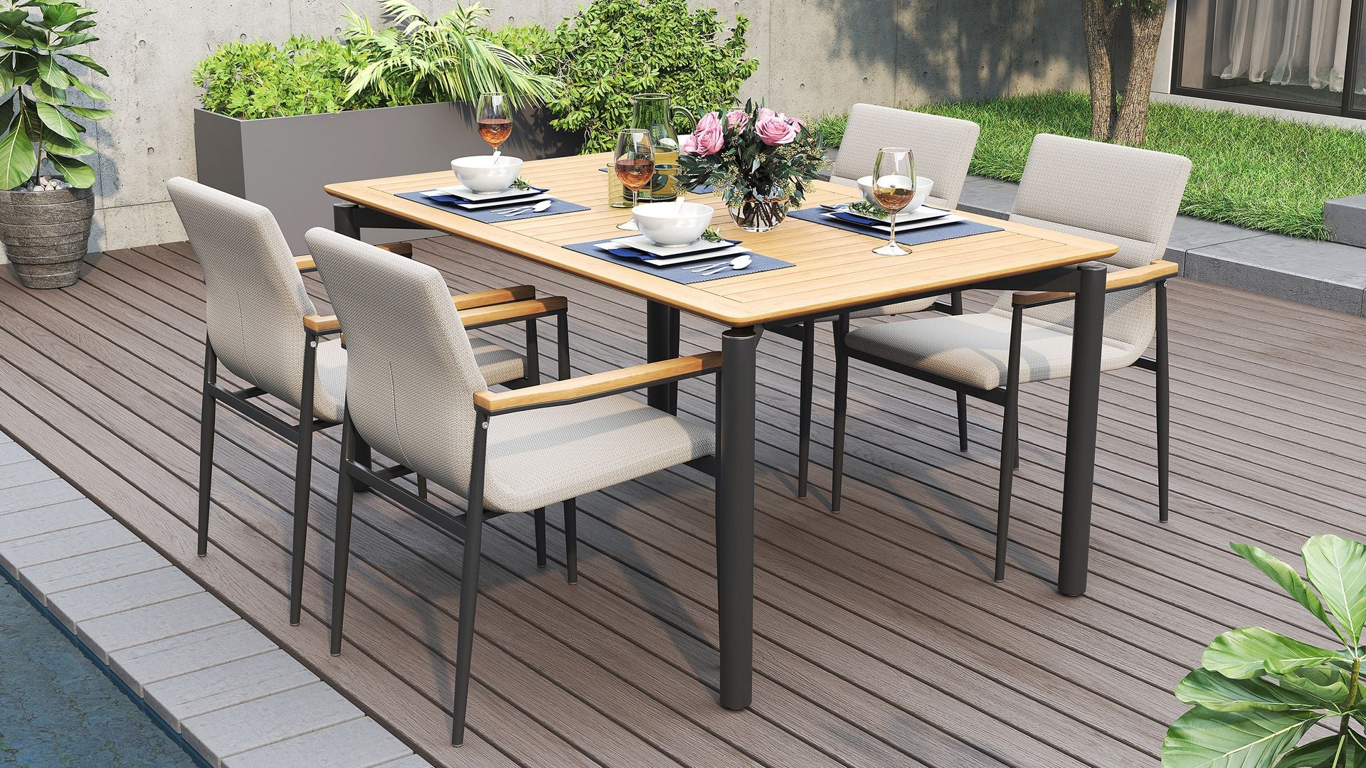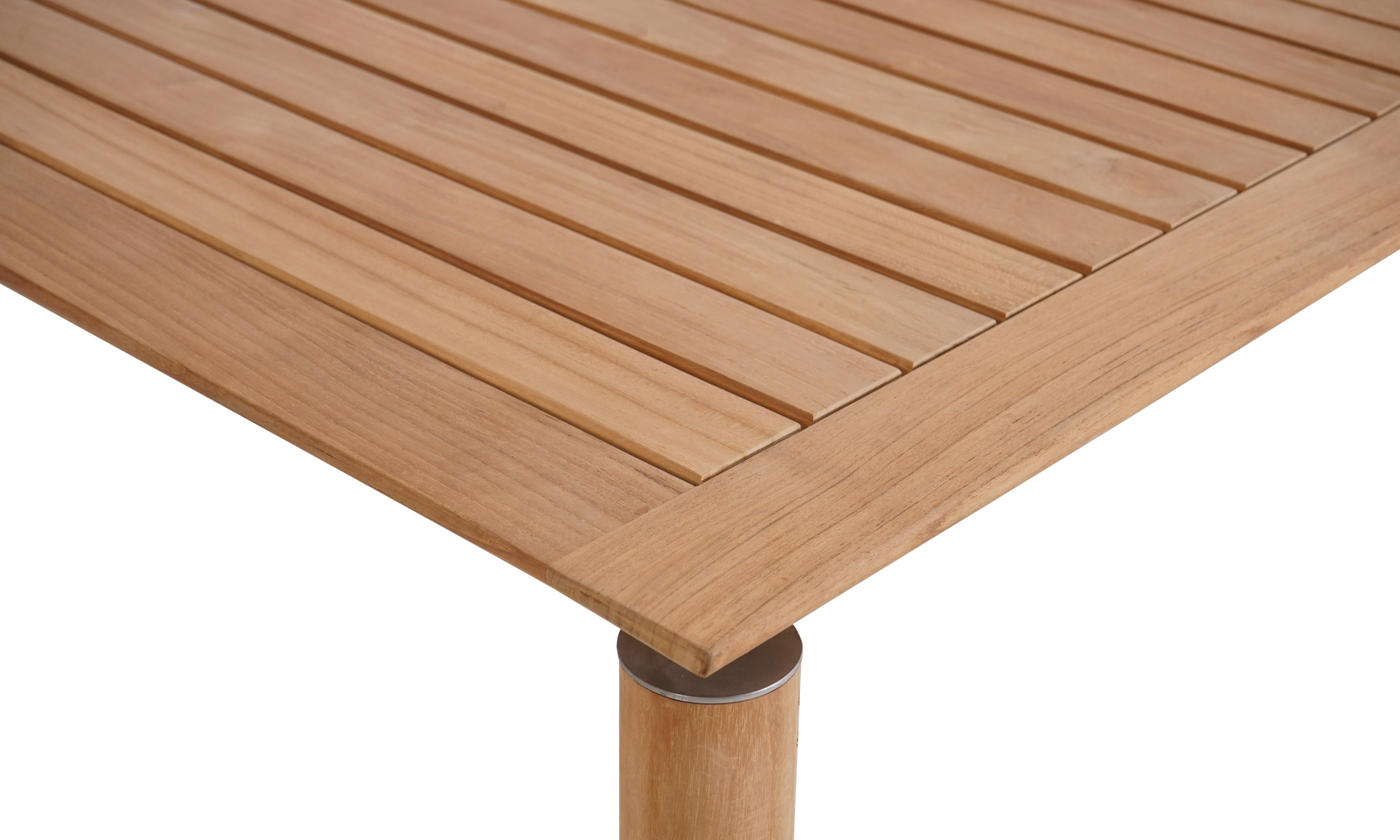 The slatted teak top features subtle grooving to help with drainage and makes cleaning up spills a breeze. Rounded corners and metal accents bring a premium finish that feels both timeless and modern. Hosting starts here.
