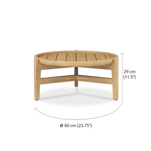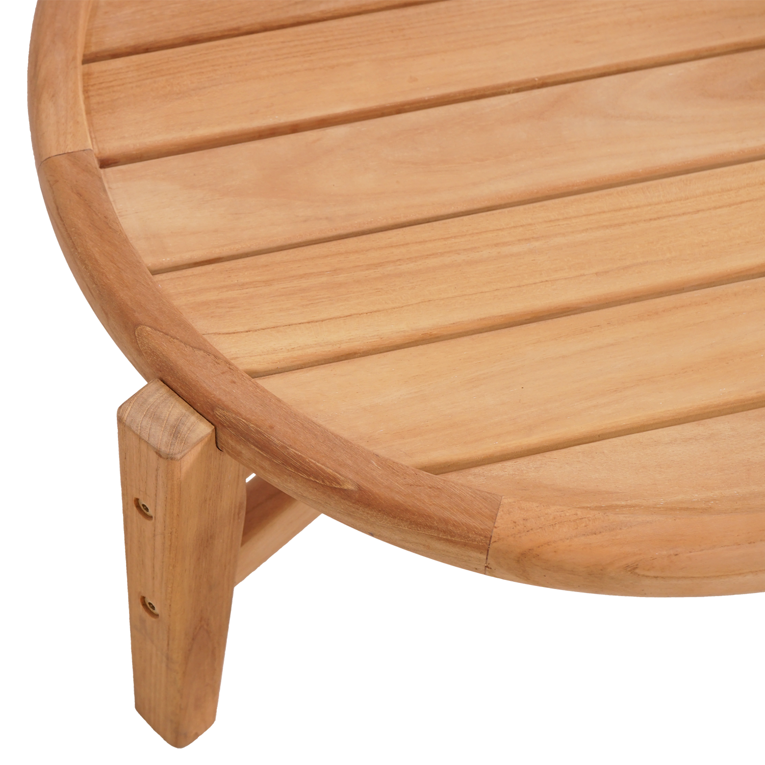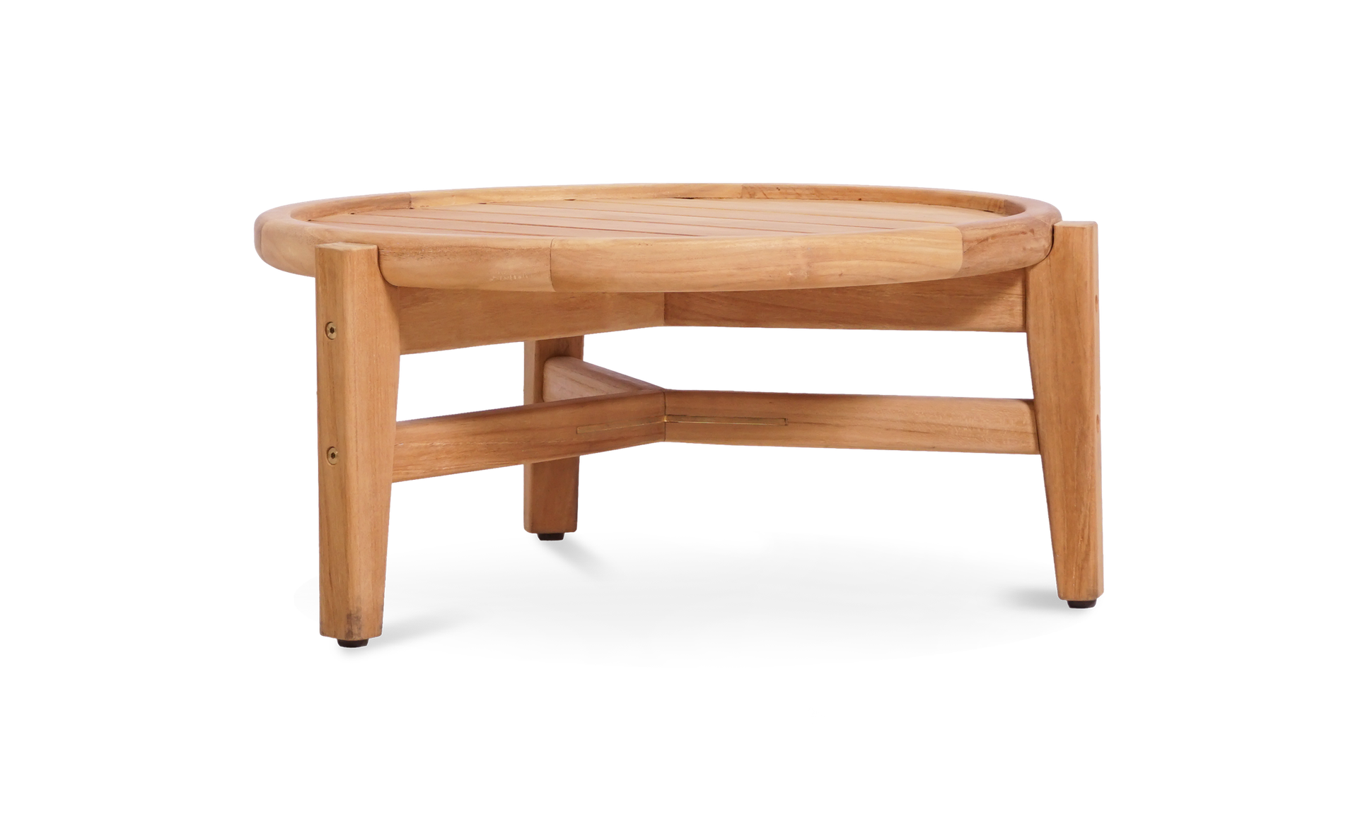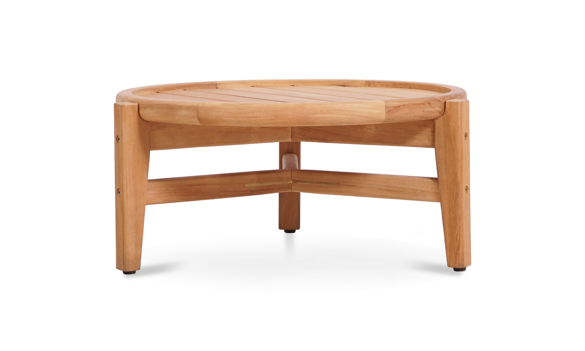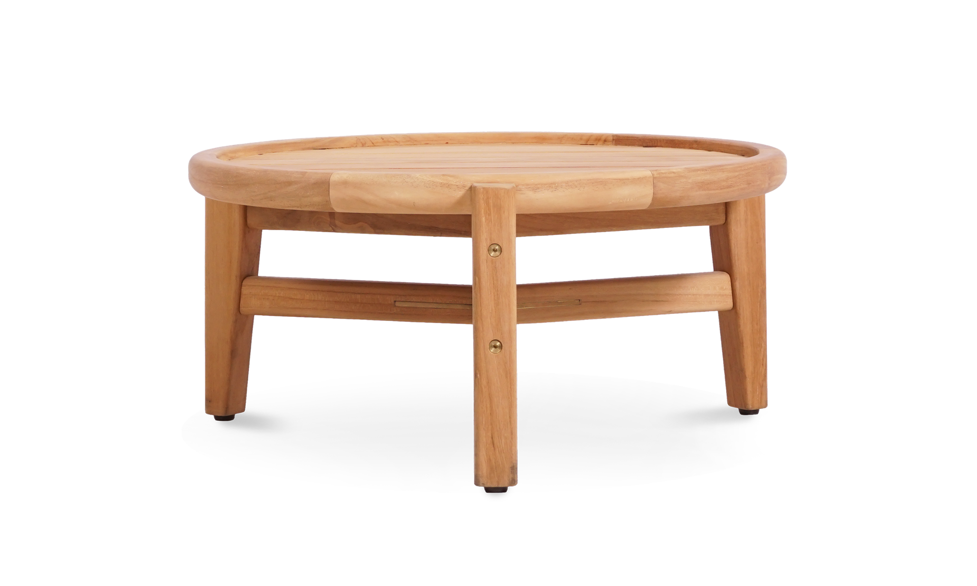 Made from solid teak, it’s built to handle the elements and needs little upkeep. The slatted top helps rainwater drain through, keeping the surface dry and ready for your next coffee or cocktail. A subtle brass accent adds a touch of understated polish.