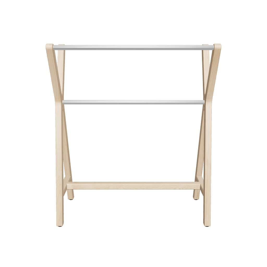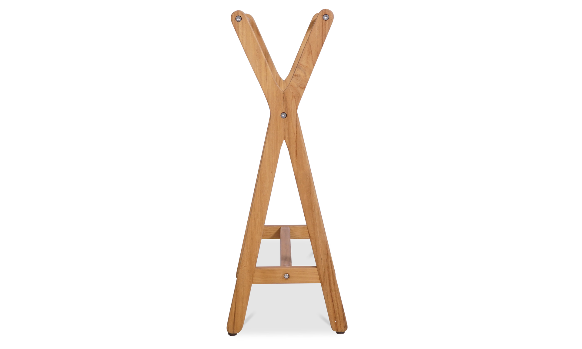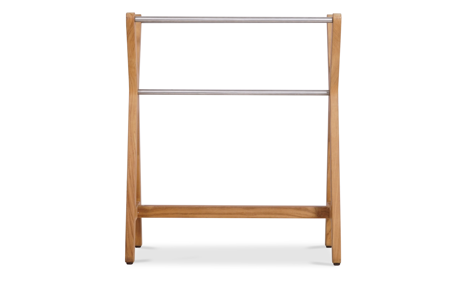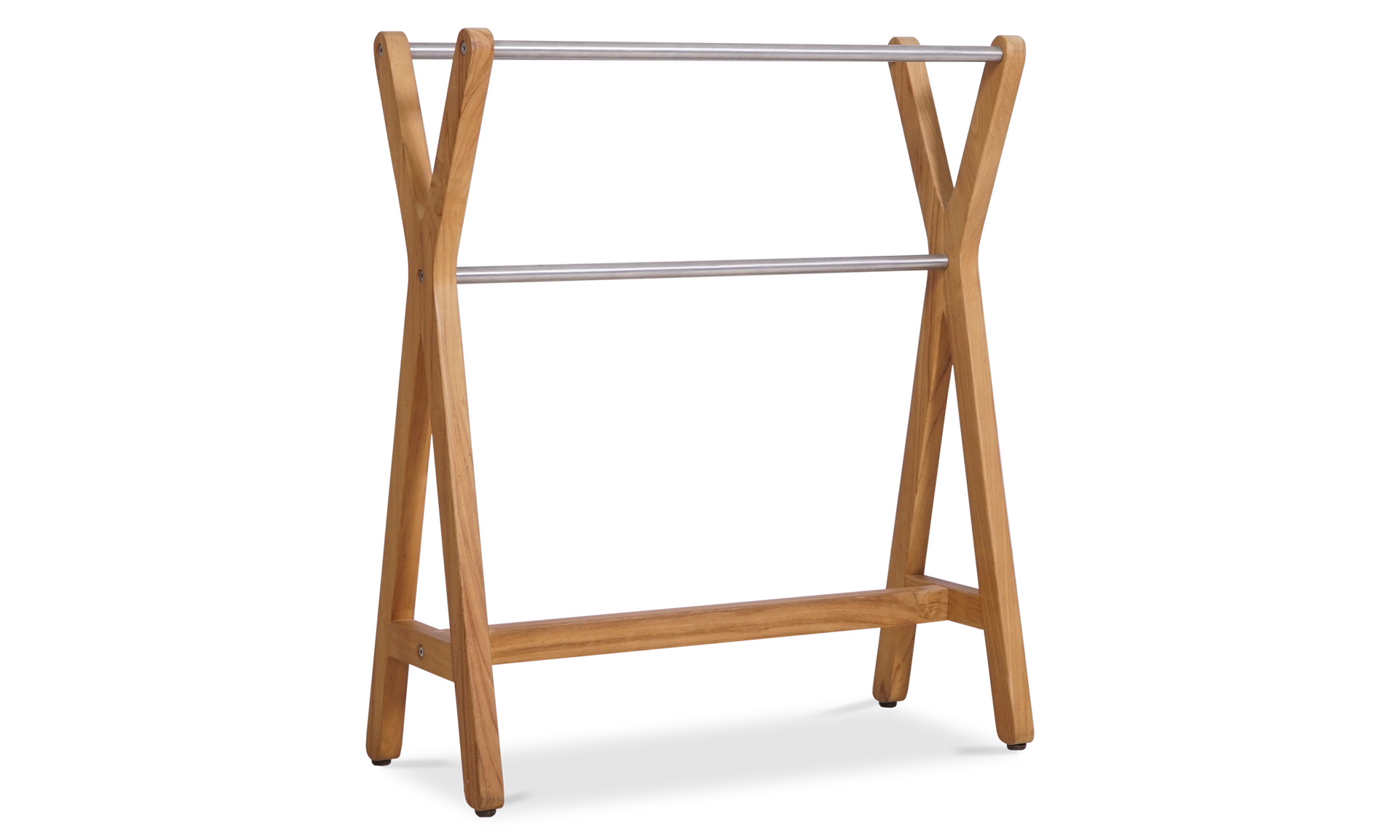 Its X-frame silhouette adds a sculptural touch, while three stainless steel rods provide plenty of space for towels, throws or anything that needs airing. The natural teak finish brings warmth and fits right in by the pool, in the bathroom or next to an outdoor shower.