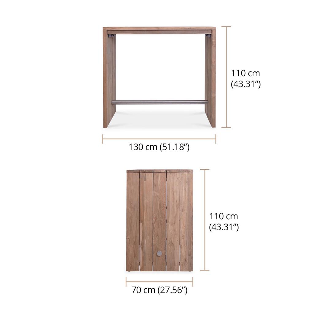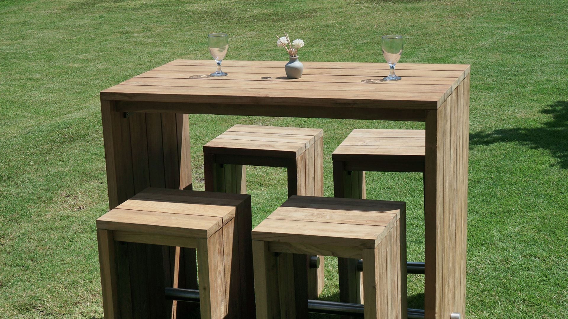 Its clean-lined form is accented by a stainless steel footrest that adds just enough polish without overcomplicating things. Designed to seat four comfortably, this bar-height table fits easily into modern backyards, courtyards or poolside bars.