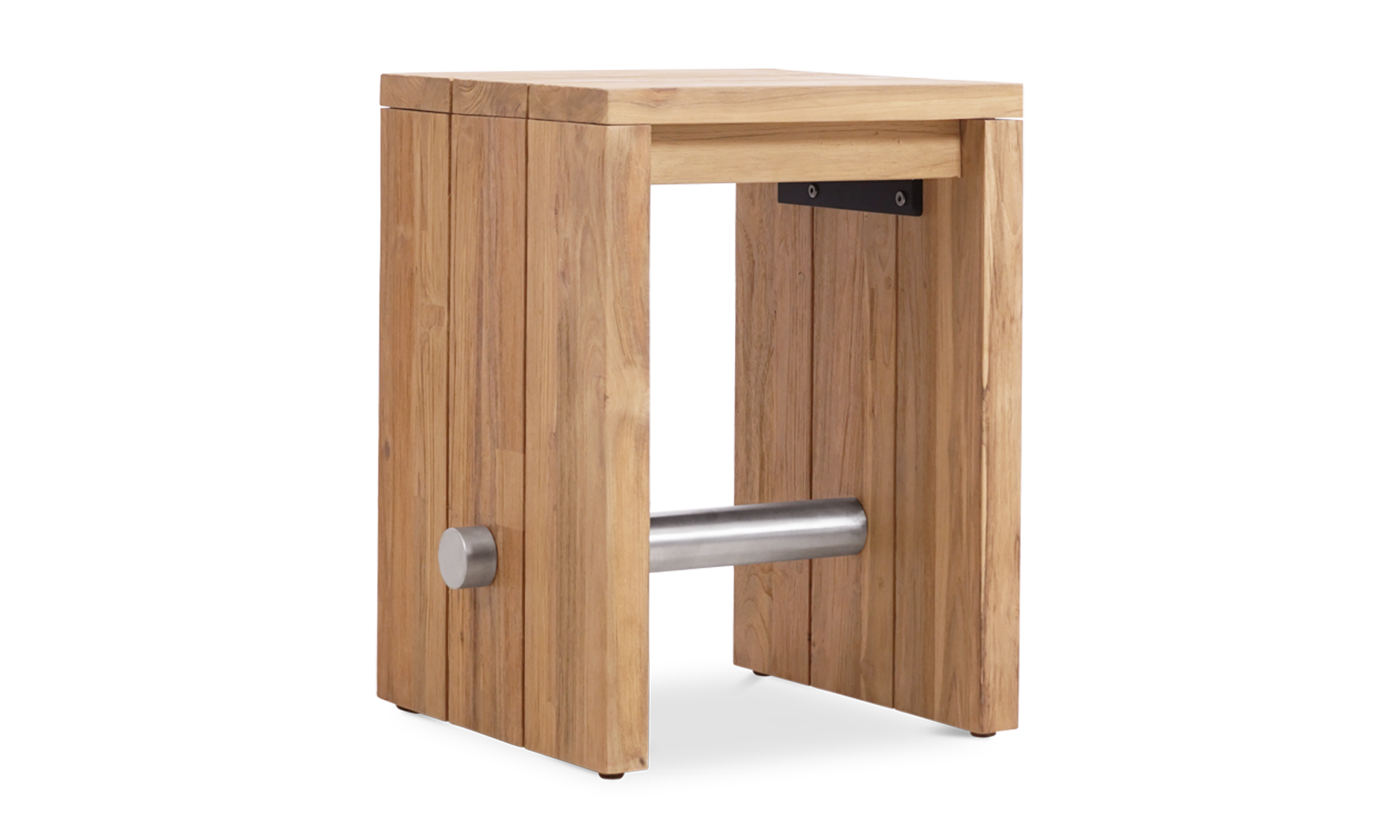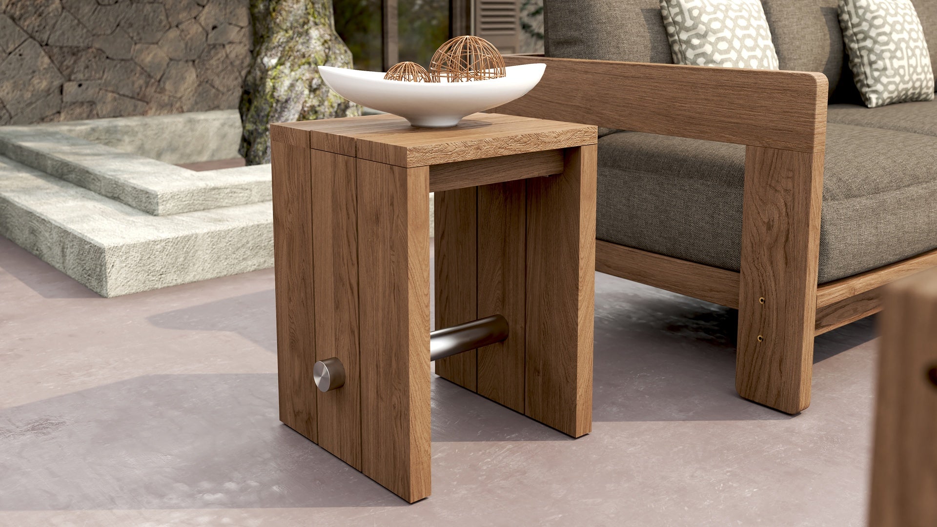 A side table with main character energy. Crafted from reclaimed teak, the clio side table brings a grounded yet refined presence to your outdoor space. Its clean-lined silhouette is paired with a stainless steel footrest, adding just the right amount of industrial edge to this otherwise earthy piece.