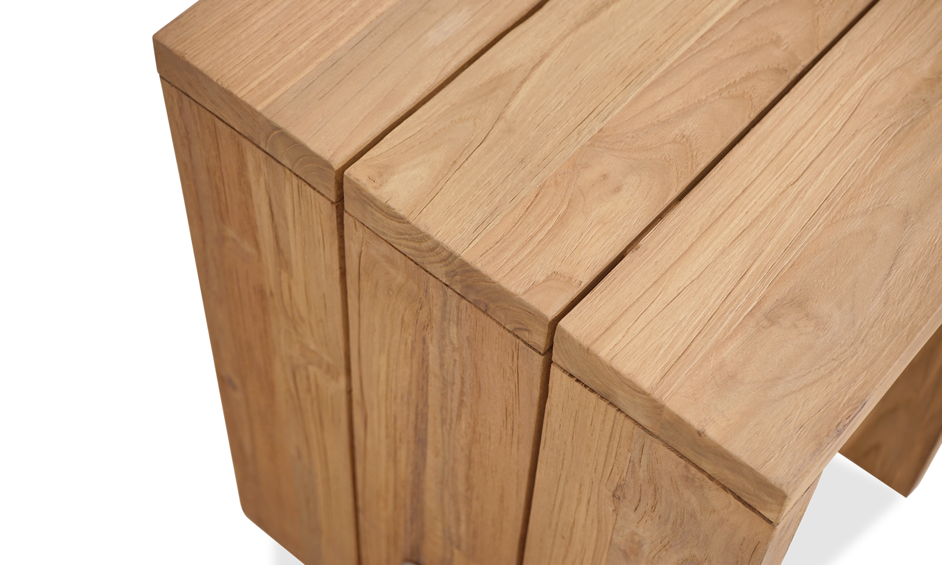 Each table is made from premium reclaimed teak, showcasing rich natural grain and tonal variation that speaks to its history. It's compact, sturdy, and built to handle sun, rain and everyday life outdoors. Whether styled next to a lounge or tucked beside a bench, this piece proves small doesn’t mean subtle.