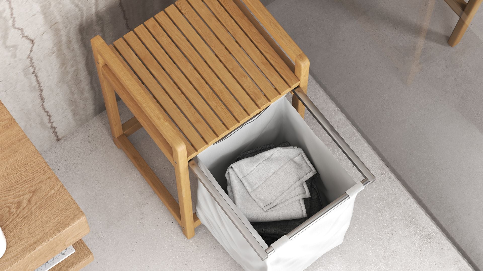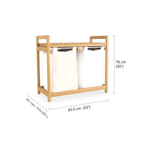 Each slot holds a removable canvas liner that’s machine-washable, making laundry day that little bit easier. The stainless steel runners glide smoothly, allowing the hamper to slide in and out of the teak frame with ease. Whether you’re sorting whites from colours or just hiding the chaos, emil is here to keep things effortlessly tidy.