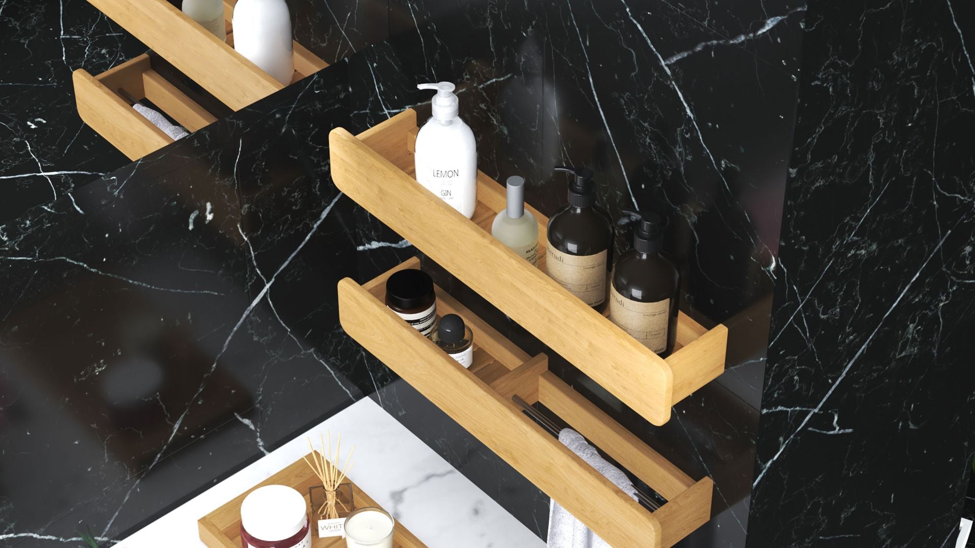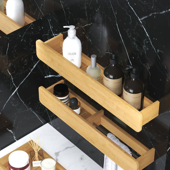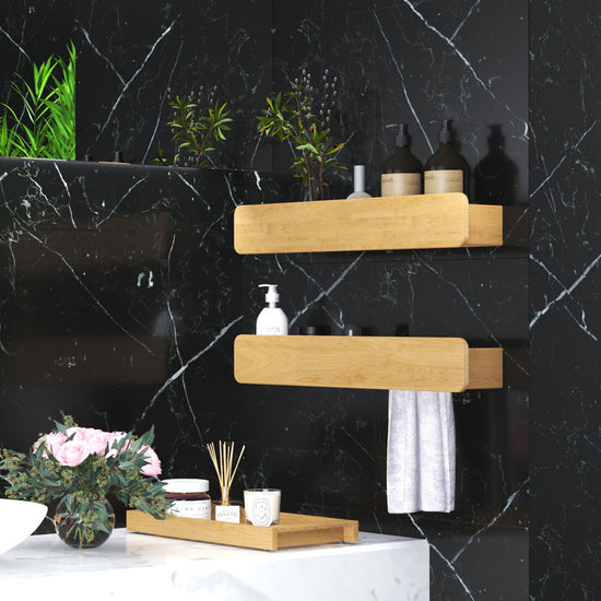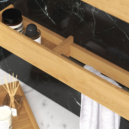 The raised edge keeps items securely in place, while the slatted base allows for air circulation and easy cleaning. The towel rack version adds even more function in tight spots, combining a sleek shelf and towel holder in one streamlined design. Both options include a discreet metal keyhole hanger for effortless wall mounting. Just pick your style, hang it up, and let the clutter vanish.
