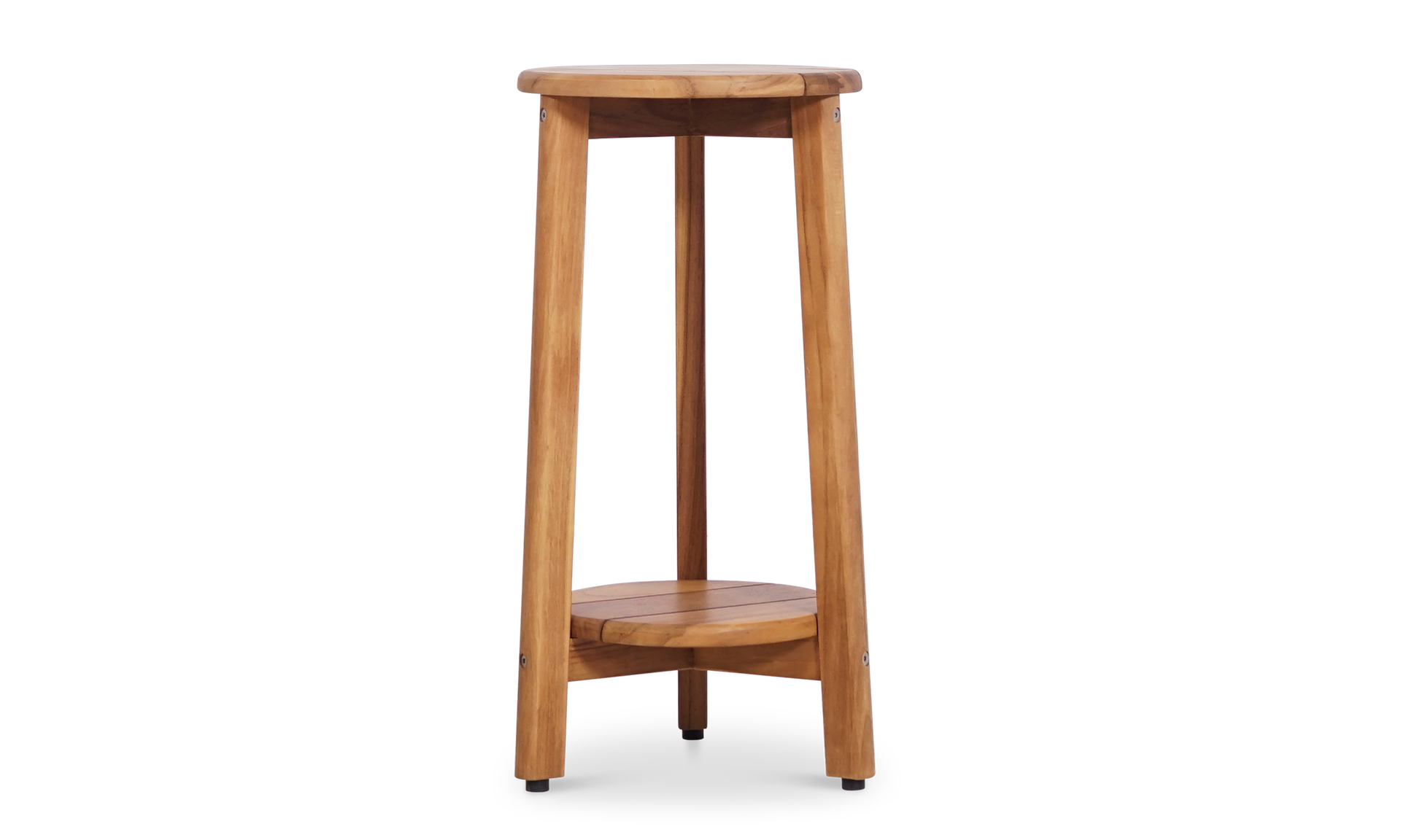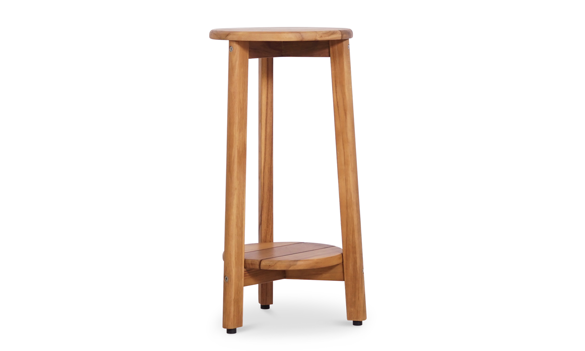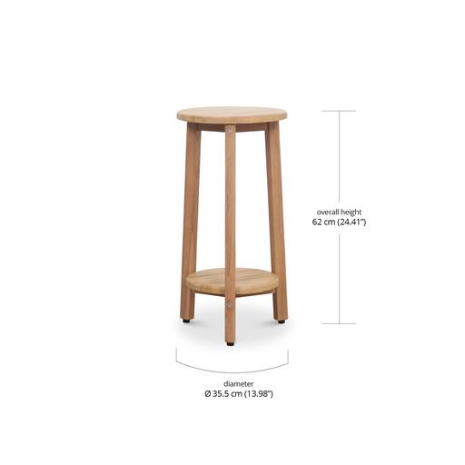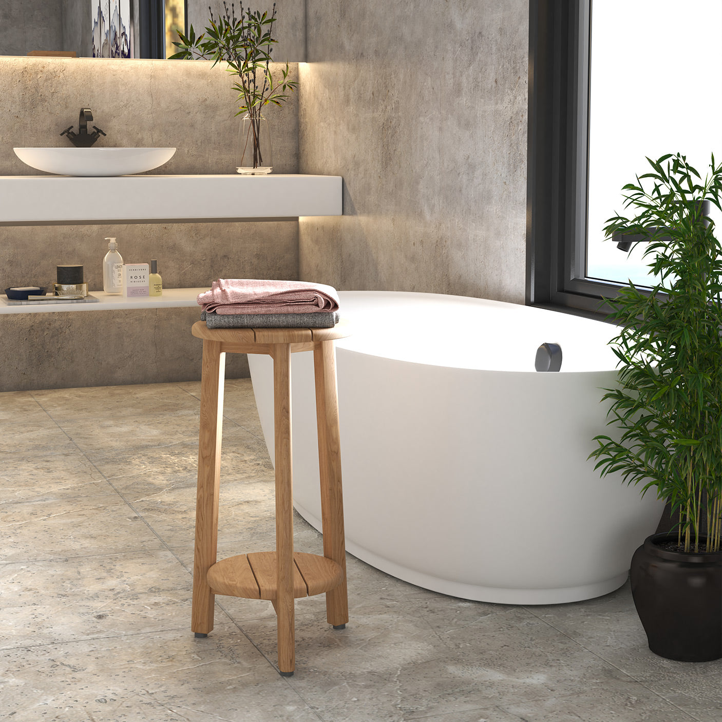 Designed with a slender silhouette and practical functionality, the haven tub side table is the perfect companion for bathtime essentials. Crafted from solid teak in its natural finish, this compact piece offers a warm, organic touch to modern bathrooms. Its round top is just the right size for a towel, a book, or a glass of wine, while the integrated lower shelf adds extra storage without taking up visual space.
