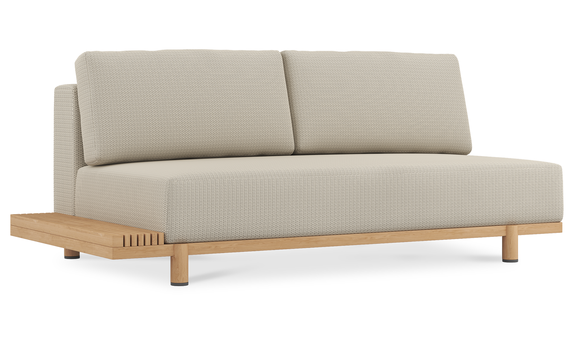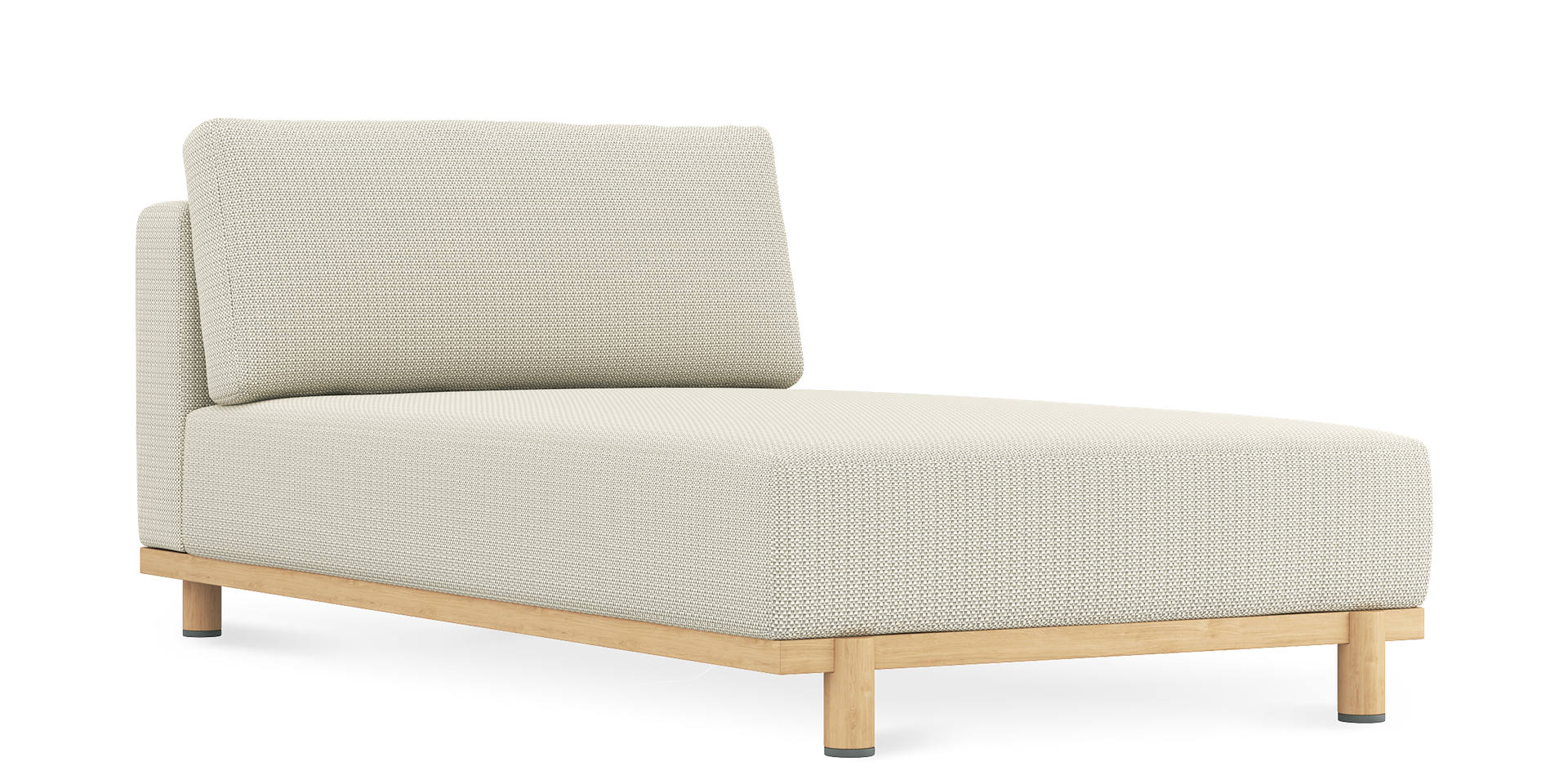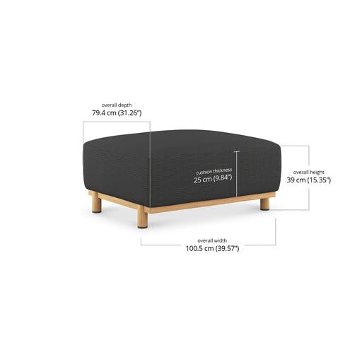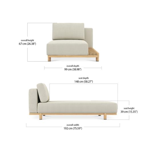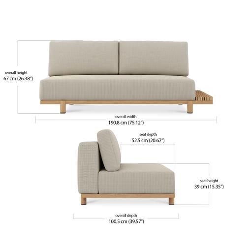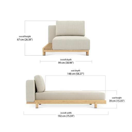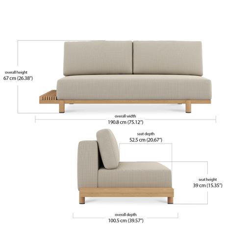 Each piece is padded with Quick Dry Foam for rapid drainage and topped with a seat sling to promote airflow and drying from beneath. The base is solid teak, kiln-dried and naturally resistant to cracking and water. Over time, it will develop a gentle silver patina, adding further depth to the design.
