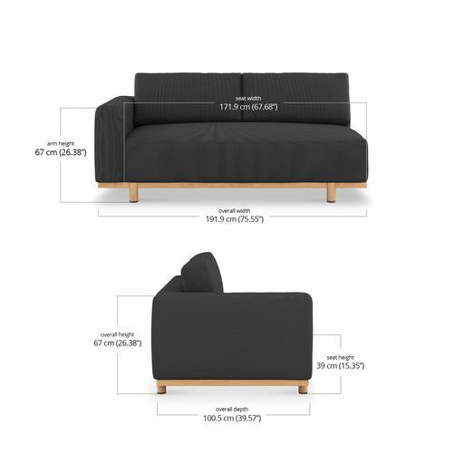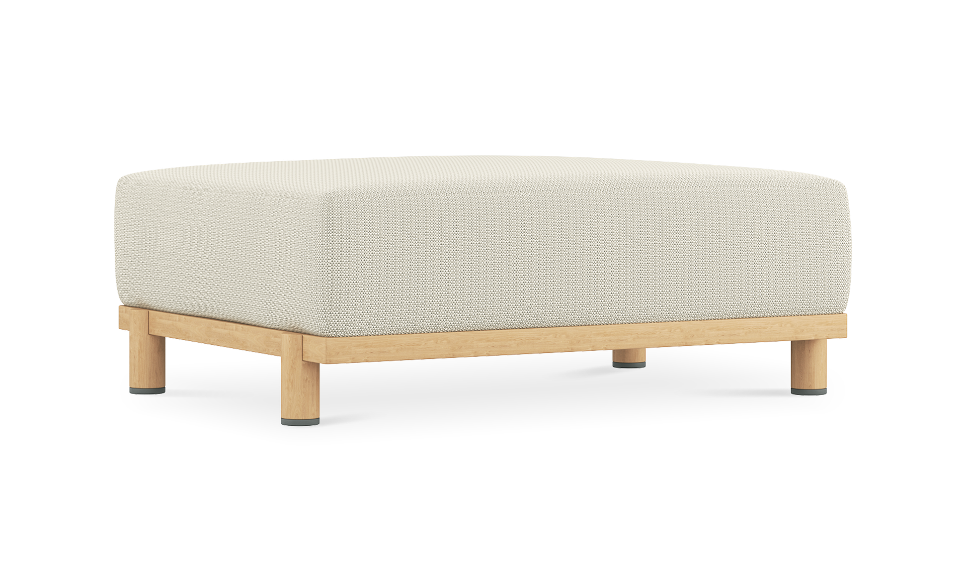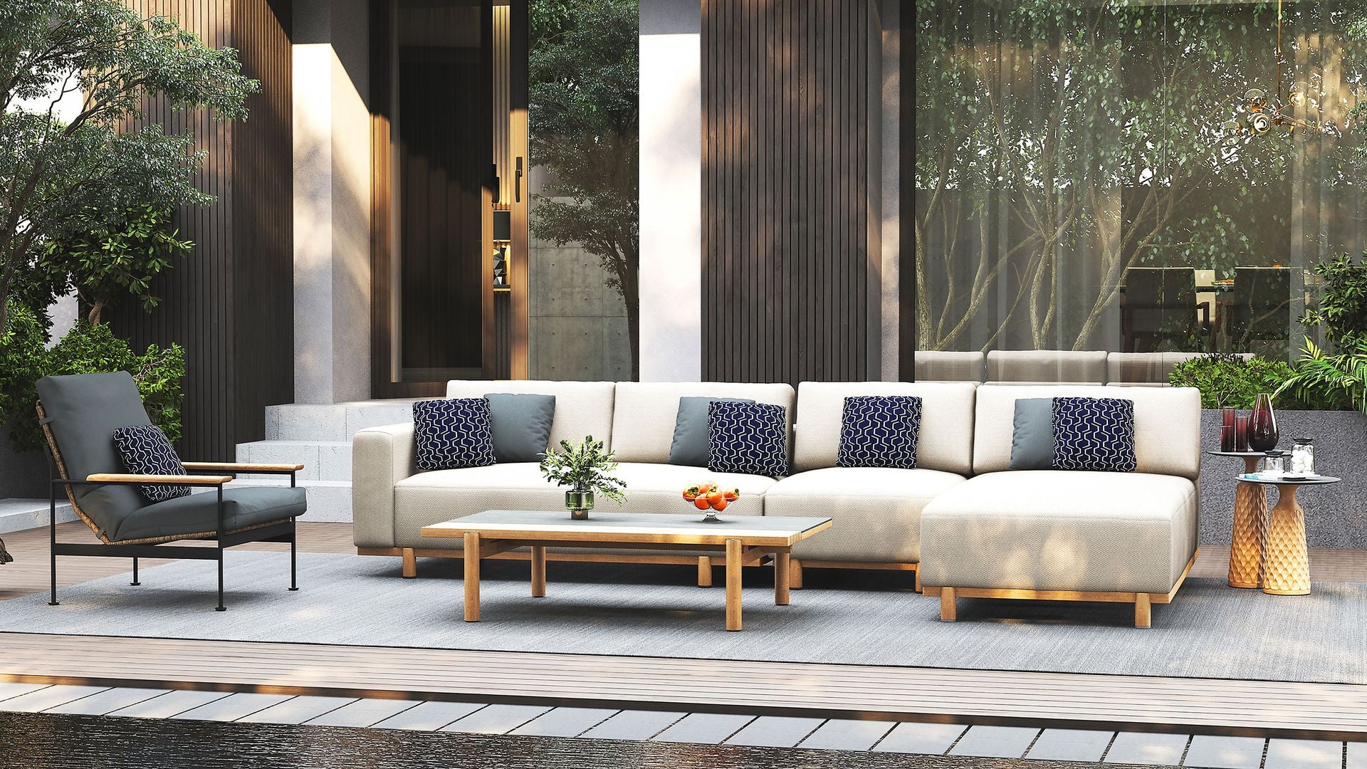 Each piece is padded with Quick Dry Foam for rapid drainage and topped with a seat sling to promote airflow and drying from beneath. The base is solid teak, kiln-dried and naturally resistant to cracking and water. Over time, it will develop a gentle silver patina, adding further depth to the design.