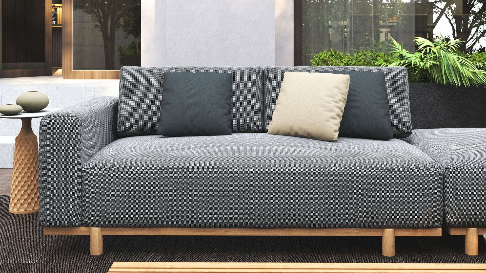 Agora fabric, developed by Tuvatextil in Spain, is crafted from 100% solution-dyed acrylic. It delivers superior fade resistance, water repellency, and protection against mould and mildew, all while offering a soft, woven handfeel that rivals indoor textiles. The result is a fabric that performs in harsh conditions while maintaining a relaxed, natural look.