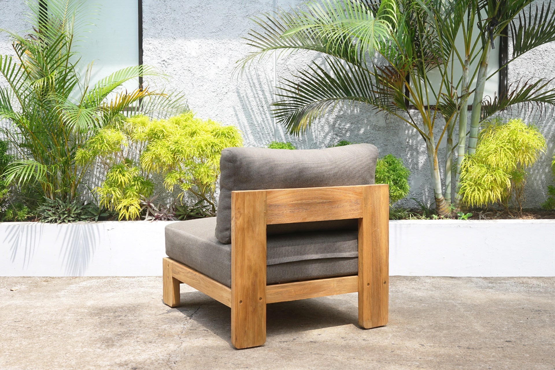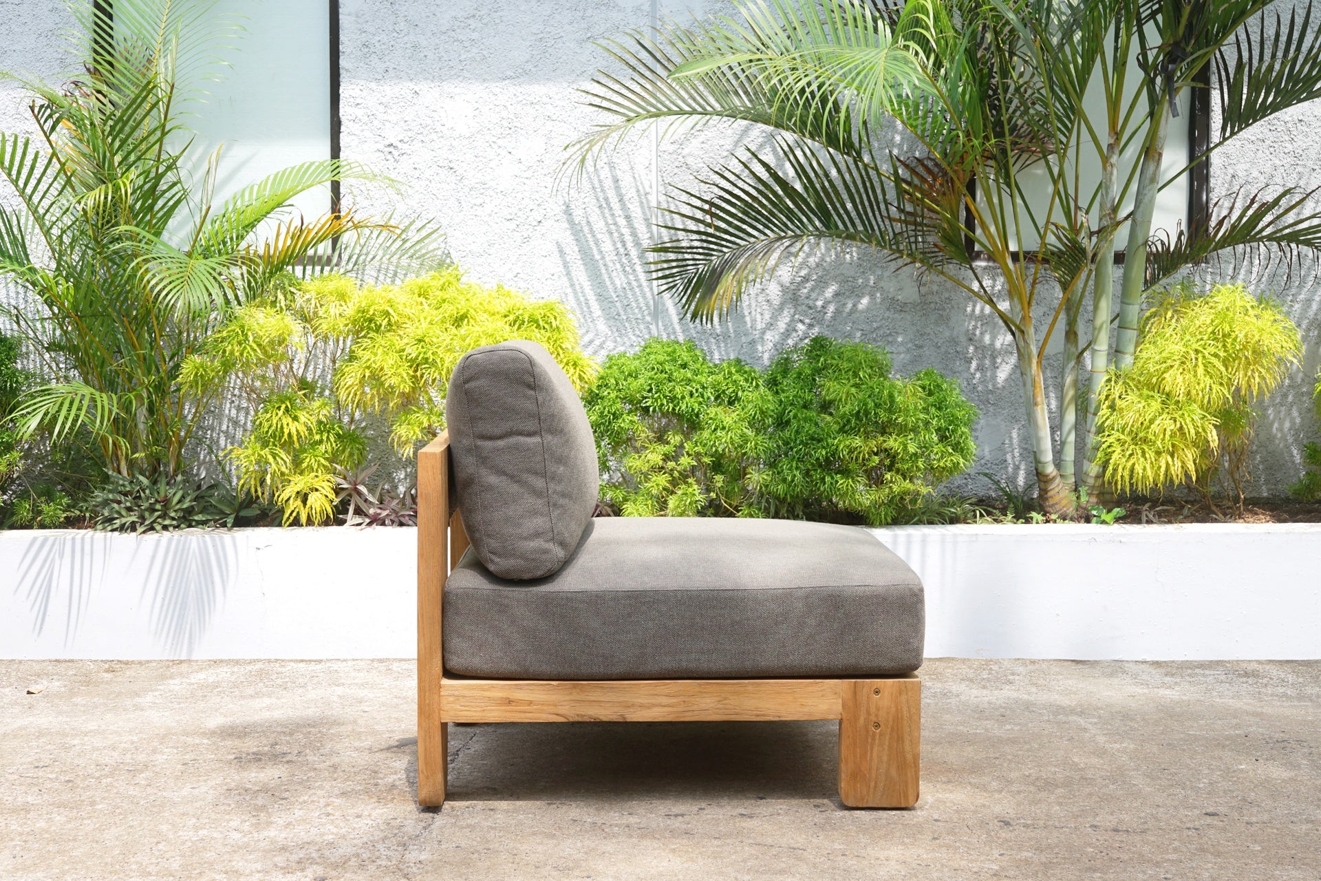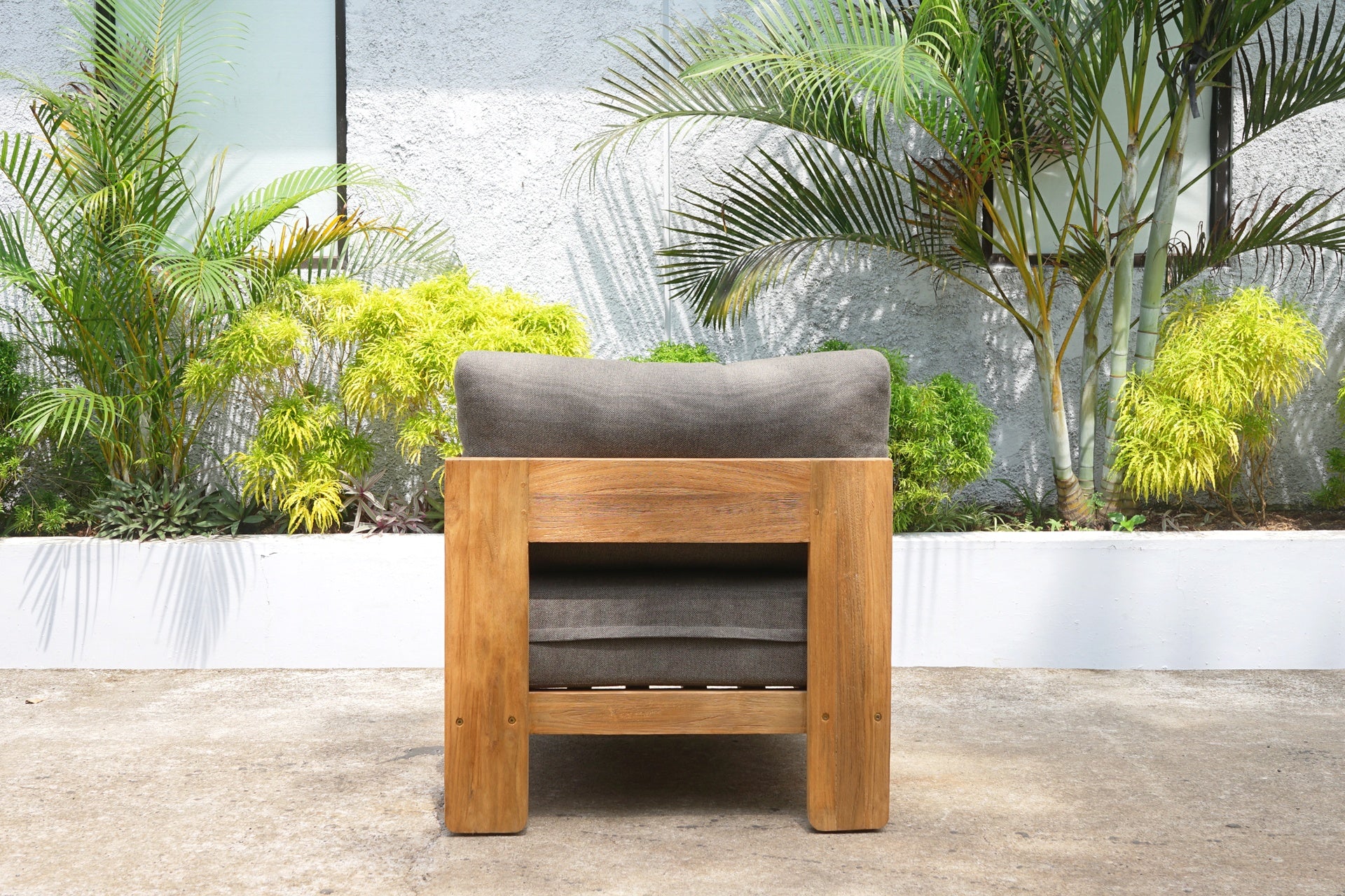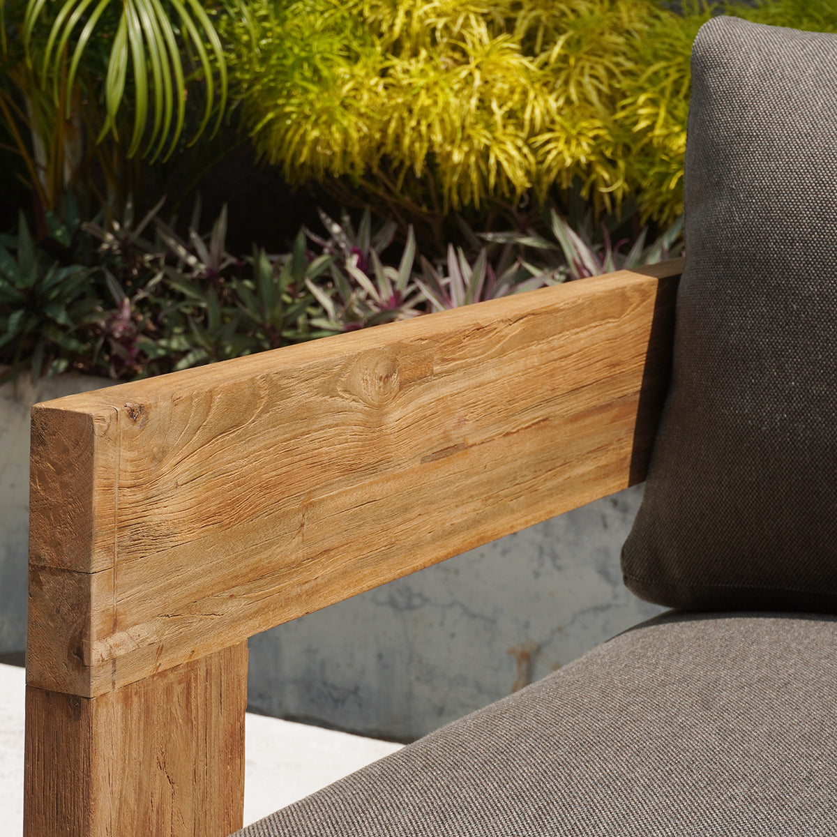 Each piece features a low-profile frame crafted from reclaimed teak, rich in natural character and built to last. The slim arms and wide stance strike a modern silhouette while maintaining a grounded, timeless feel.