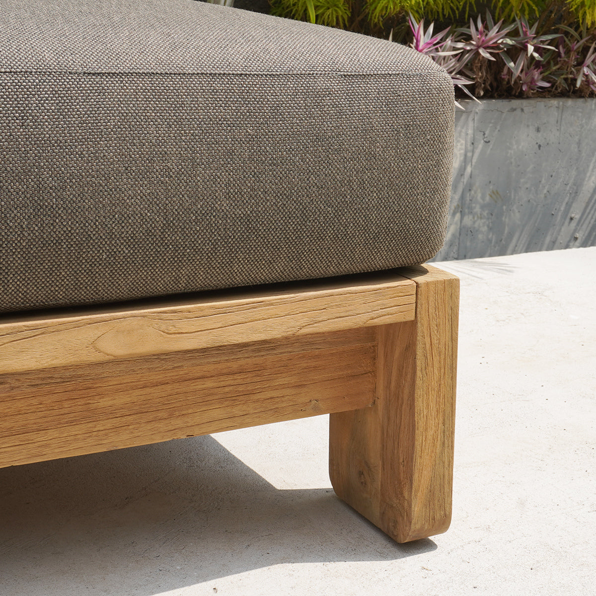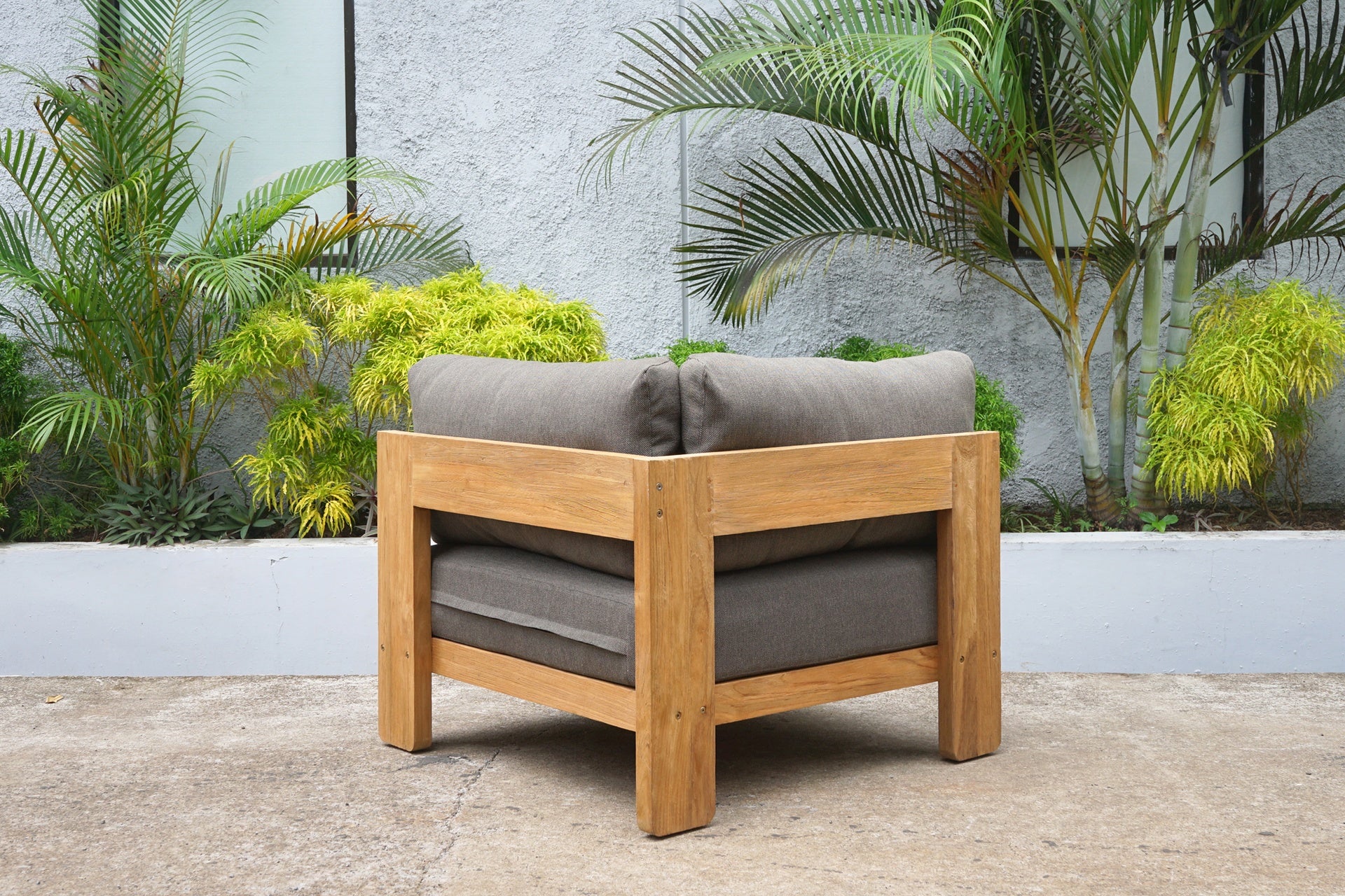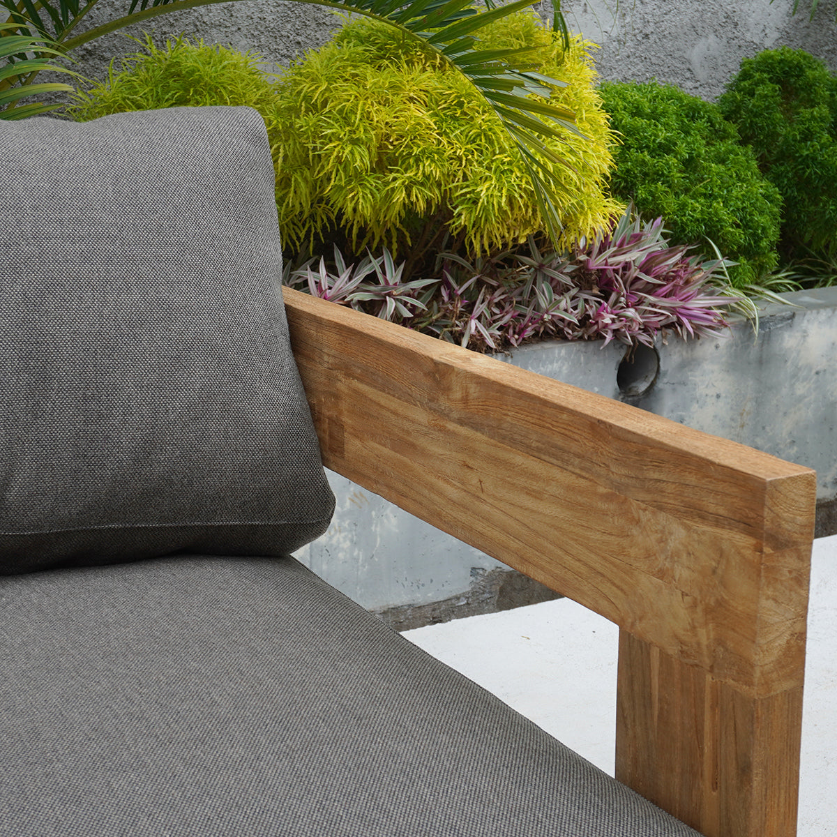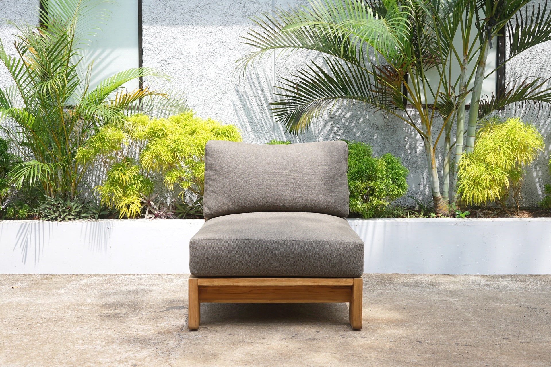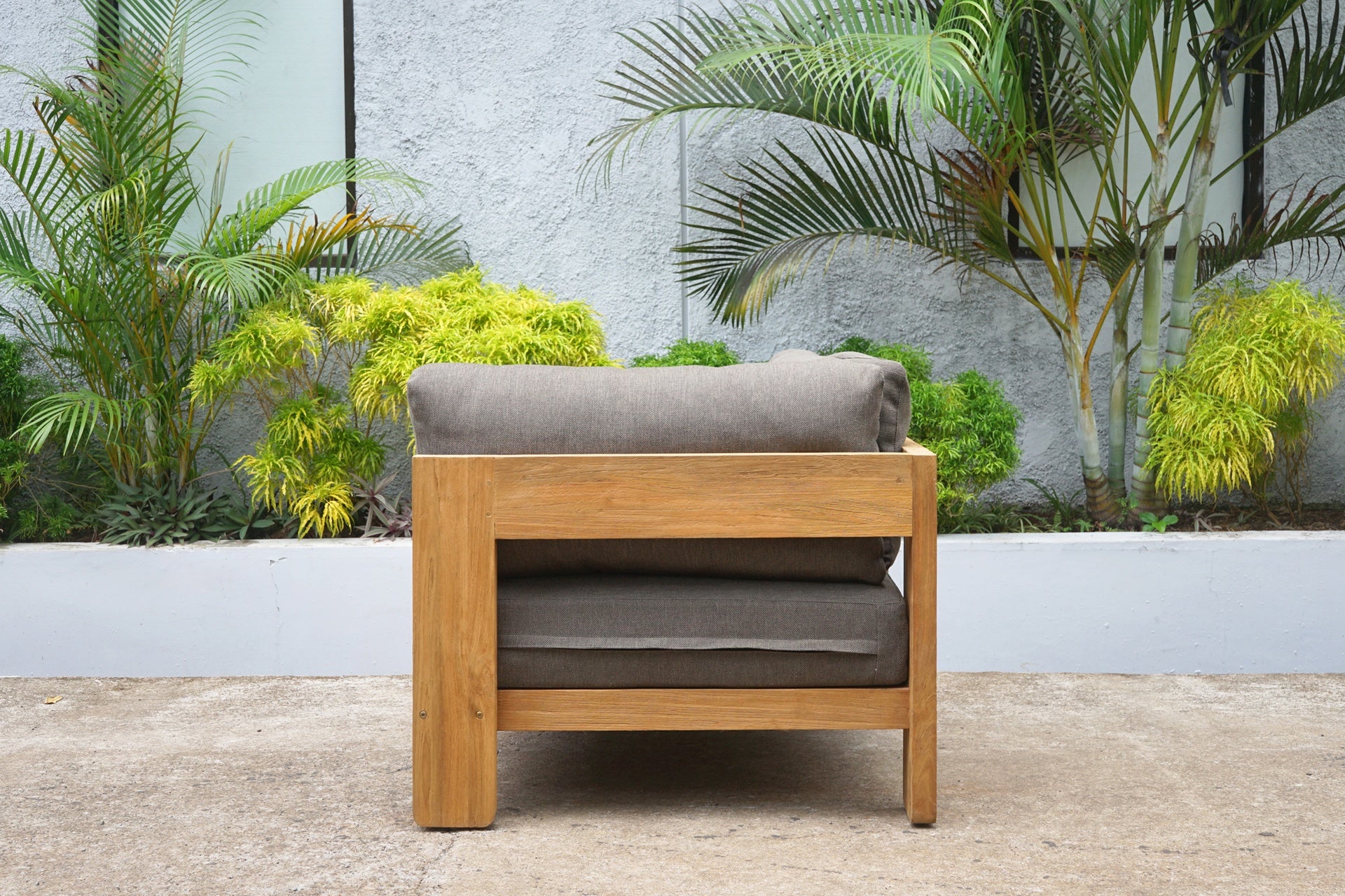 Each piece features a low-profile frame crafted from reclaimed teak, rich in natural character and built to last. The slim arms and wide stance strike a modern silhouette while maintaining a grounded, timeless feel.