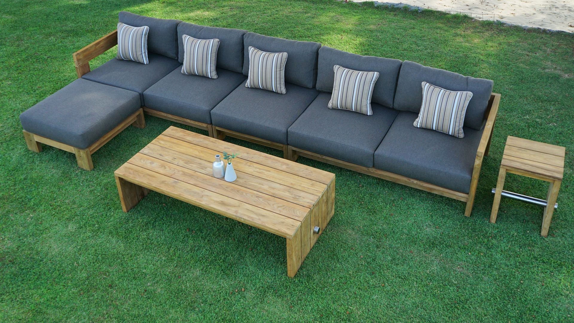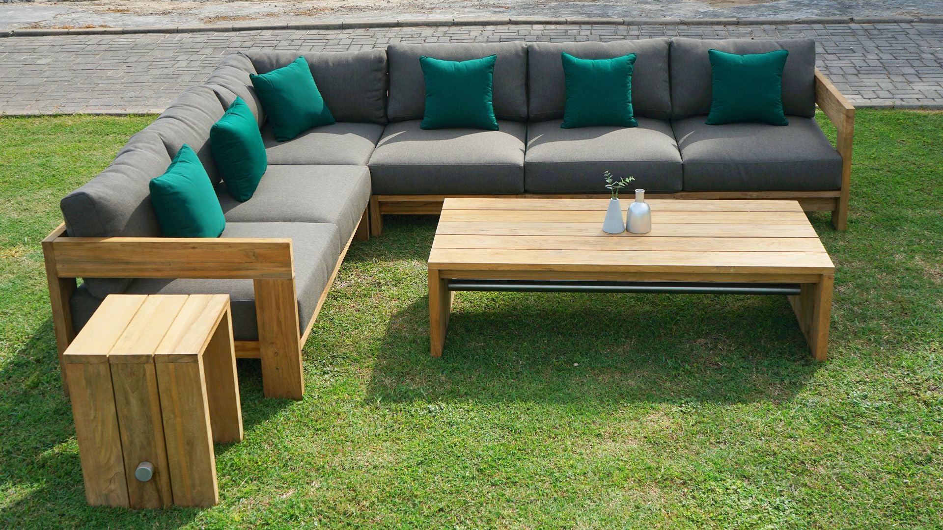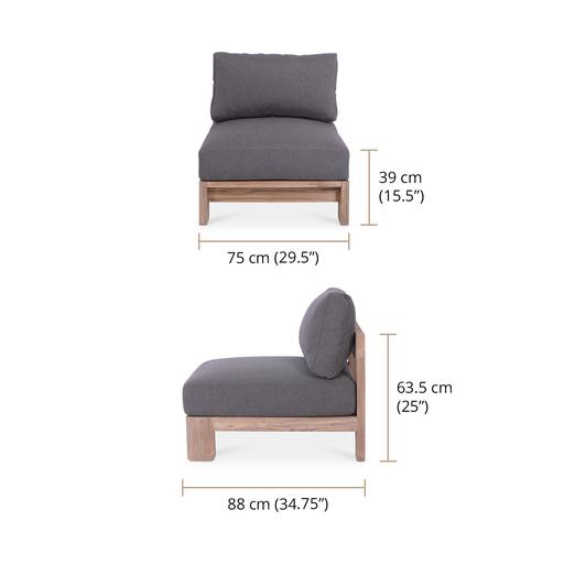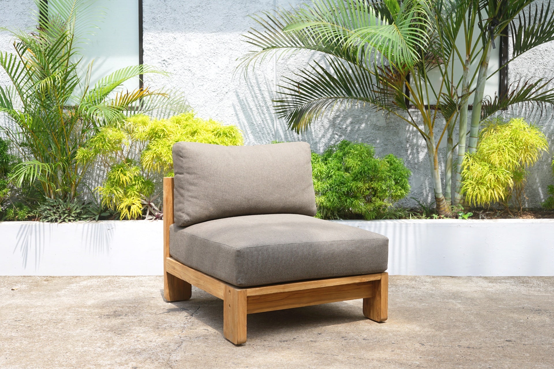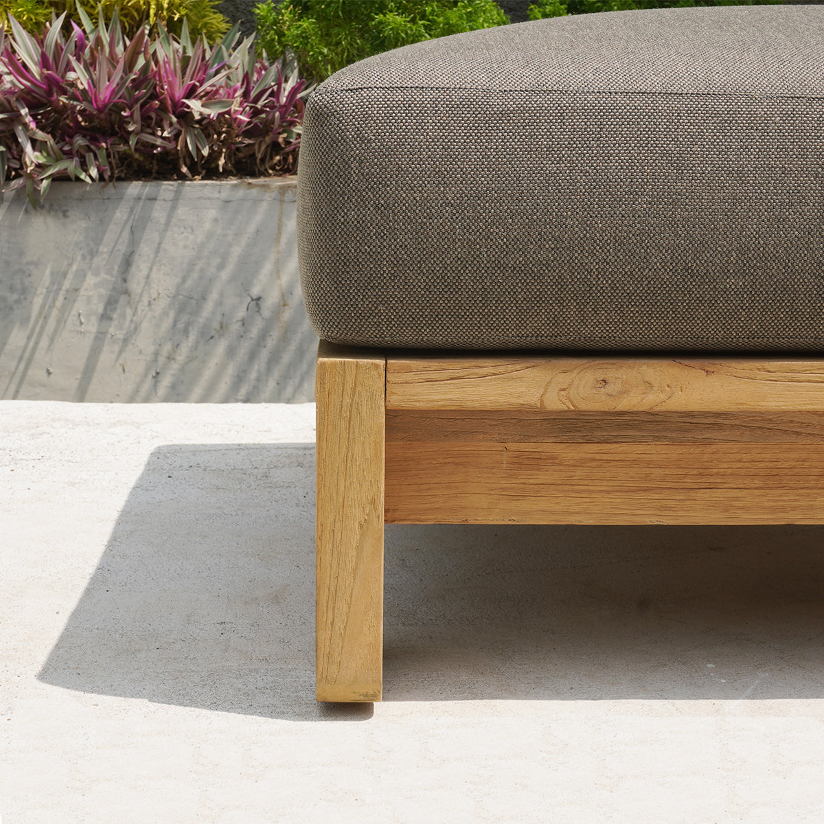 Each piece features a low-profile frame crafted from reclaimed teak, rich in natural character and built to last. The slim arms and wide stance strike a modern silhouette while maintaining a grounded, timeless feel.