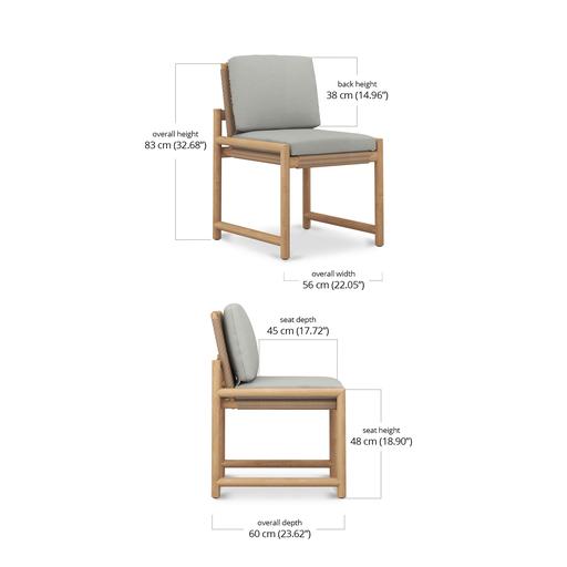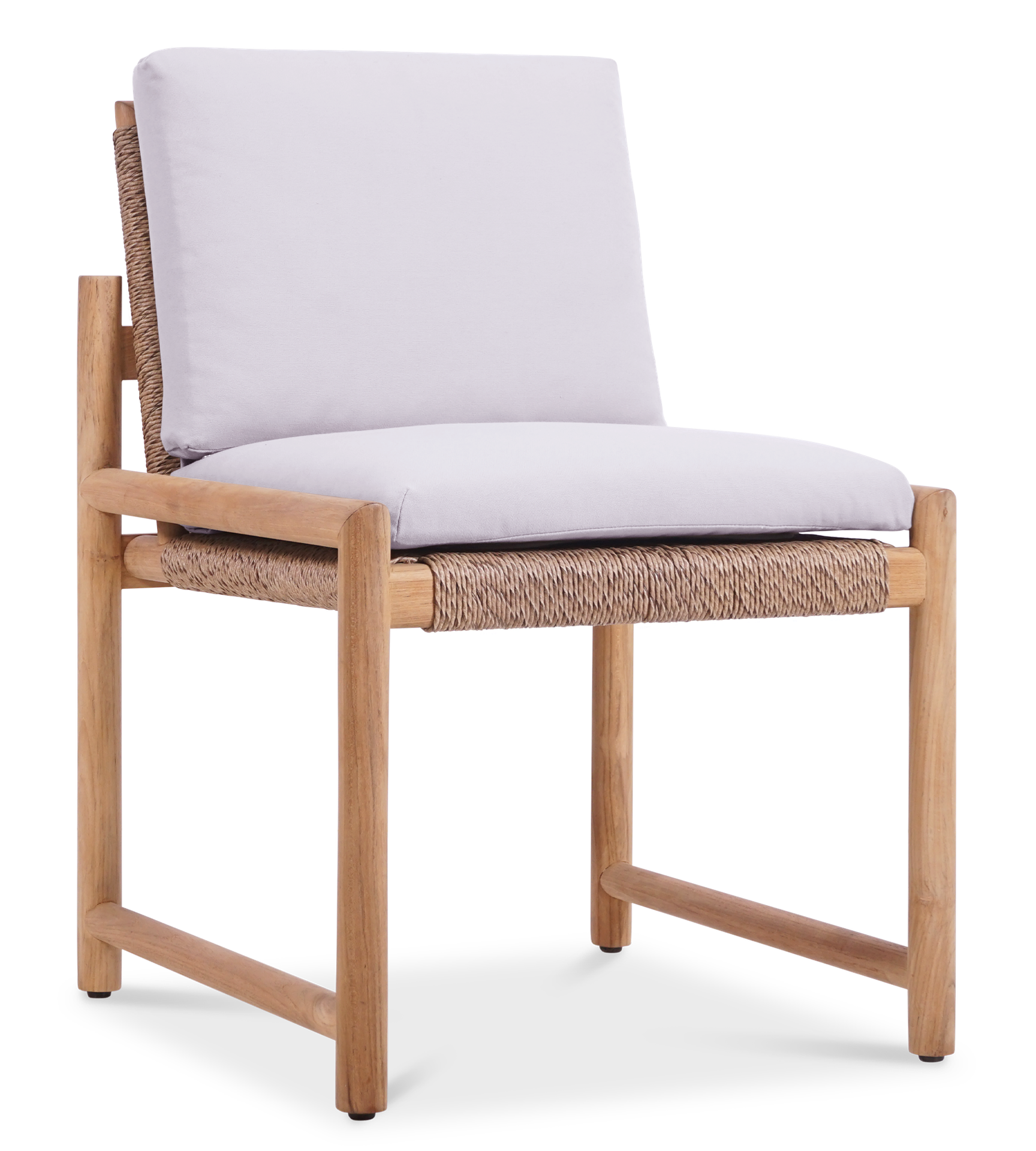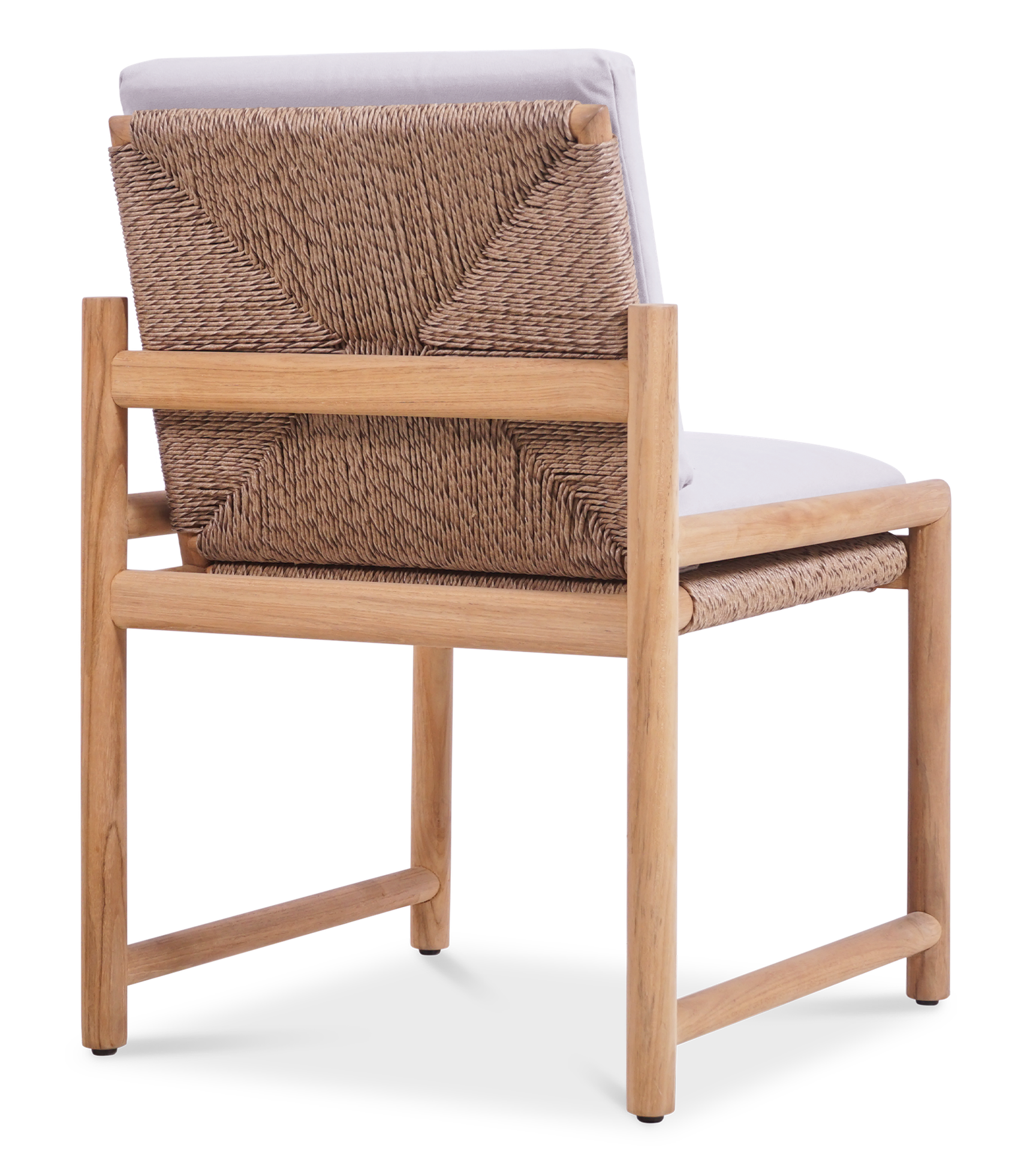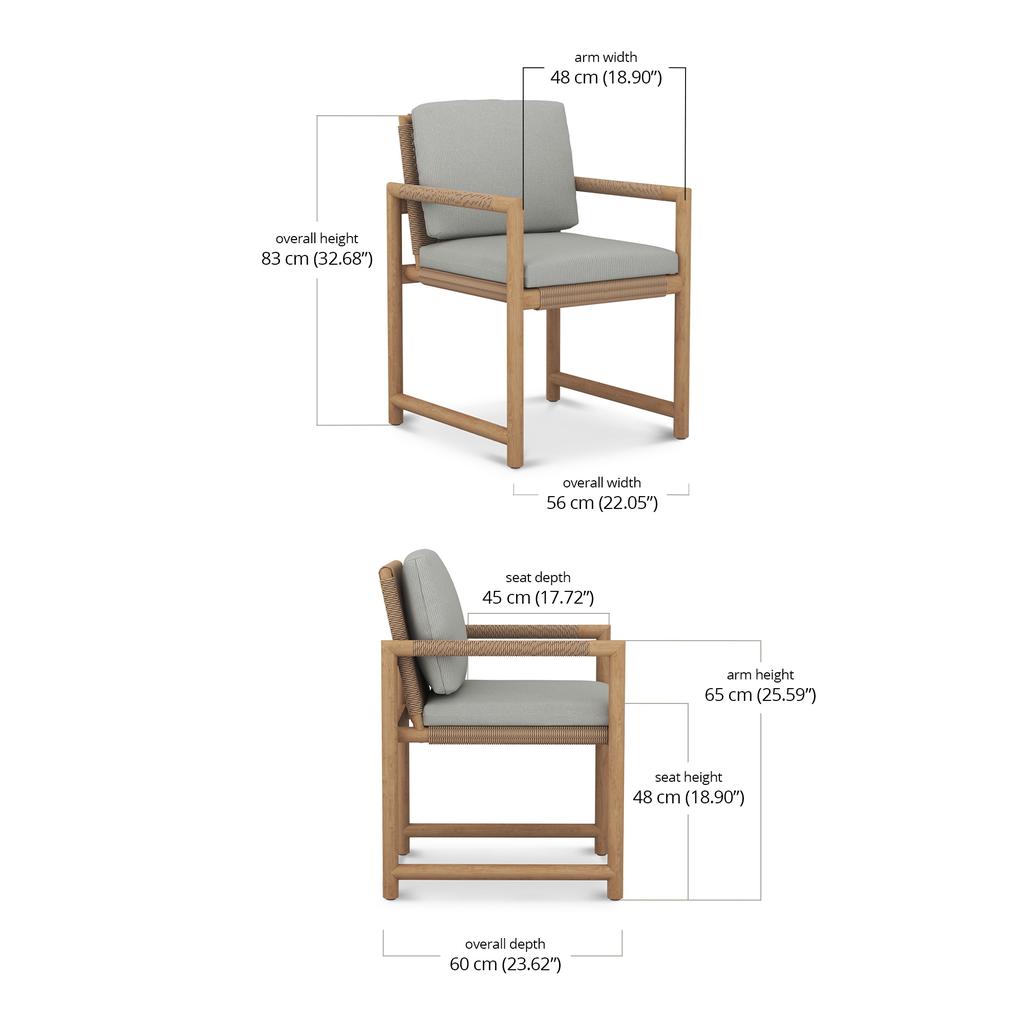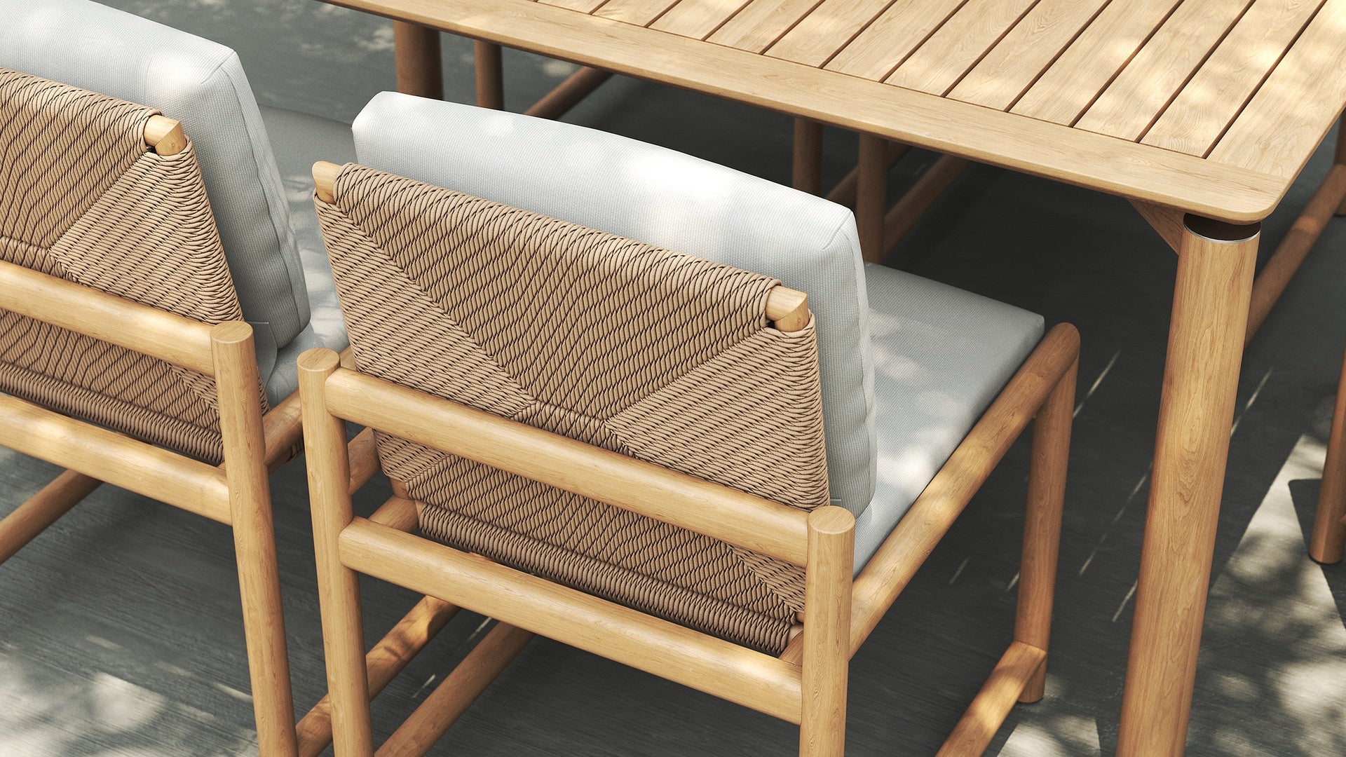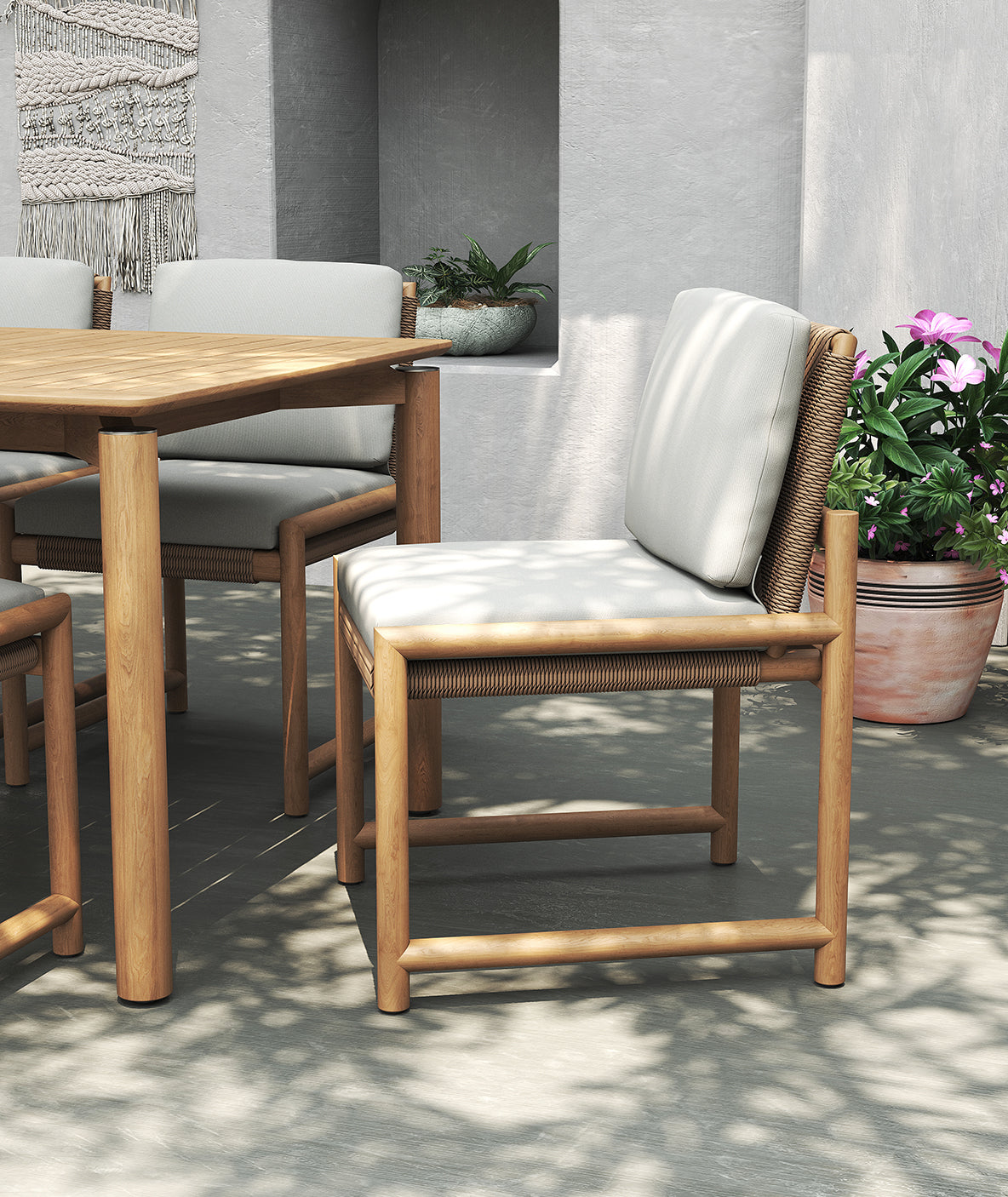 Available with or without arms, the timo dining chair is crafted from solid teak and features a handwoven hyacinth-style wicker back that adds character to any outdoor setting. The supportive frame is balanced by plush cushions that invite long lunches and easy conversations. The armless version tucks in neatly under most tables, while the armchair variation offers extra comfort. Made to withstand the elements, the removable cushion covers come in a range of UV- and fade-resistant outdoor fabrics. A piece that blends timeless appeal with modern durability.