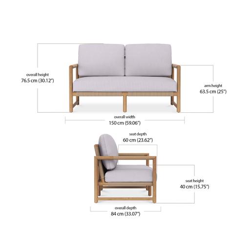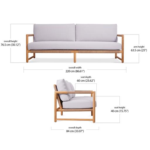 The high, supportive back and deep seat make this sofa perfect for long outdoor lounging sessions. Cushions are filled with quick dry foam and come with removable covers available in a range of UV-resistant outdoor fabrics, designed to hold up beautifully under the sun.