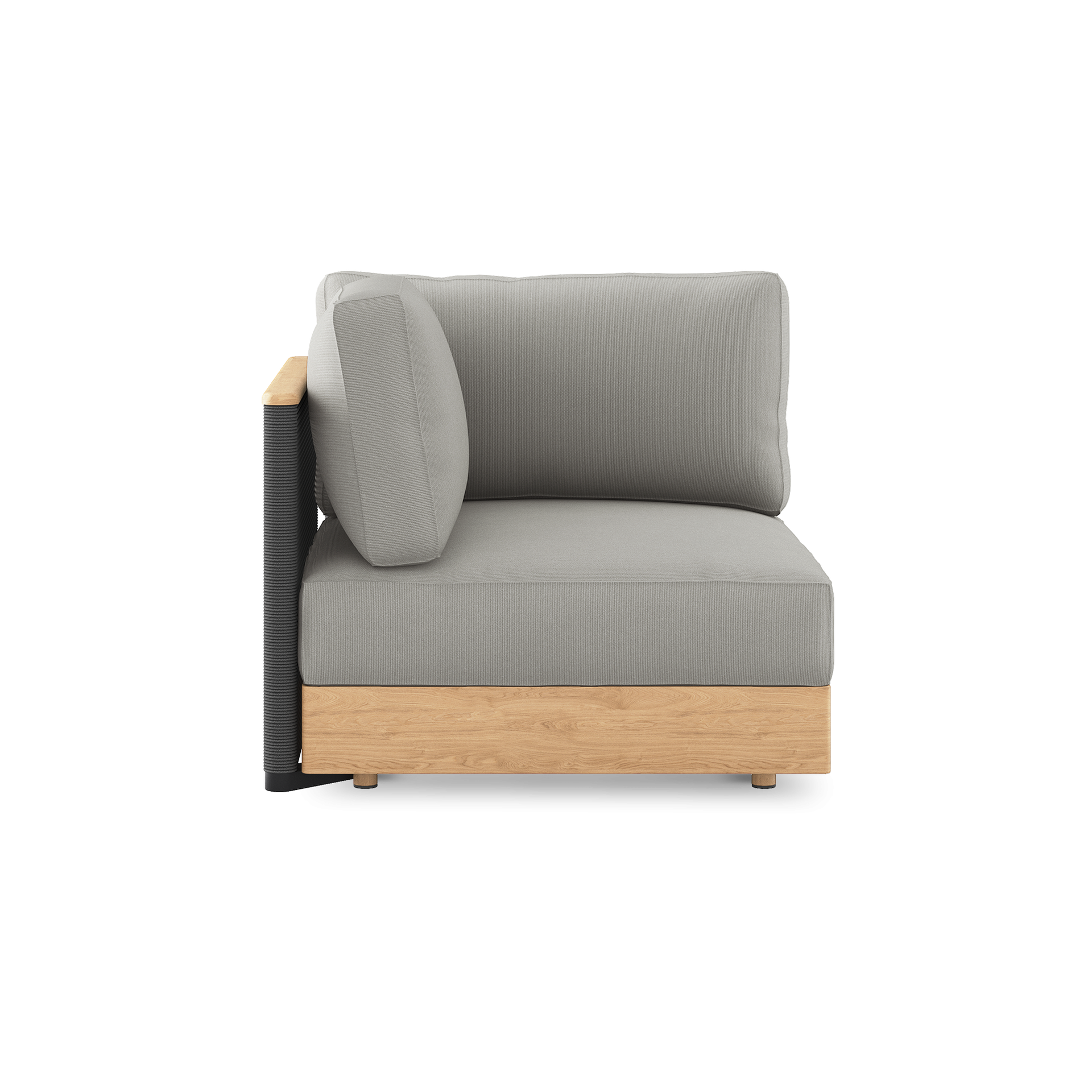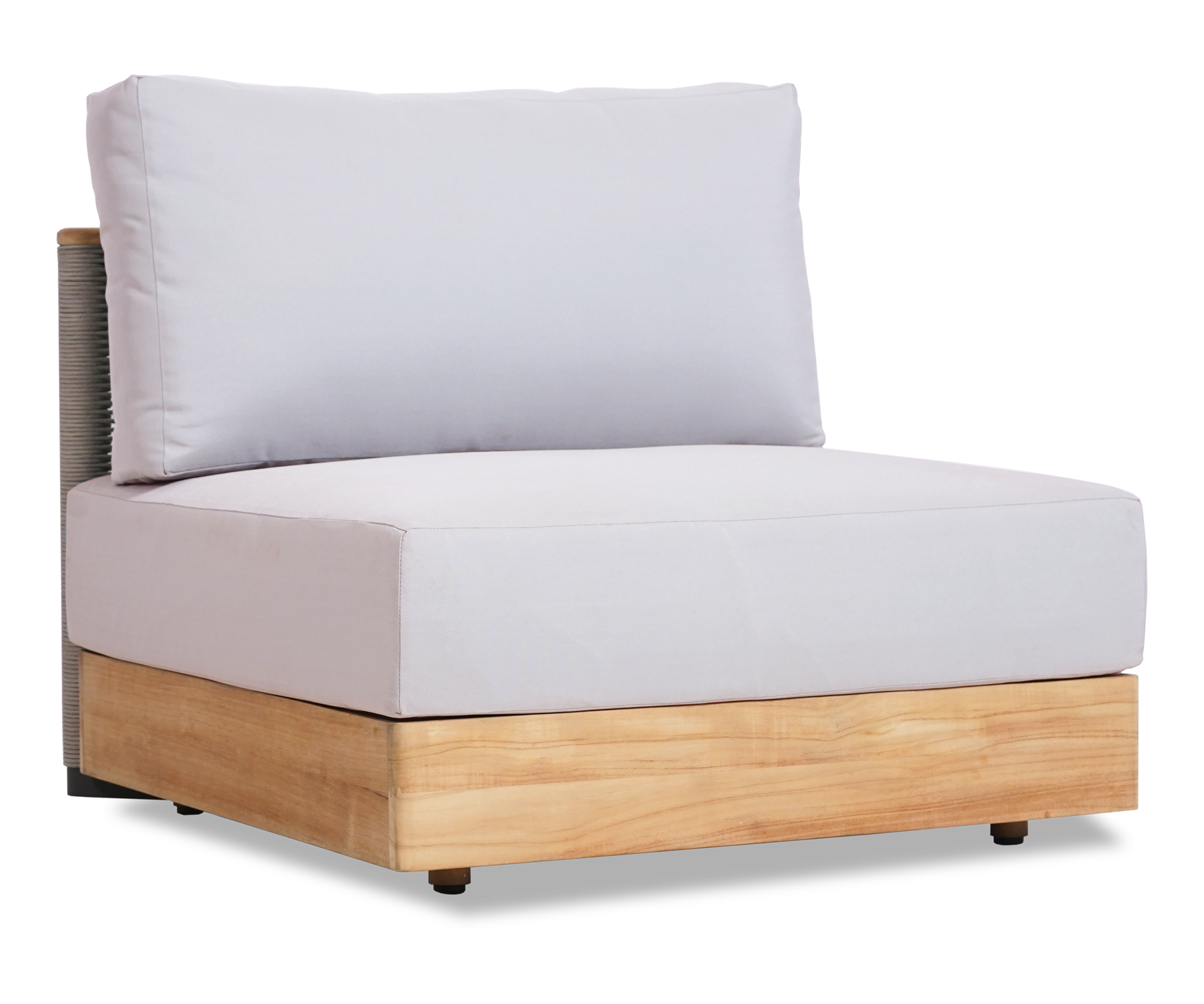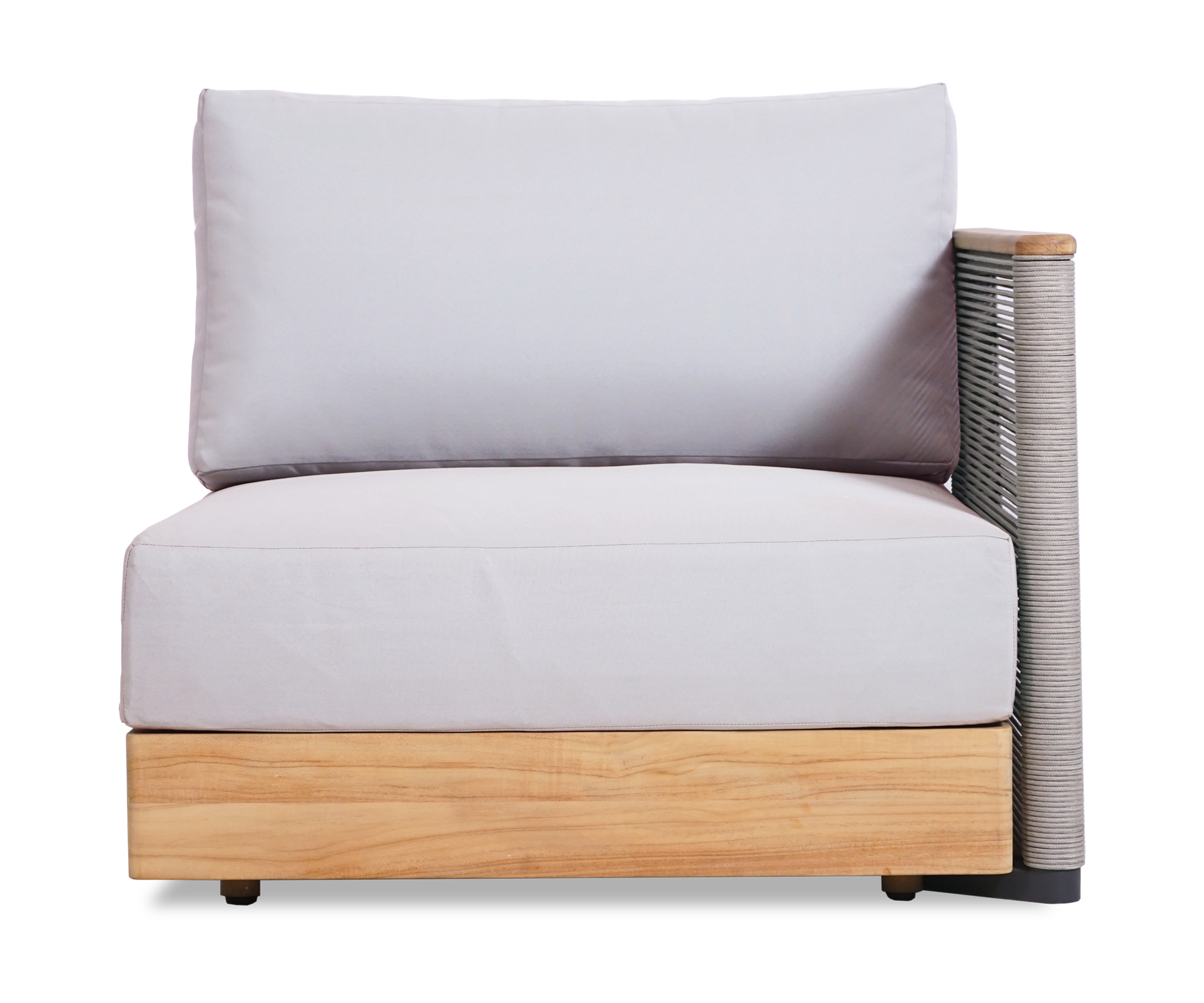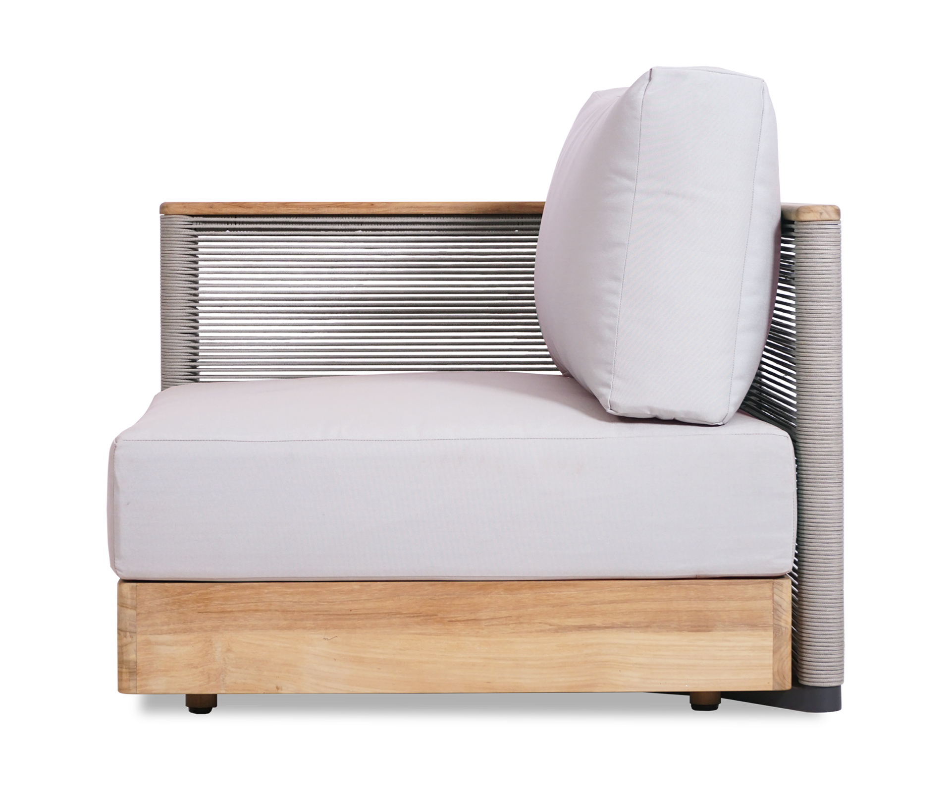 Each module features a solid teak base with an integrated outdoor sling that adds comfort while helping water drain quickly. The cushions are wrapped in high-performance Agora® fabric, known for its soft texture, UV resistance, and all-weather durability. Inside, Quick Dry Foam ensures everything dries fast and stays plush.