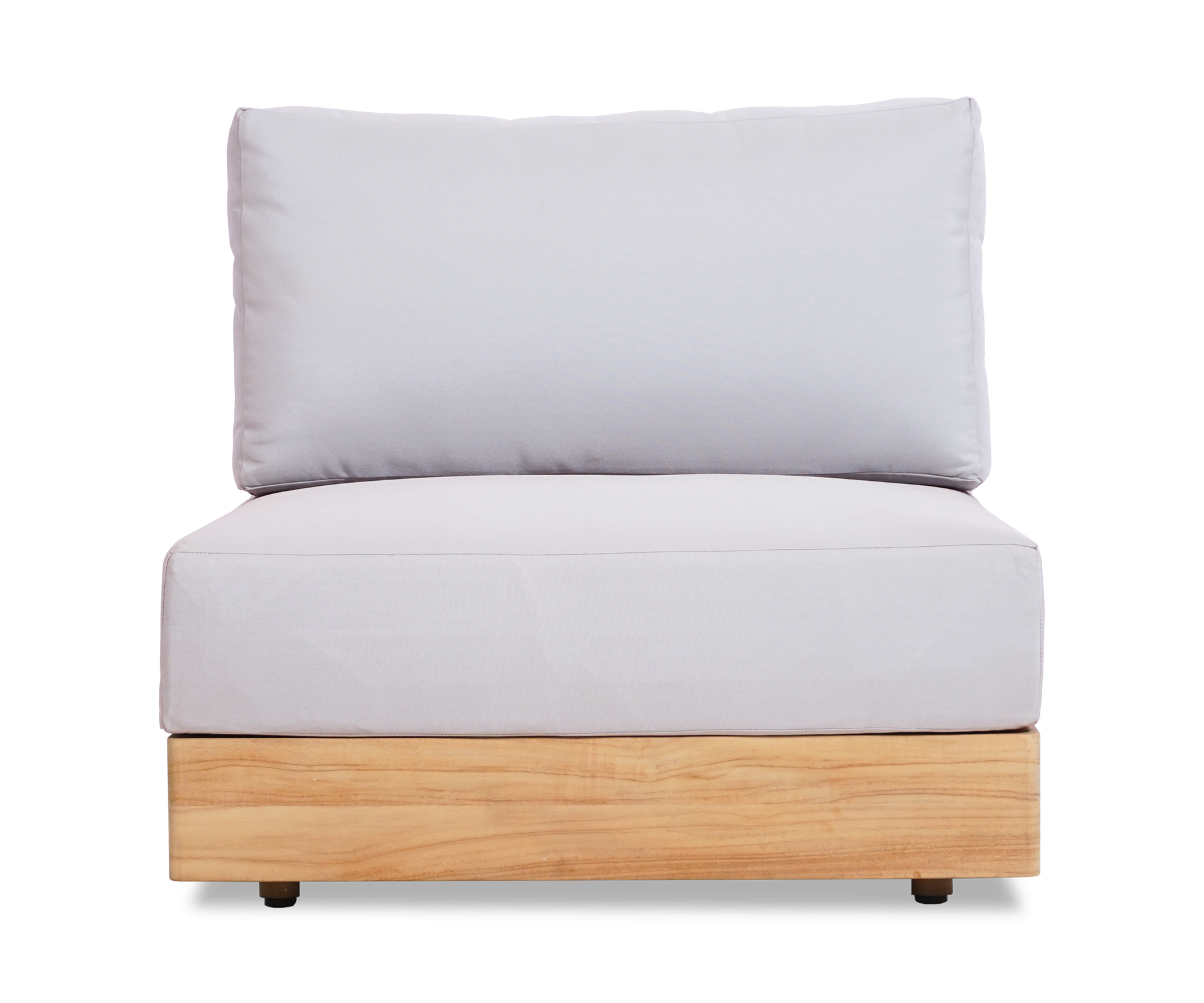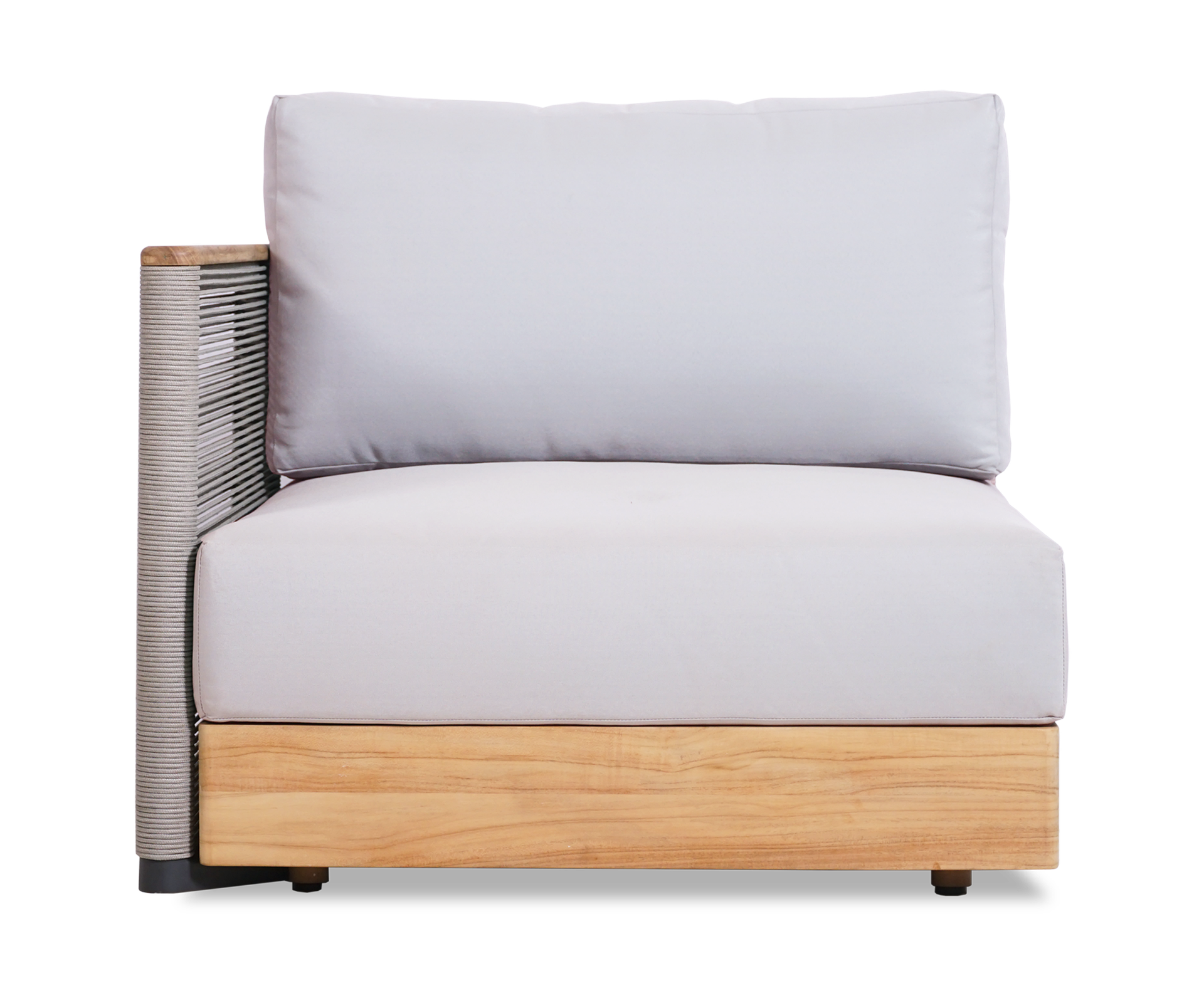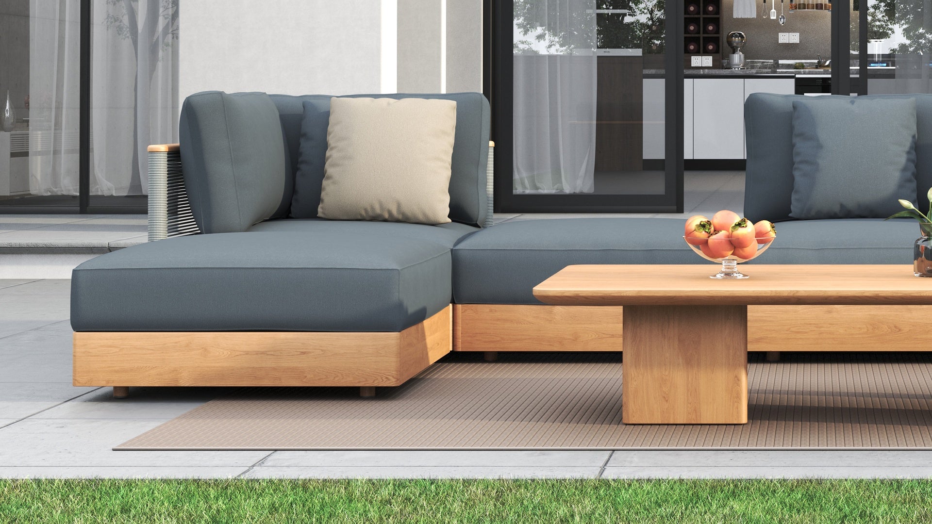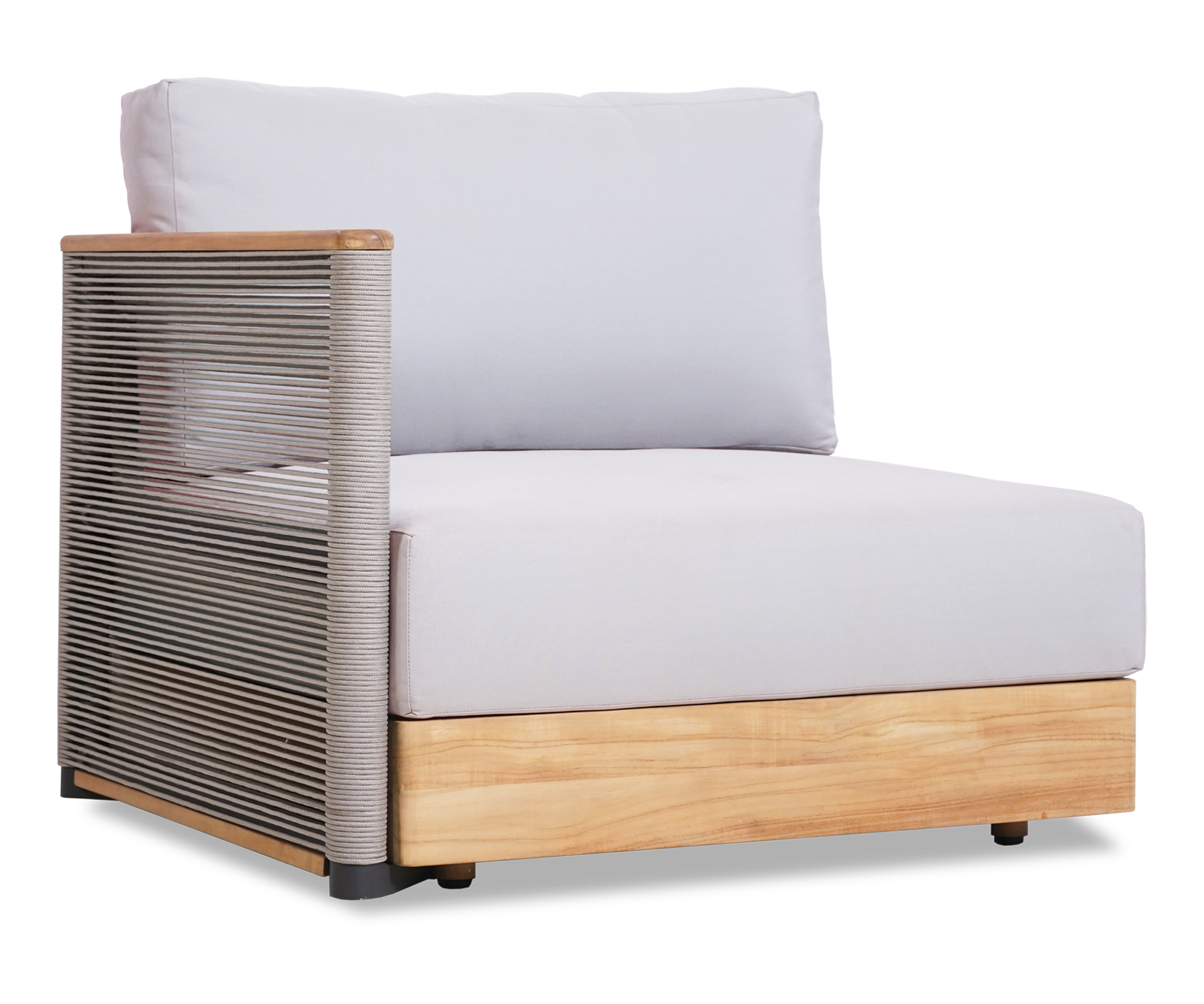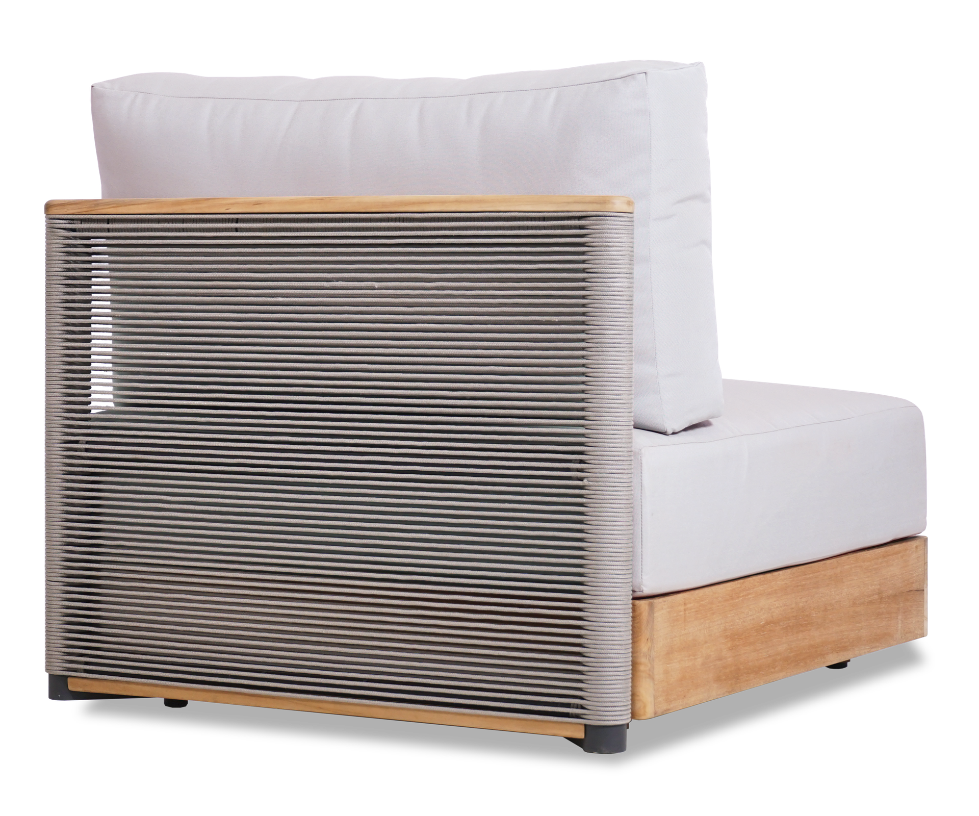 Each module features a solid teak base with an integrated outdoor sling that adds comfort while helping water drain quickly. The cushions are wrapped in high-performance Agora® fabric, known for its soft texture, UV resistance, and all-weather durability. Inside, Quick Dry Foam ensures everything dries fast and stays plush.
