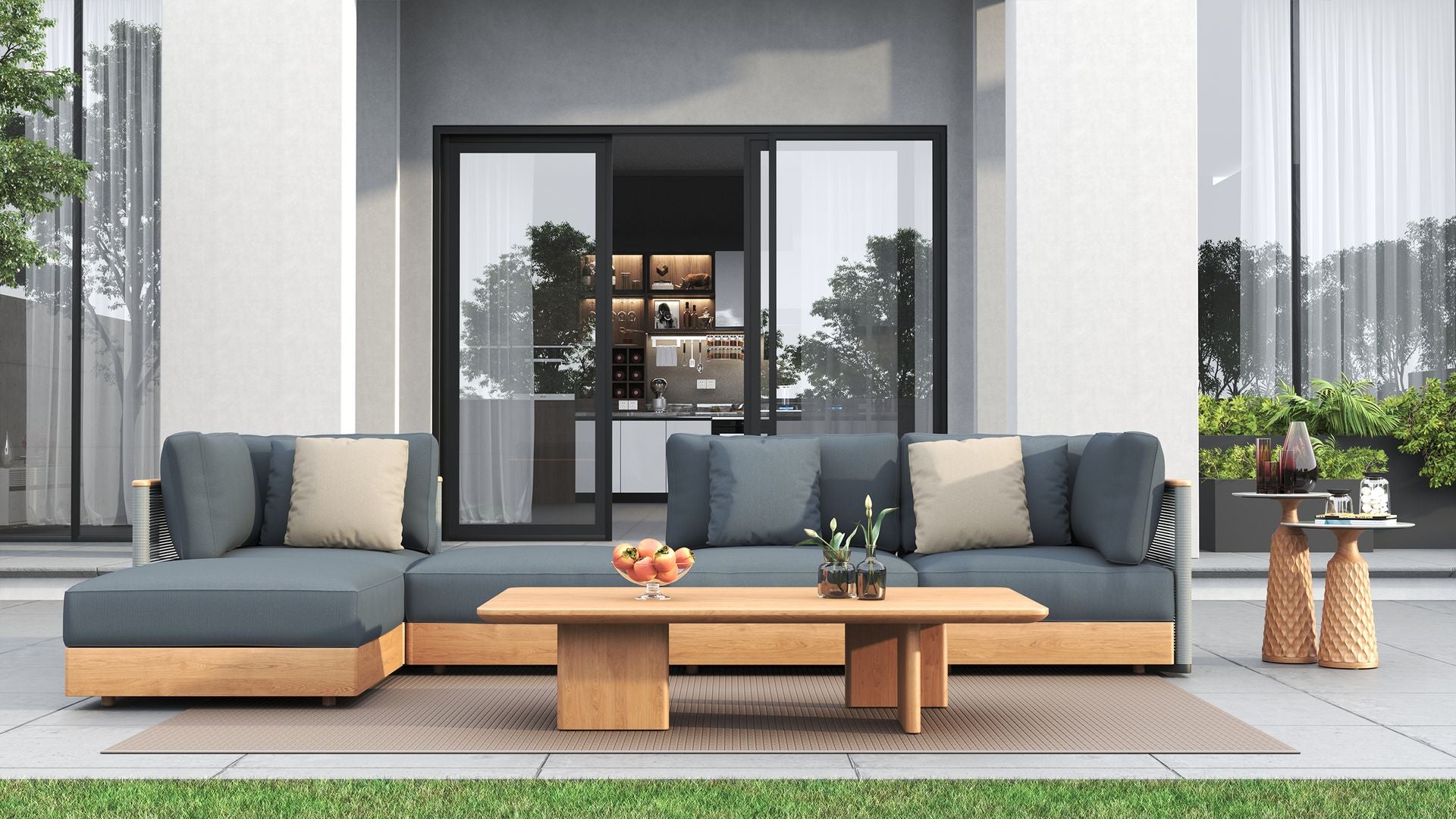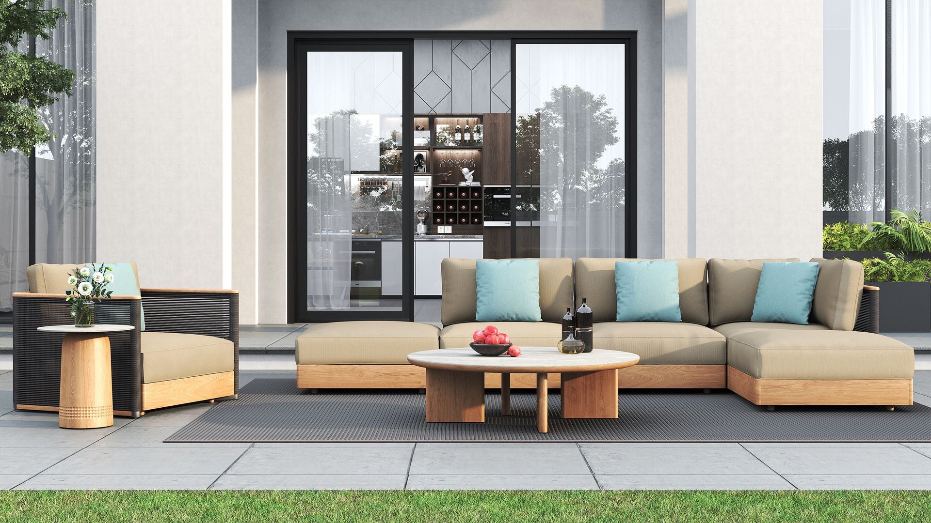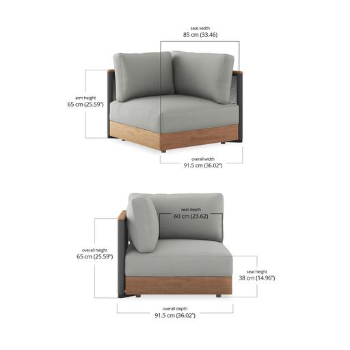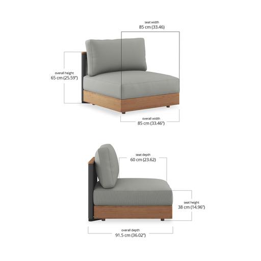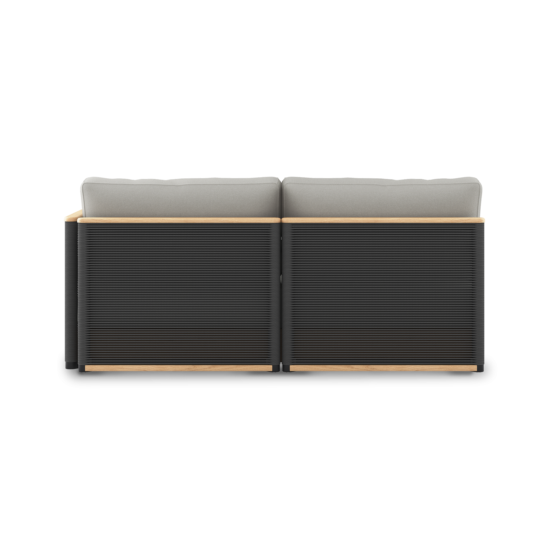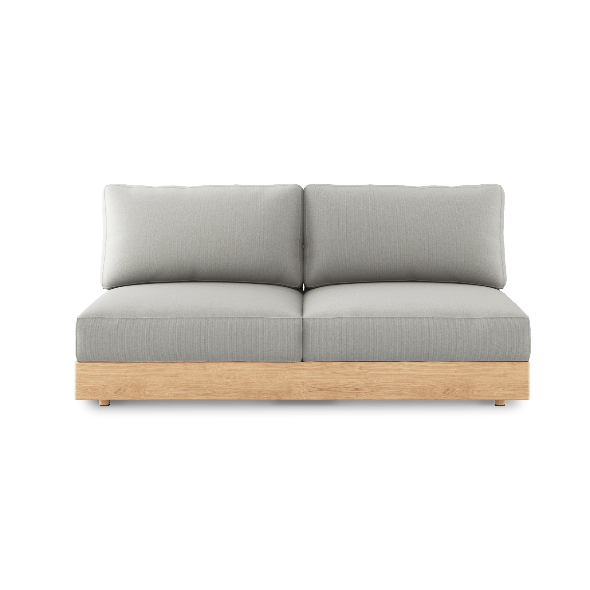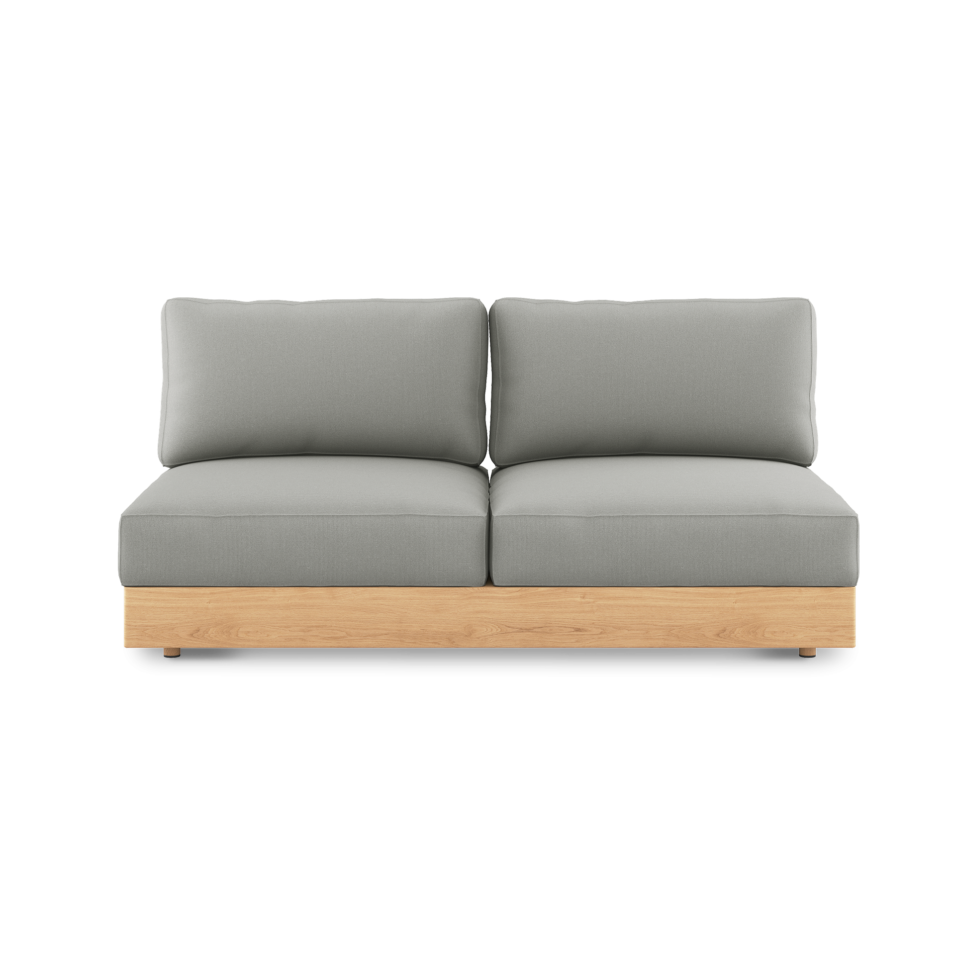 Each module features a solid teak base with an integrated outdoor sling that adds comfort while helping water drain quickly. The cushions are wrapped in high-performance Agora® fabric, known for its soft texture, UV resistance, and all-weather durability. Inside, Quick Dry Foam ensures everything dries fast and stays plush.