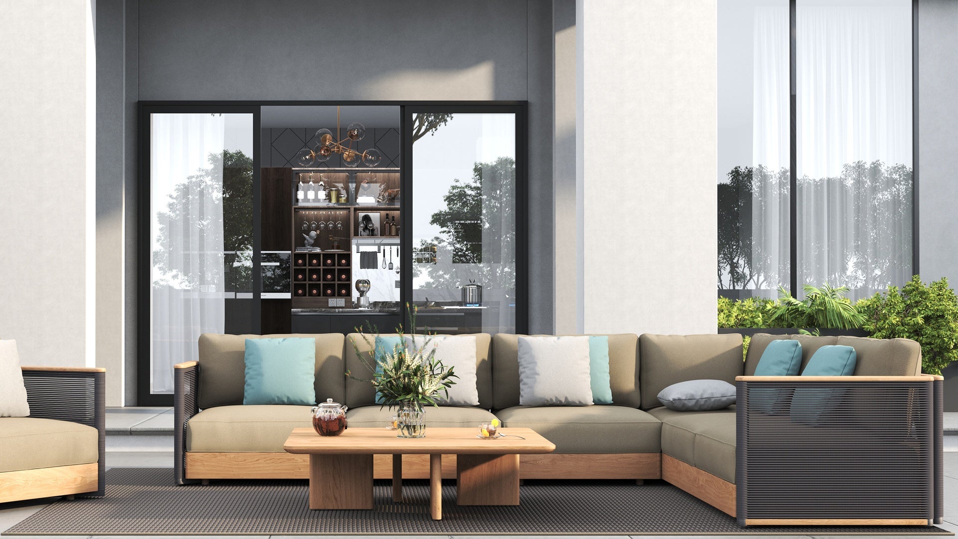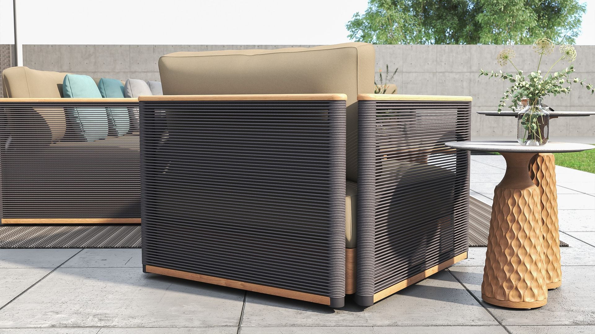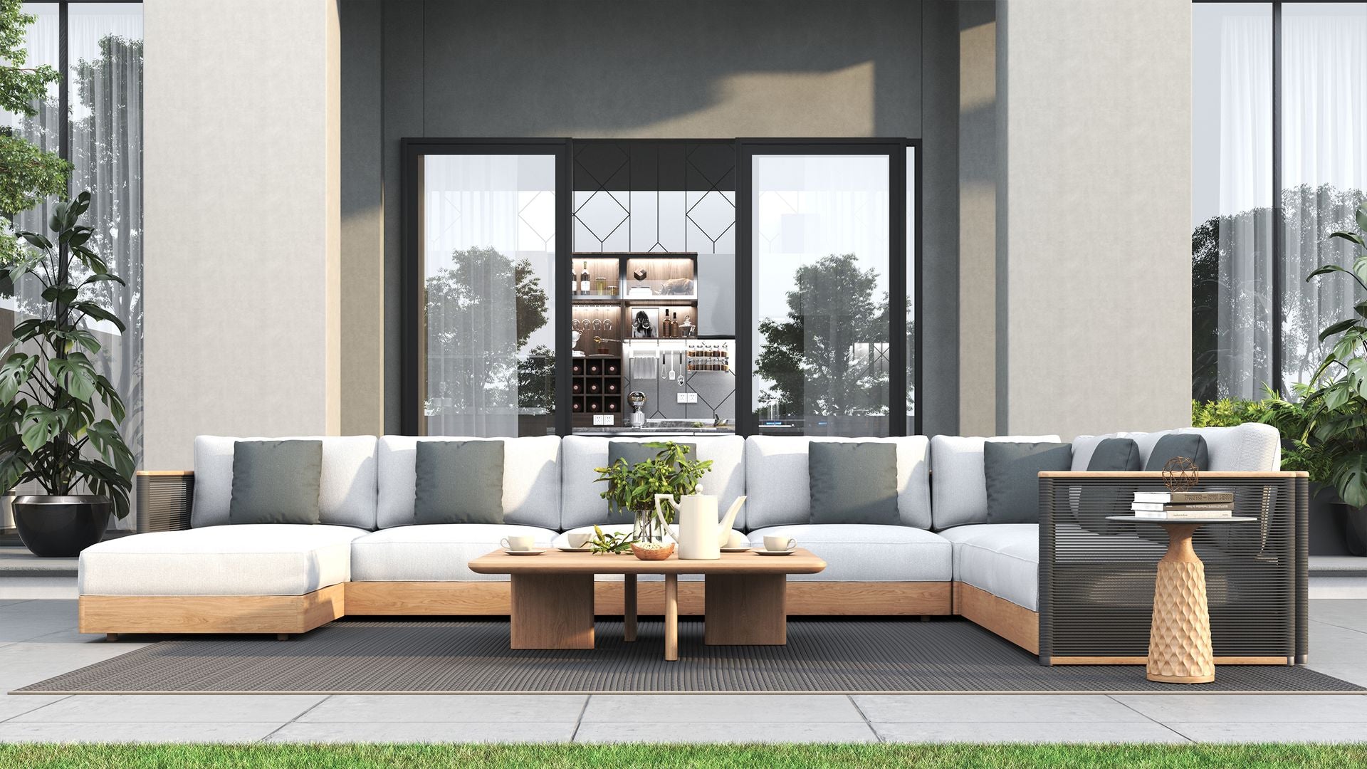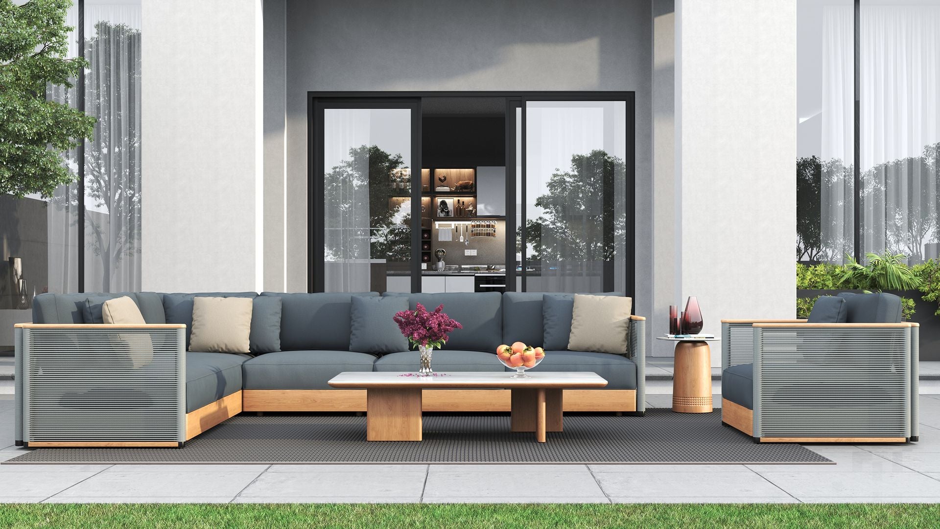 Each module features a solid teak base with an integrated outdoor sling that adds comfort while helping water drain quickly. The cushions are wrapped in high-performance Agora® fabric, known for its soft texture, UV resistance, and all-weather durability. Inside, Quick Dry Foam ensures everything dries fast and stays plush.