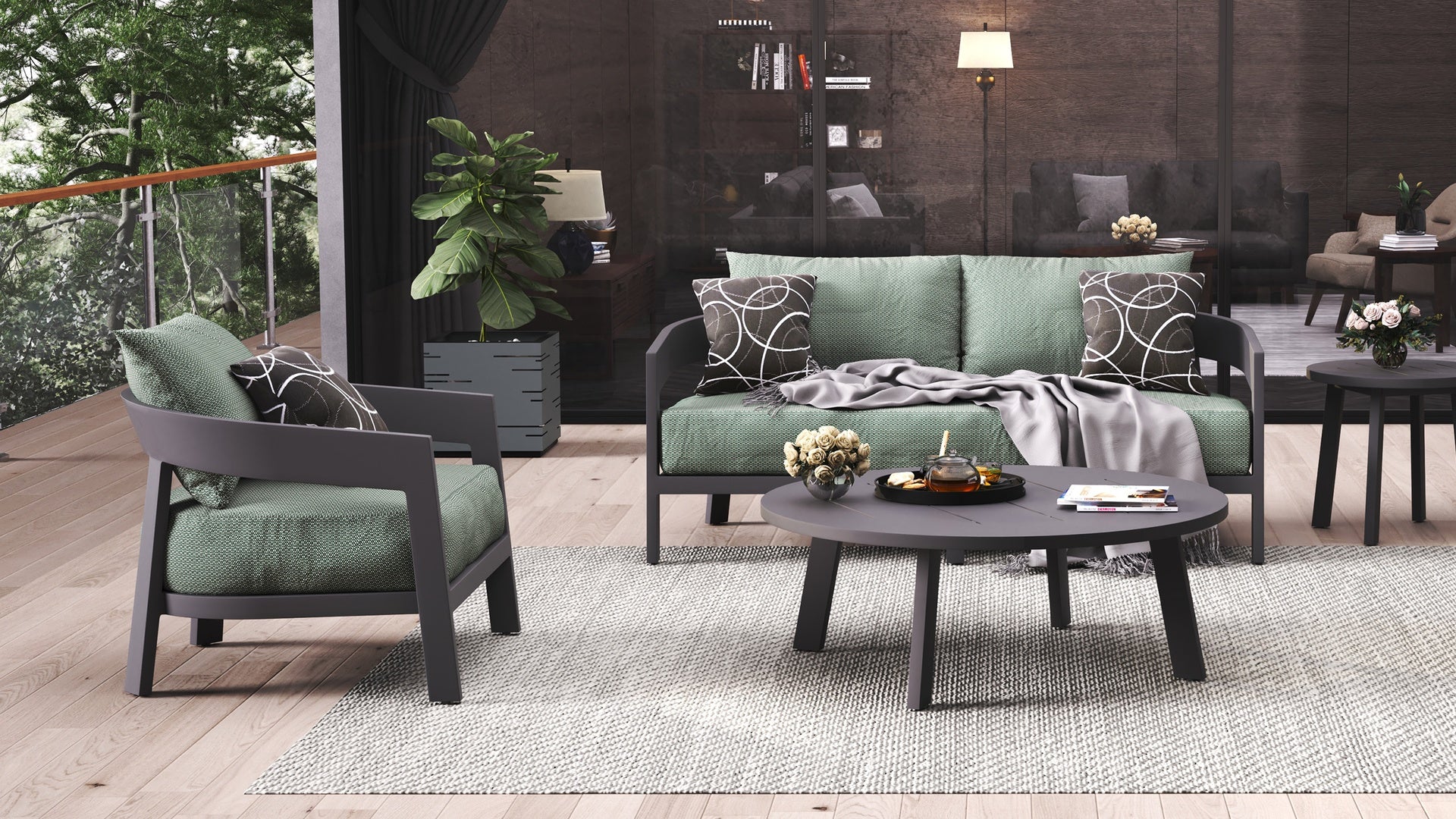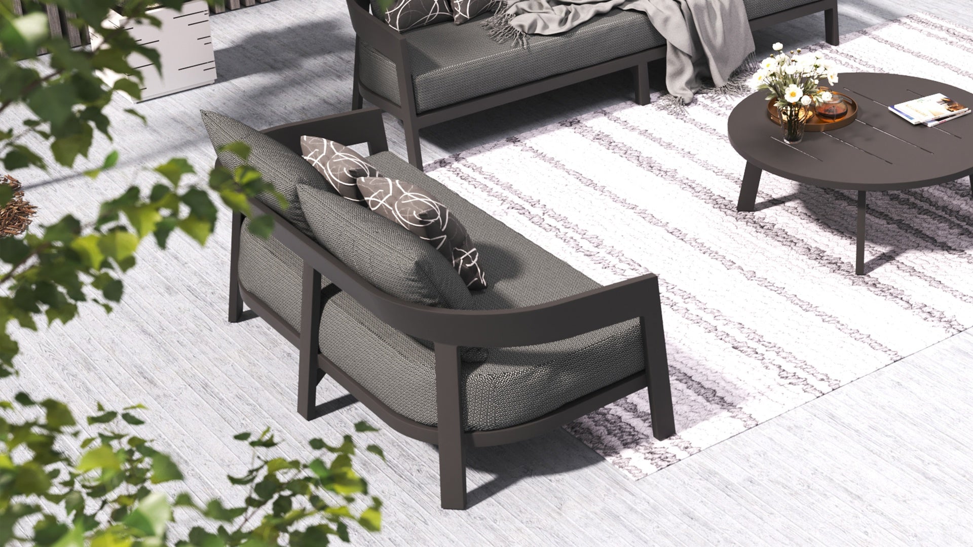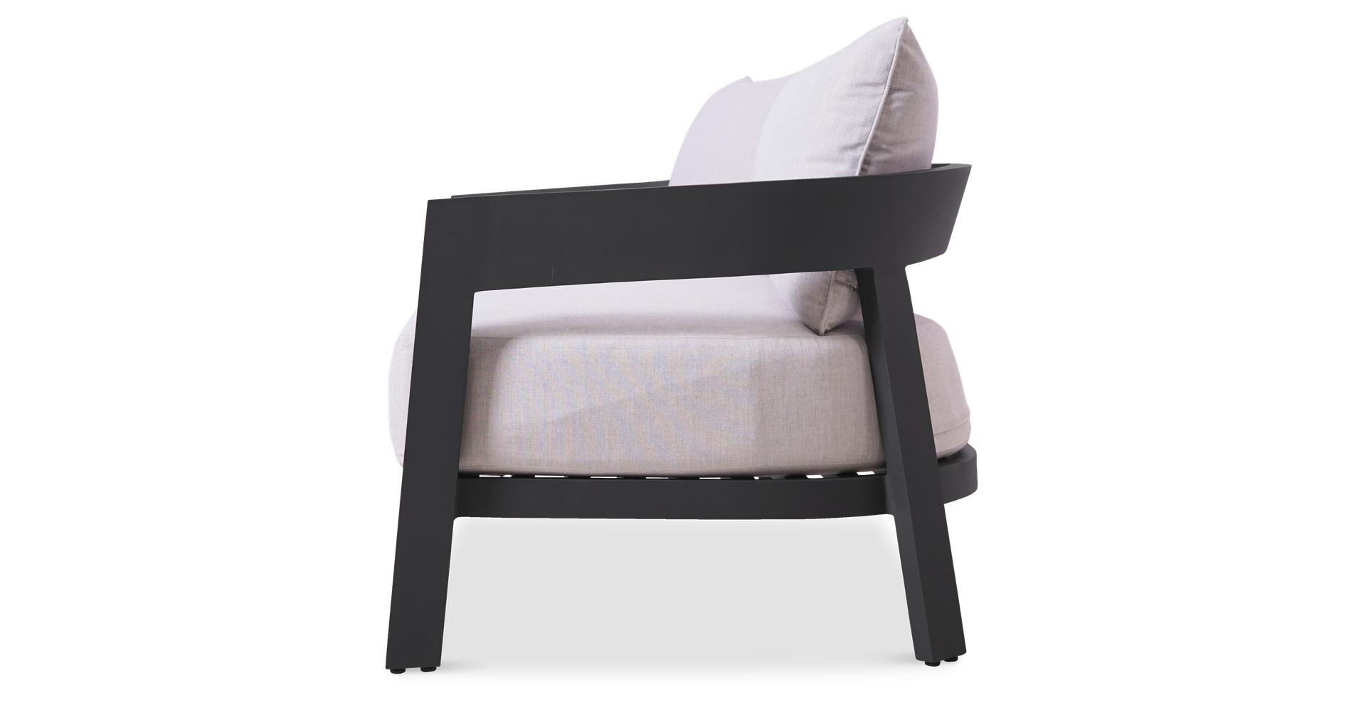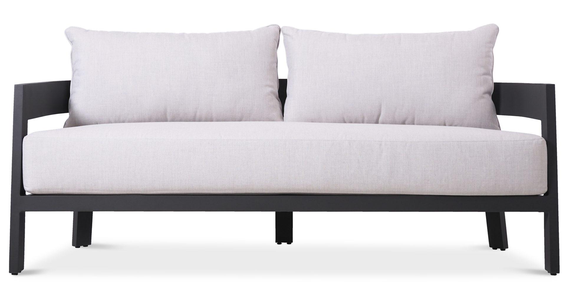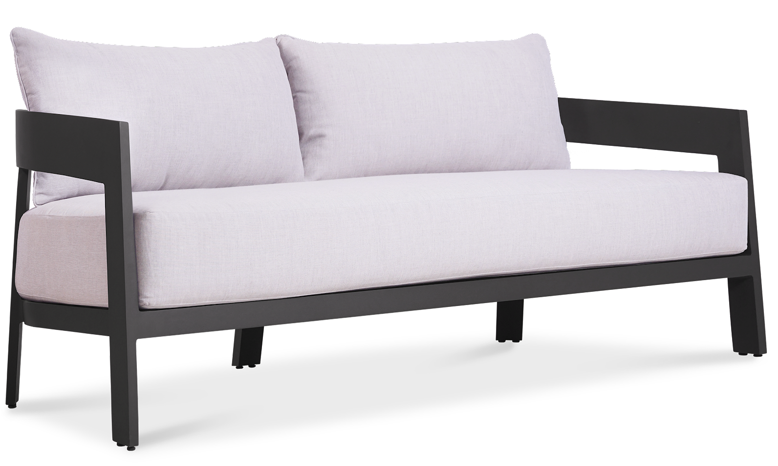 A sleek outdoor sofa crafted with a powder-coated aluminium frame, perfect for coastal or humid climates. The contemporary silhouette combines clean lines with wide proportions for relaxed, modern comfort.