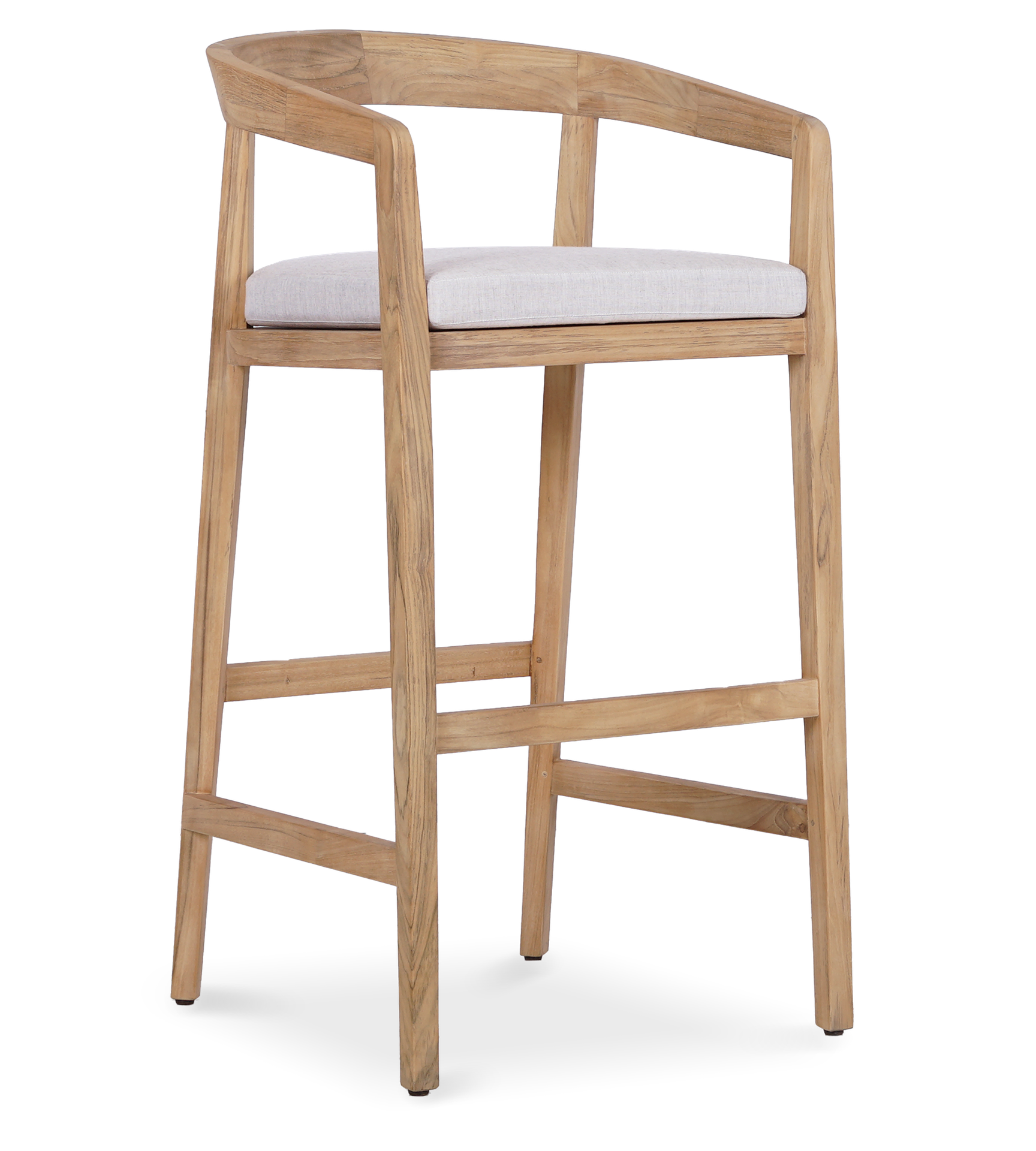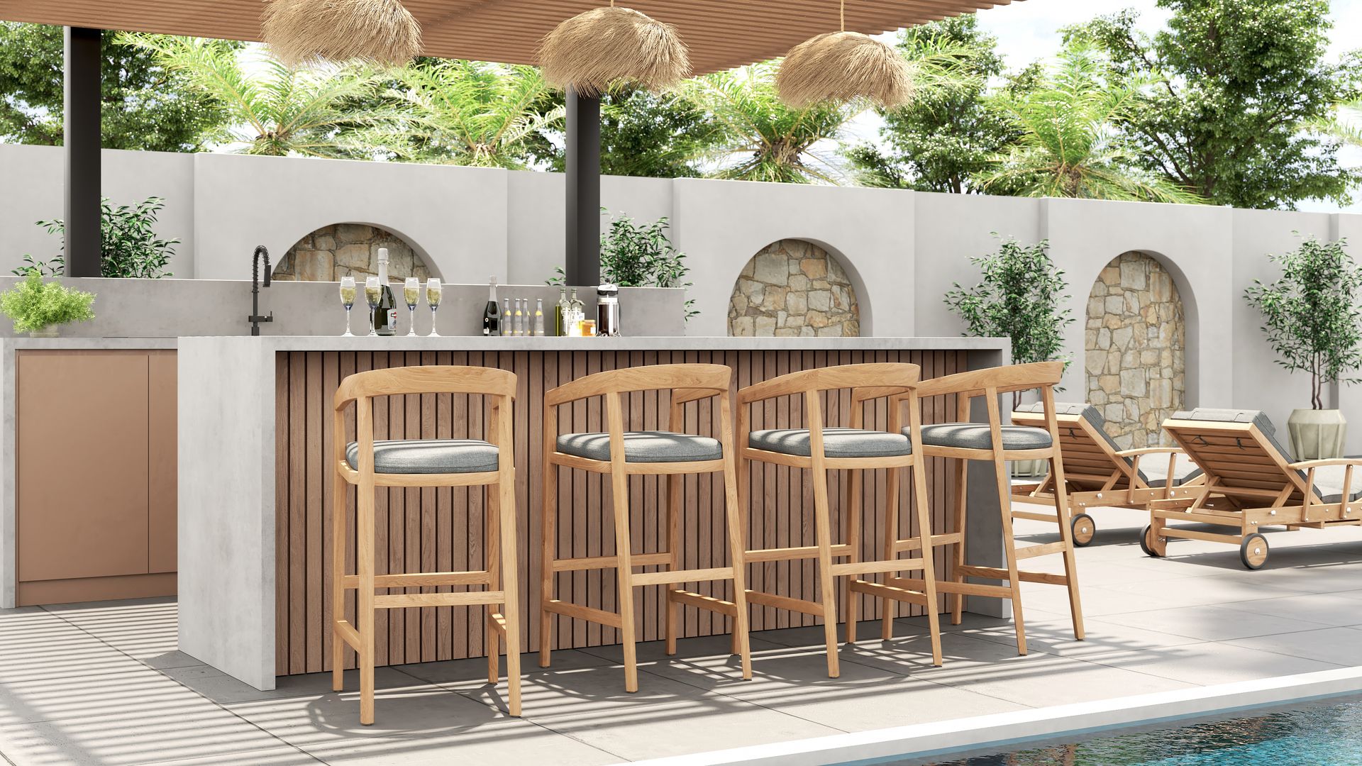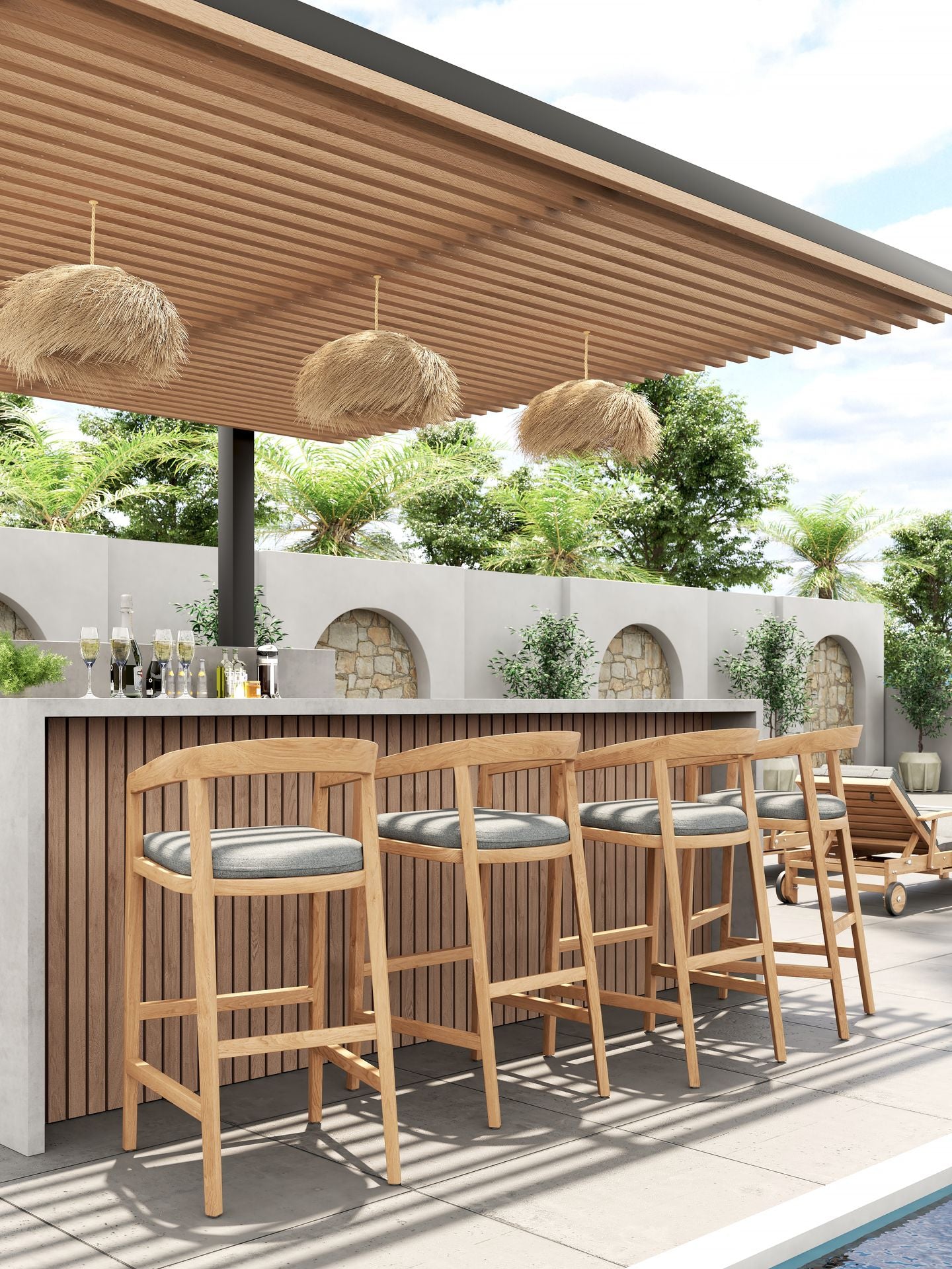 Perched at just the right height for poolside cocktails or casual kitchen chats, the vento bar chair combines sculptural lines with everyday comfort. Crafted from solid, sustainably sourced teak, its curved backrest and angled legs create a light, airy silhouette that doesn’t skimp on strength.