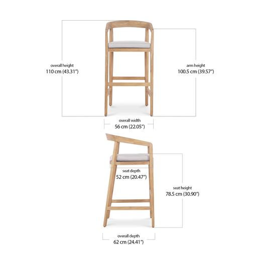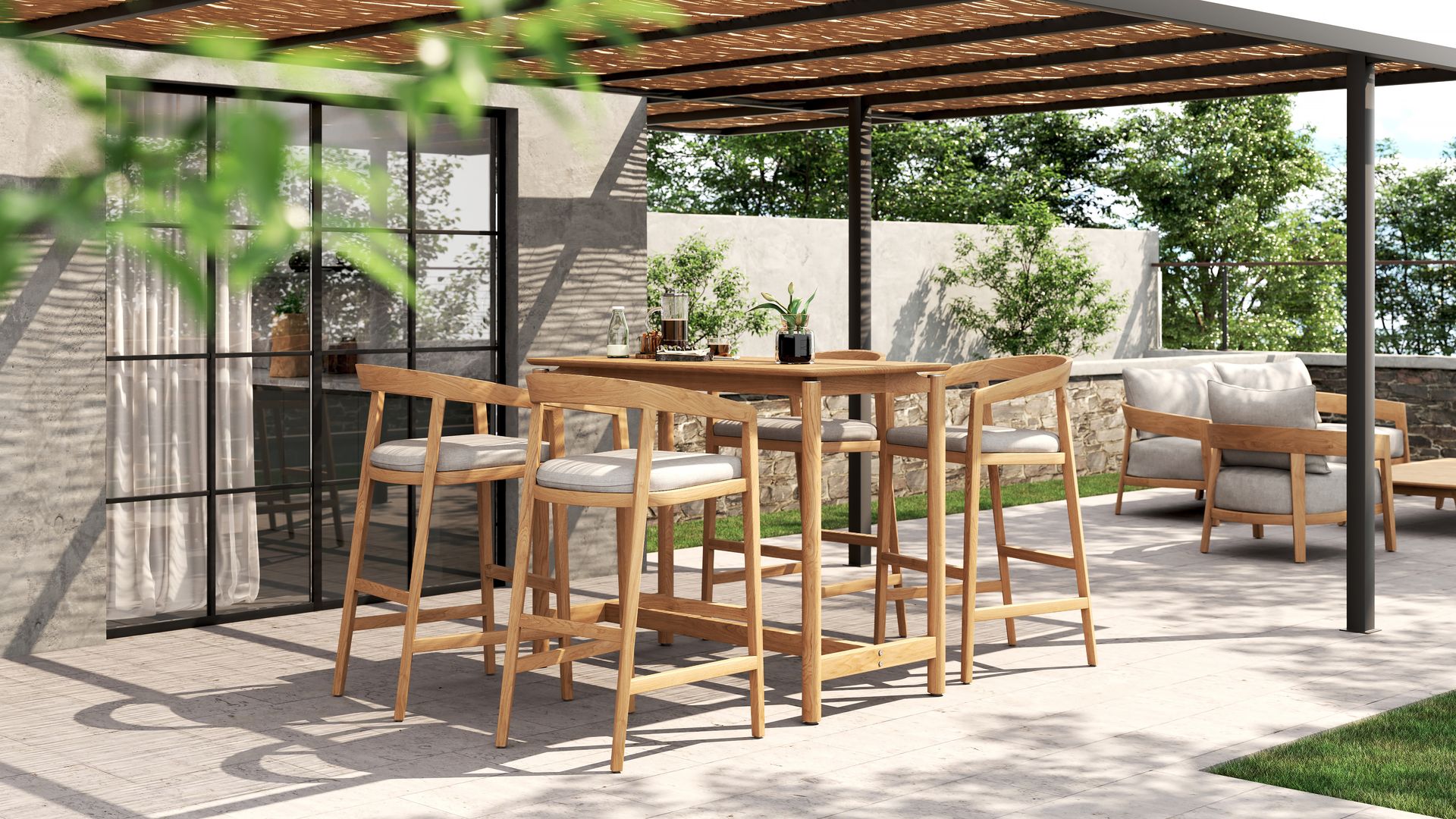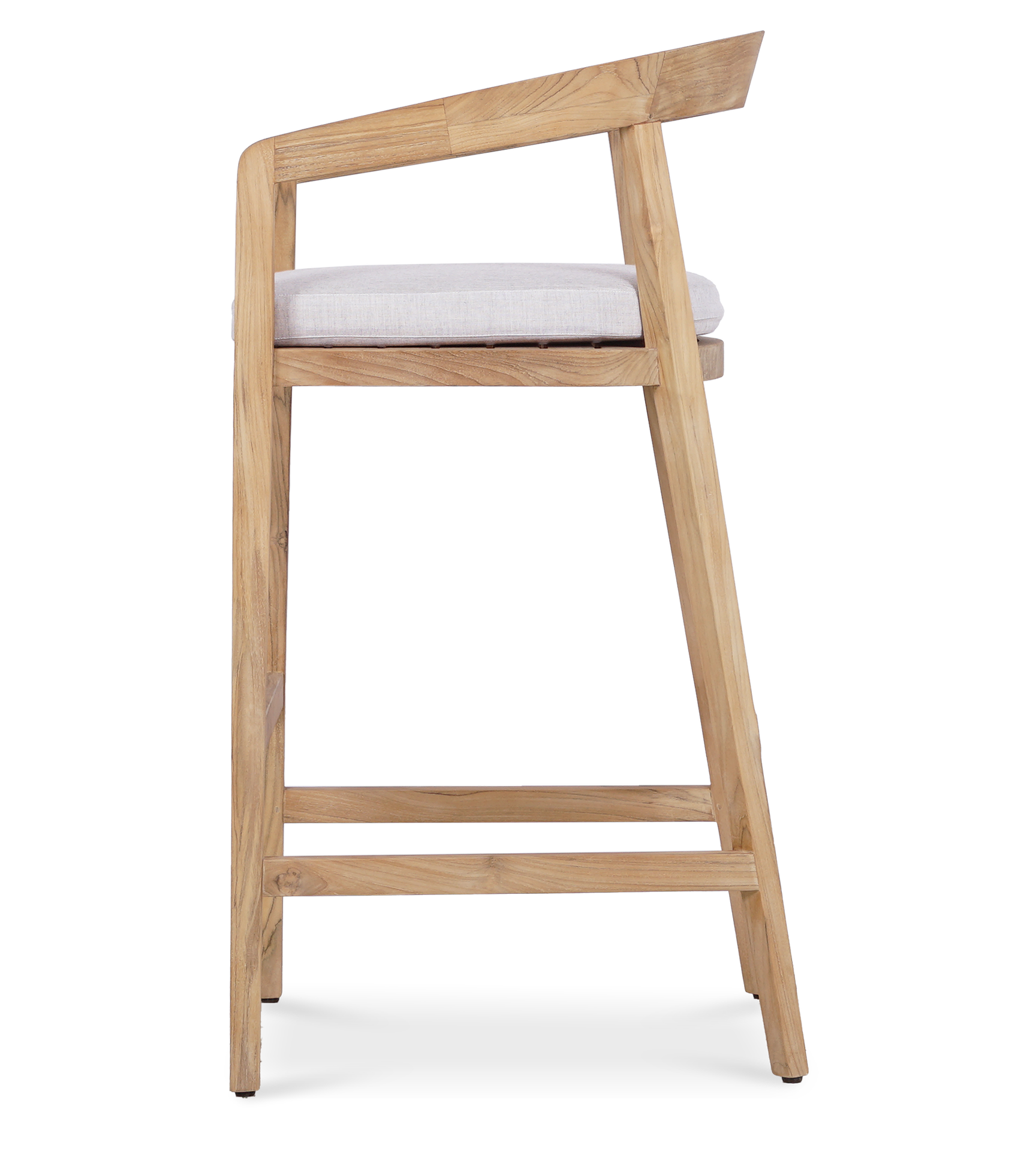 Perched at just the right height for poolside cocktails or casual kitchen chats, the vento bar chair combines sculptural lines with everyday comfort. Crafted from solid, sustainably sourced teak, its curved backrest and angled legs create a light, airy silhouette that doesn’t skimp on strength.