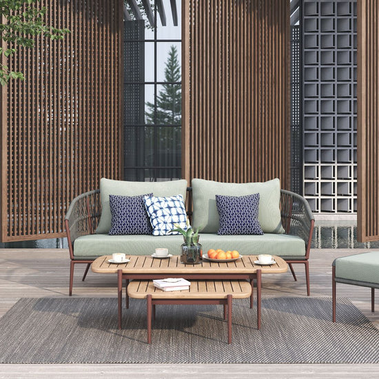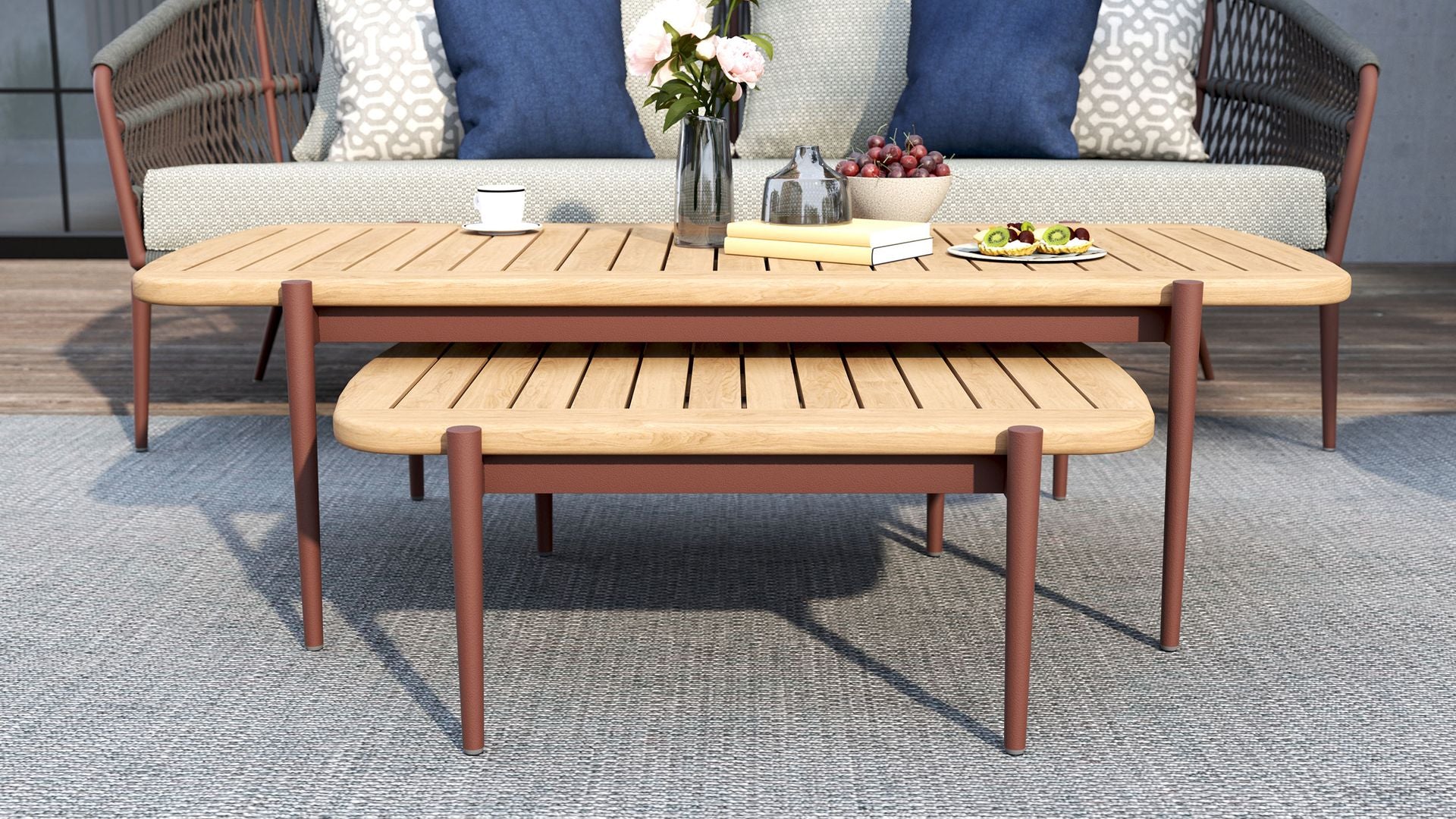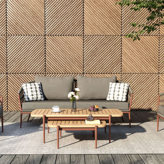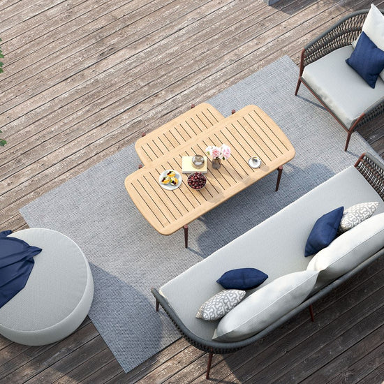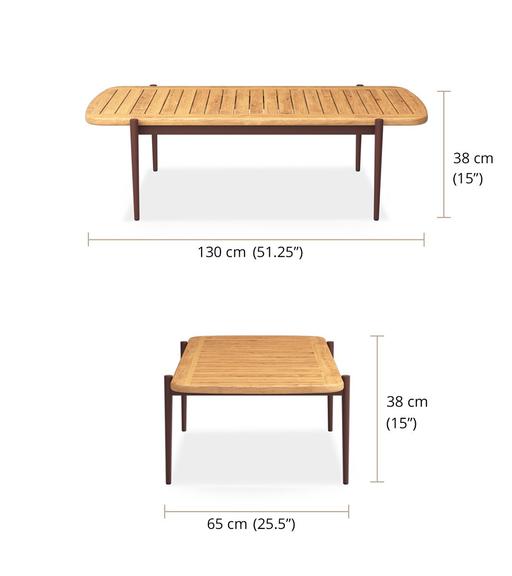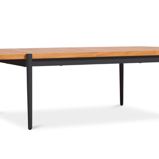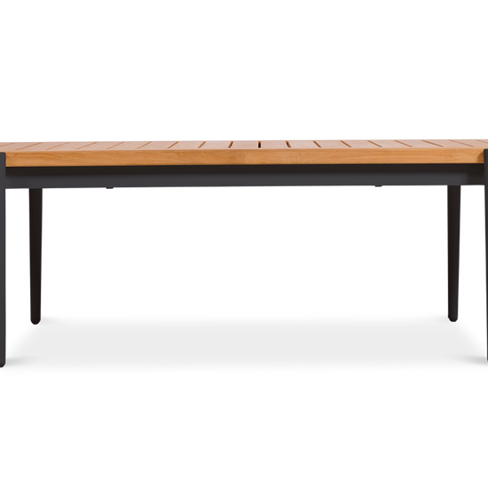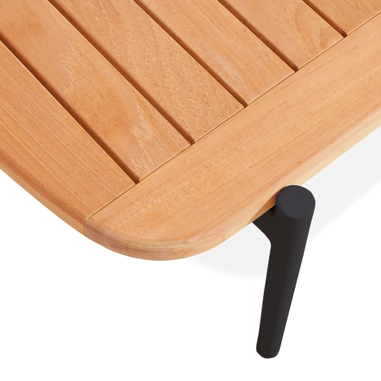 Clean lines and clever construction define the vino coffee table. Crafted with a powder-coated aluminium frame and topped with a slatted teak surface, this piece is made to handle the elements with style. The open slat design allows rainwater to pass through, helping to keep things dry and practical outdoors. Its relaxed low height makes it the perfect partner for lounging, while the matching nesting table adds versatility to your setup.