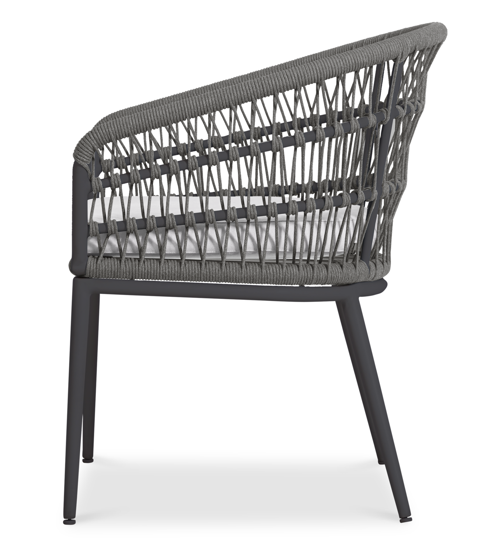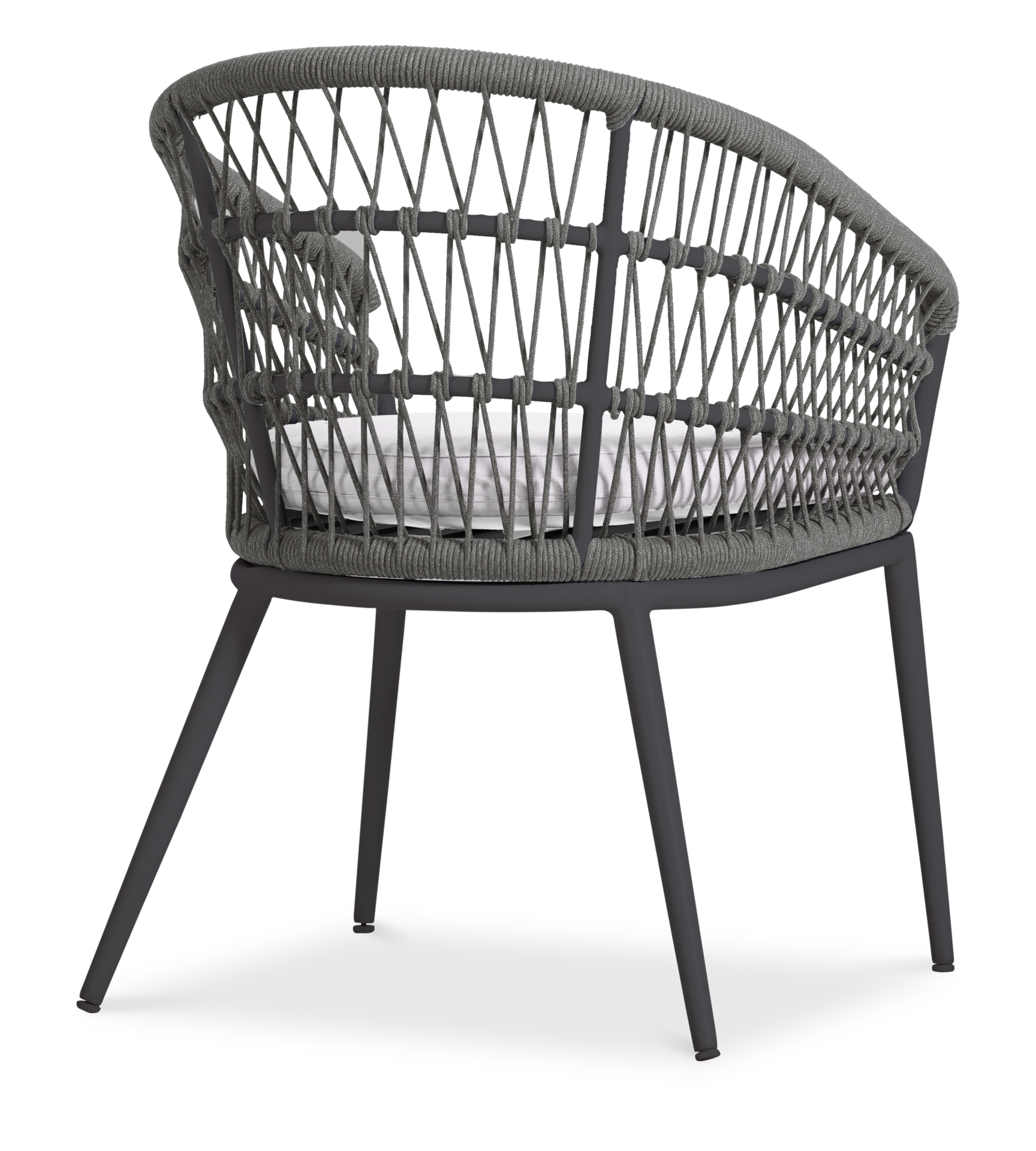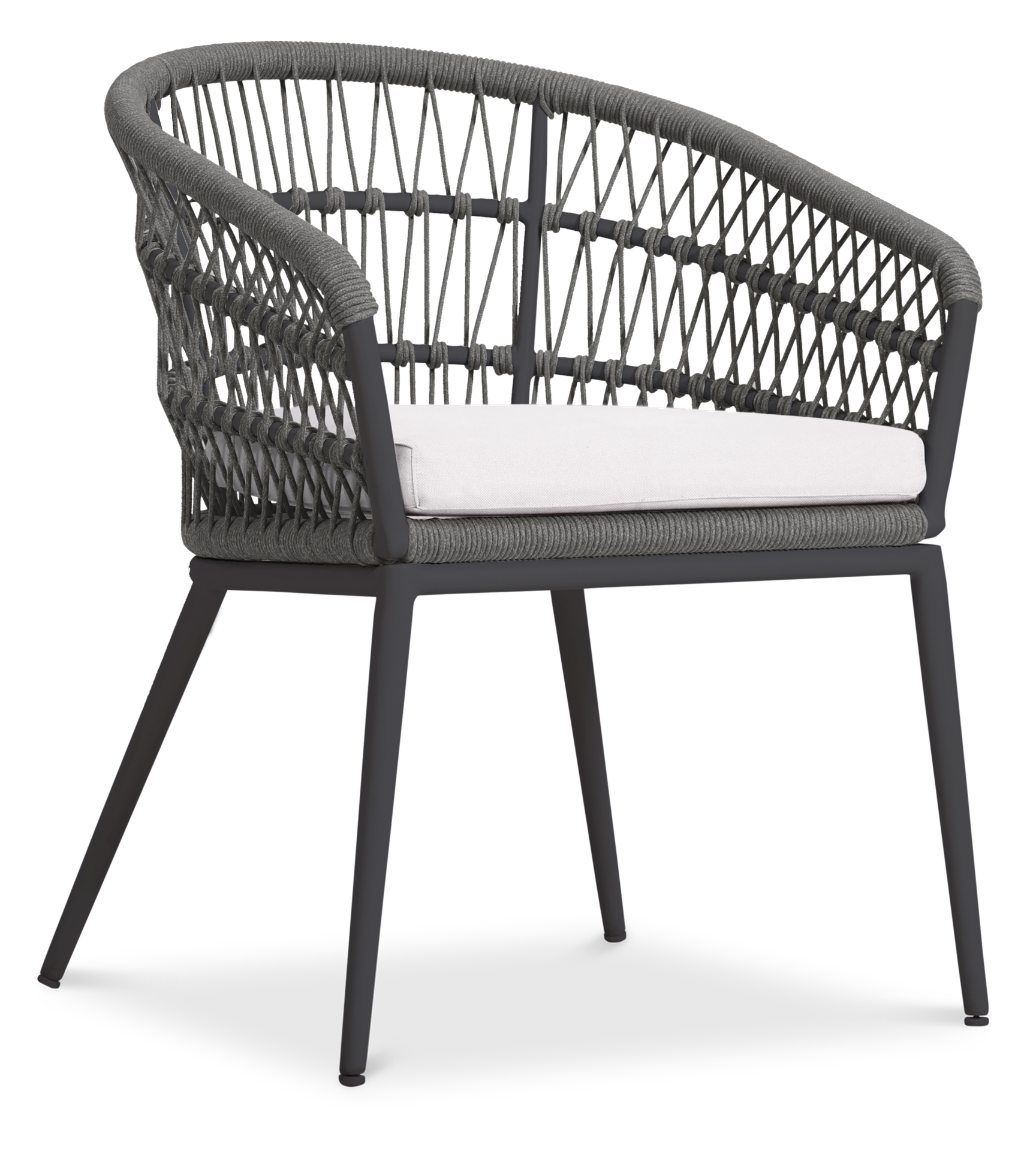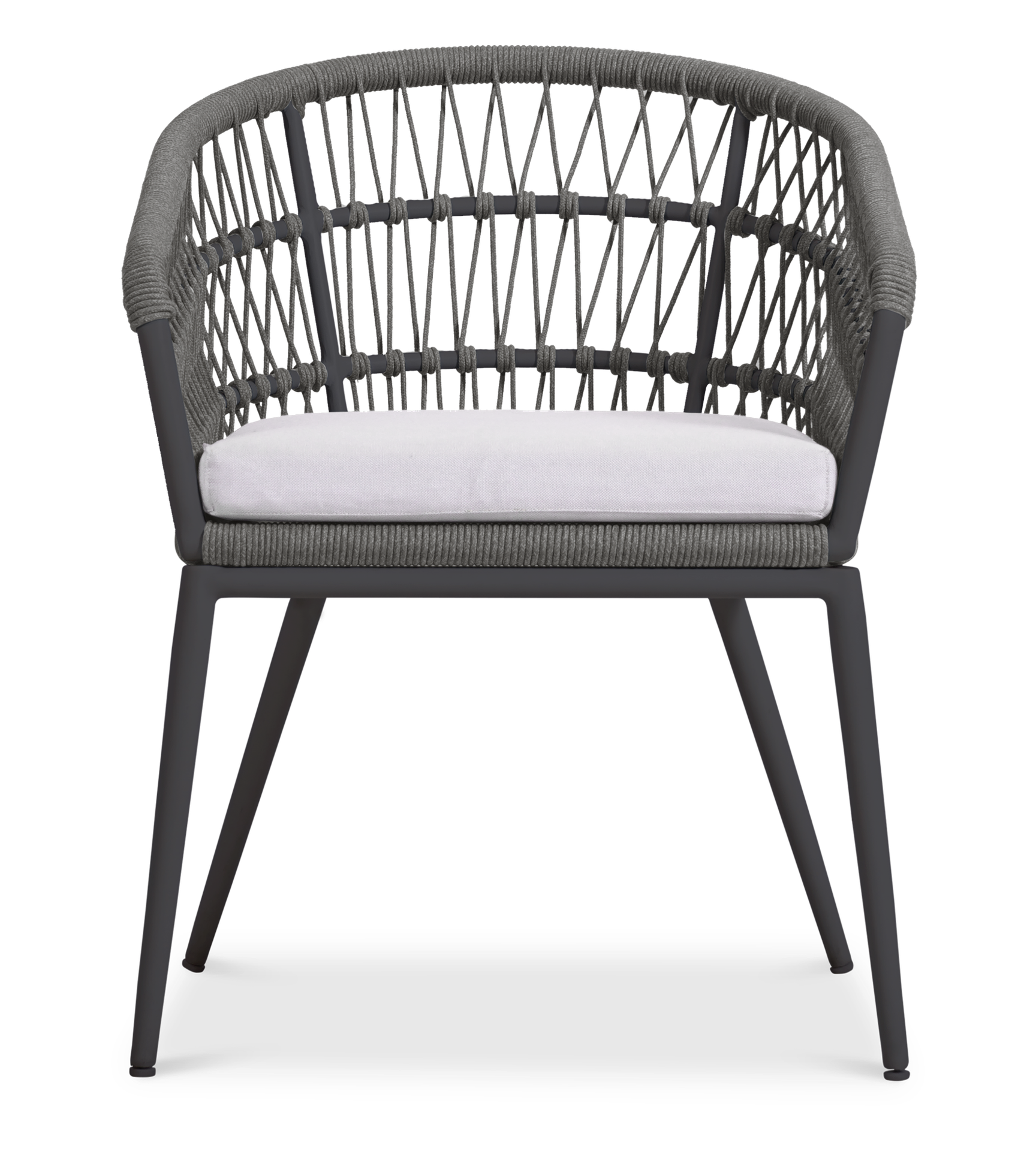 Add a little flair to your alfresco setting with the vino dining chair. Its distinctive criss-cross rope pattern brings textural charm, while the curved armrests and powder-coated aluminium frame deliver long-lasting outdoor comfort. Crafted with UV-protected olefin rope, it stays strong and stylish through the seasons without the need for maintenance. The powder-coated aluminium frame resists rust and fading, making it ideal for coastal or humid environments. A gently contoured backrest and curved arms provide support through long, leisurely meals. Pair it with a removable cushion in premium outdoor fabric for added comfort, sold separately.