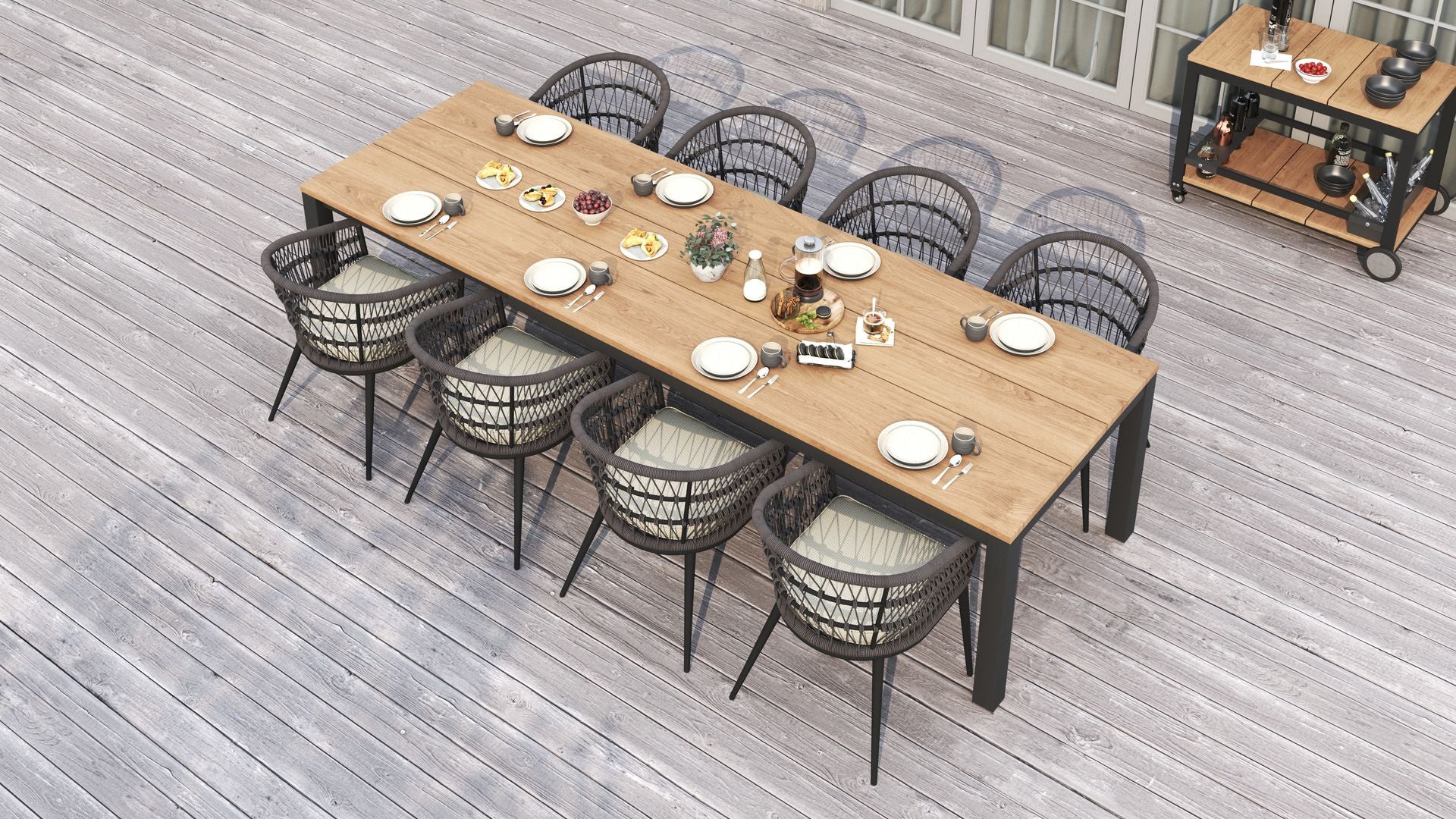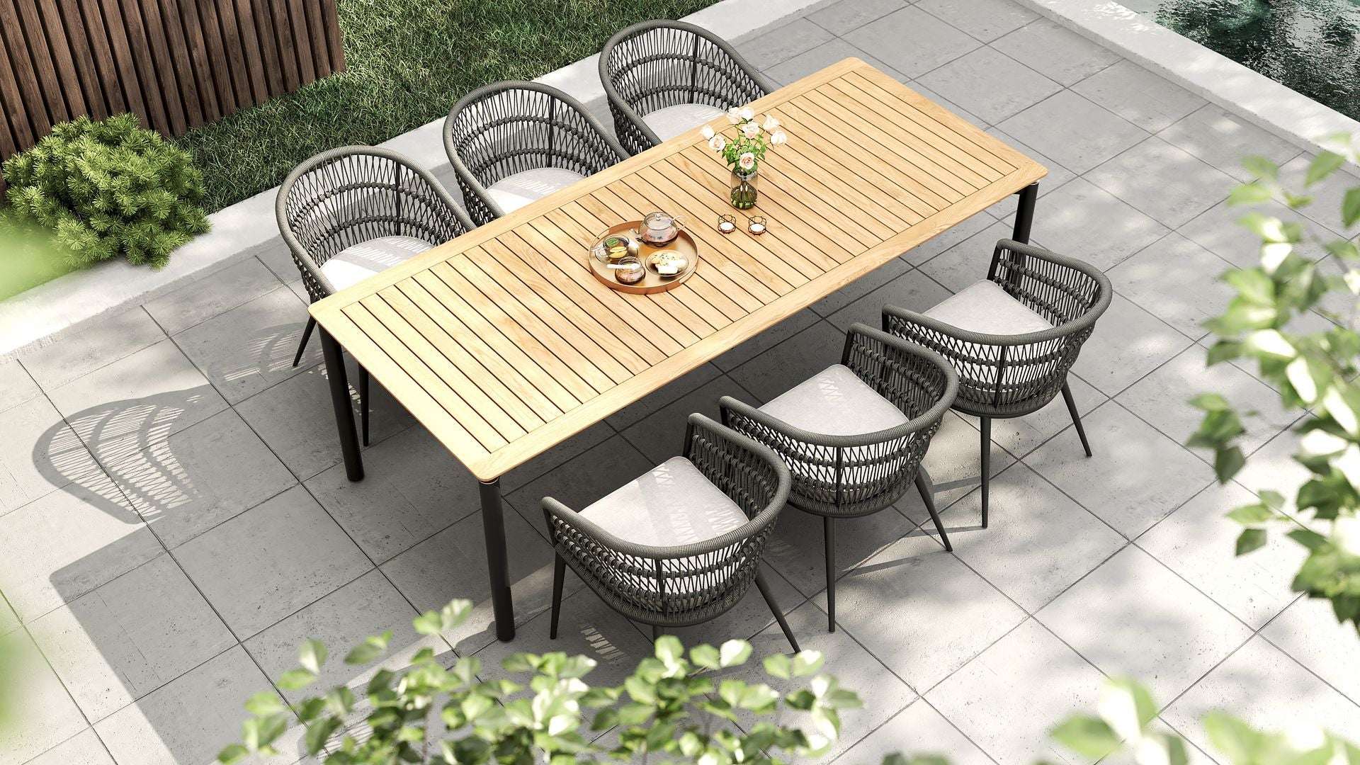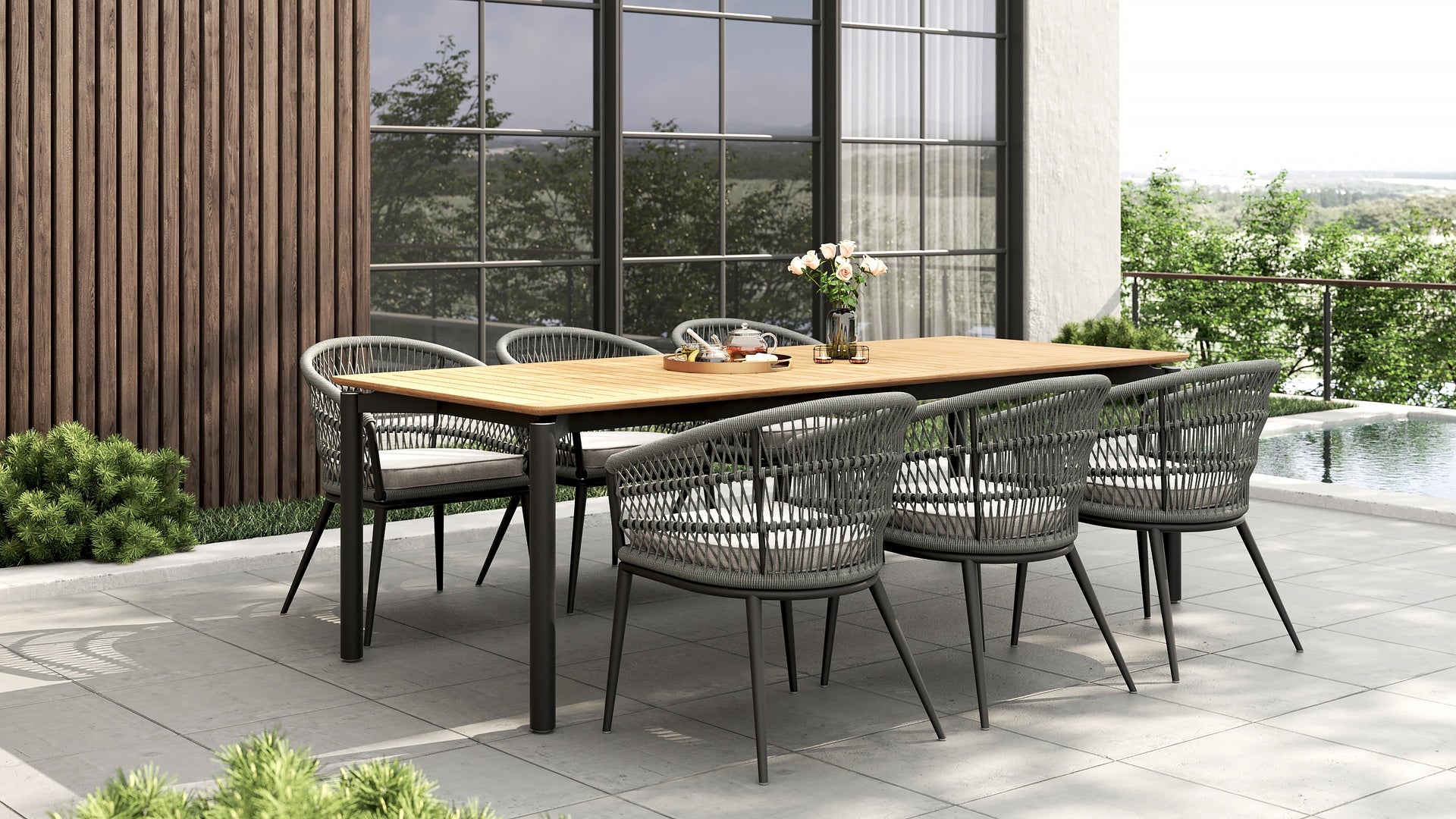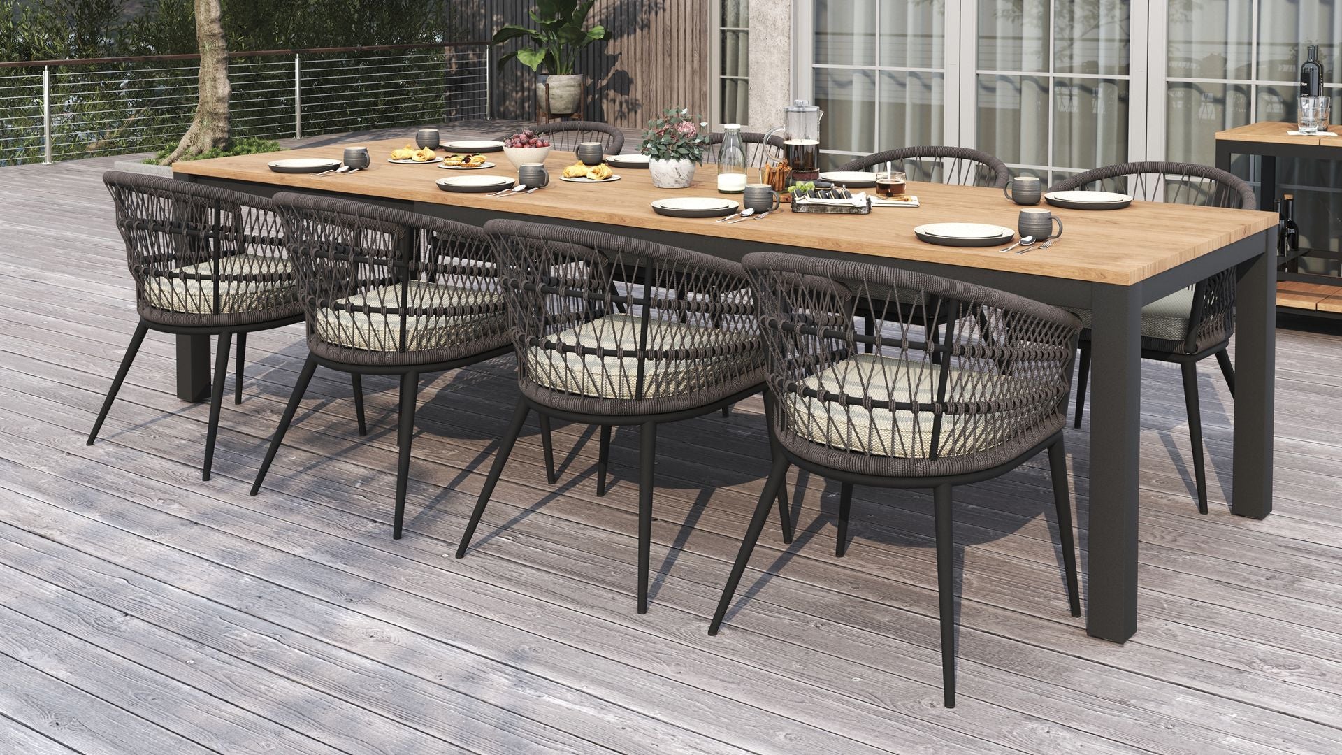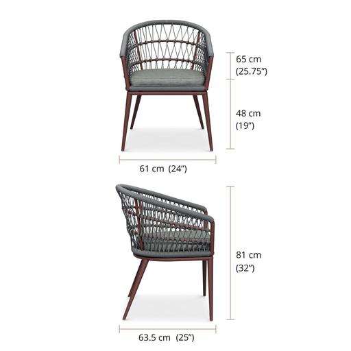 Add a little flair to your alfresco setting with the vino dining chair. Its distinctive criss-cross rope pattern brings textural charm, while the curved armrests and powder-coated aluminium frame deliver long-lasting outdoor comfort. Crafted with UV-protected olefin rope, it stays strong and stylish through the seasons without the need for maintenance. The powder-coated aluminium frame resists rust and fading, making it ideal for coastal or humid environments. A gently contoured backrest and curved arms provide support through long, leisurely meals. Pair it with a removable cushion in premium outdoor fabric for added comfort, sold separately.